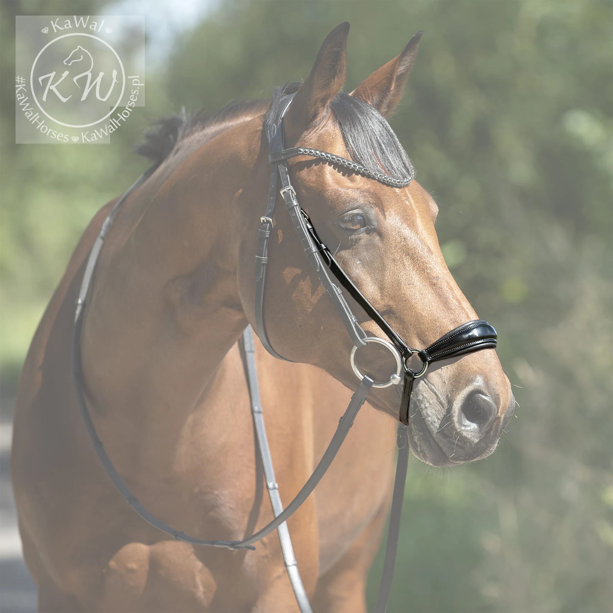 Szeroki (4,5cm), czarny, miękko podszyty czarną skórą, lakierowany nachrapnik szwedzki. Nachrapnik jest w pełni symetryczny i posiada profilowanie w górnej części.