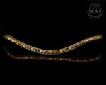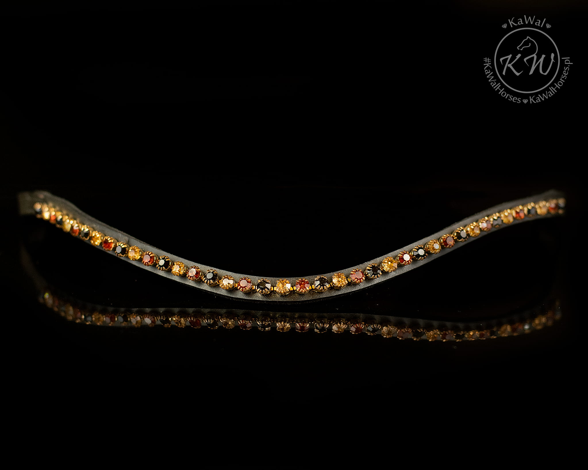 Delikatny, cienko podszyty czarną skórą naczółek z bardzo kryształkami w kolorach czarnym, bursztynowym oraz beżowym, umieszczone w złotych oprawkach.