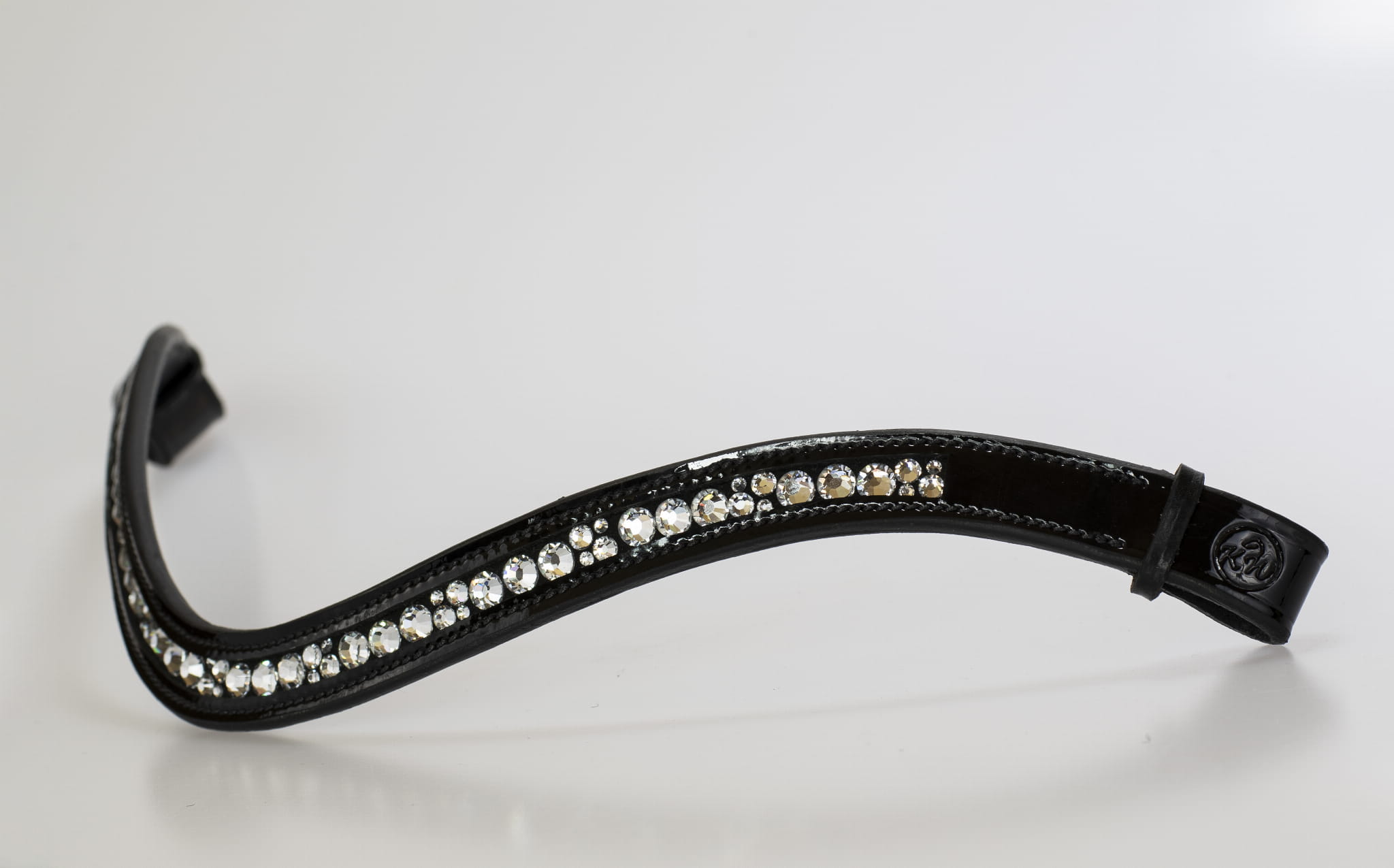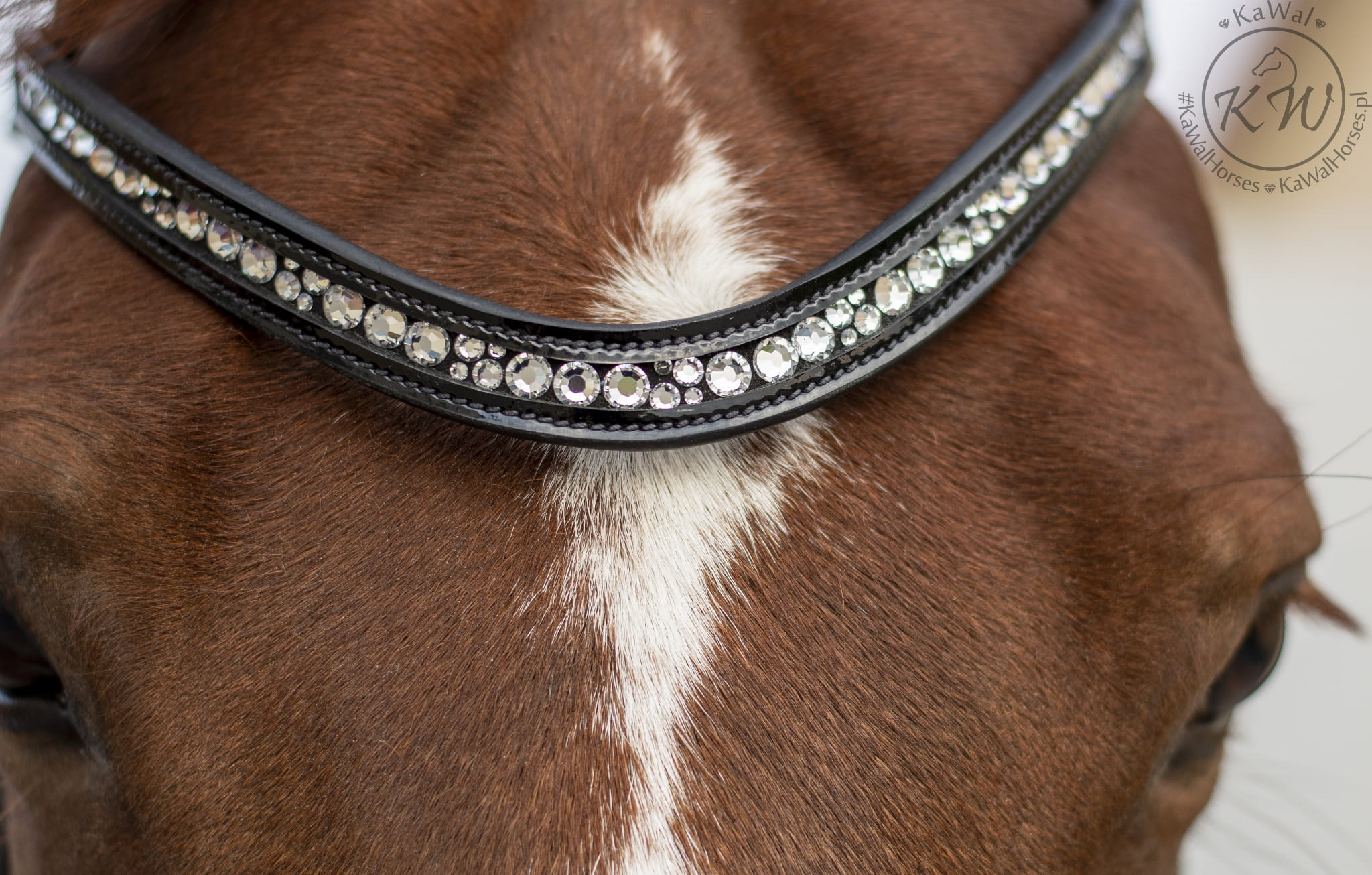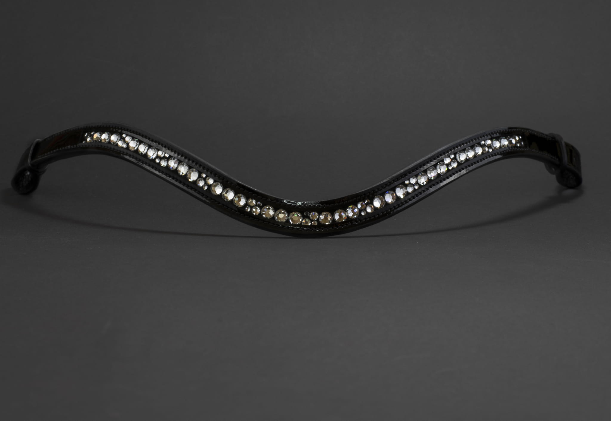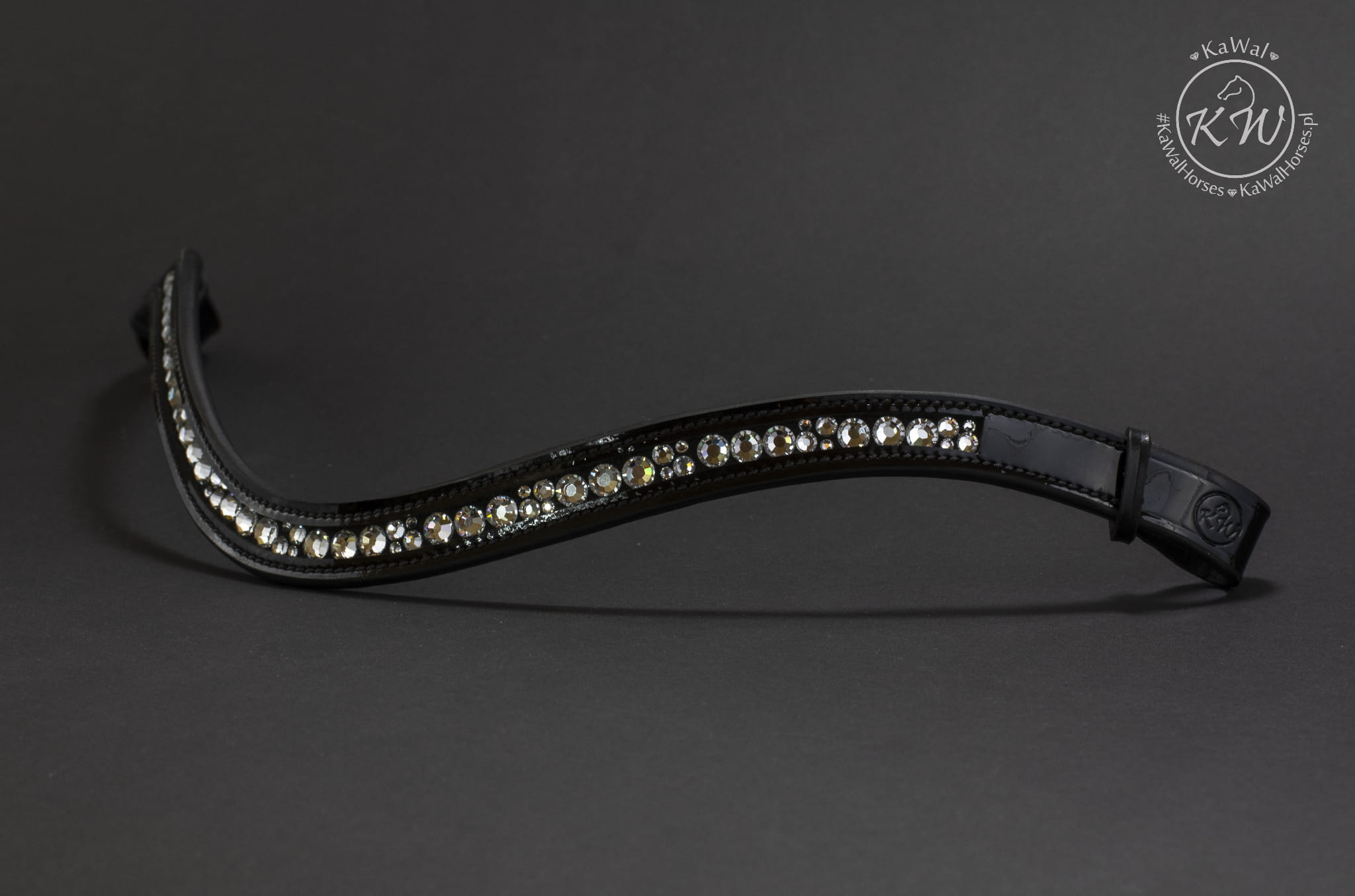 Opadający blingowy, lakierowany naczółek podszyty czarną skórą i ozdobiony kryształkami różnej wielkości,w kolorze srebrnym. Bardzo mocno mieni się w słońcu, a jednocześnie, dzięki sposobie mocowania kryształków, wyróżnia się trwałością.