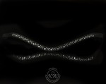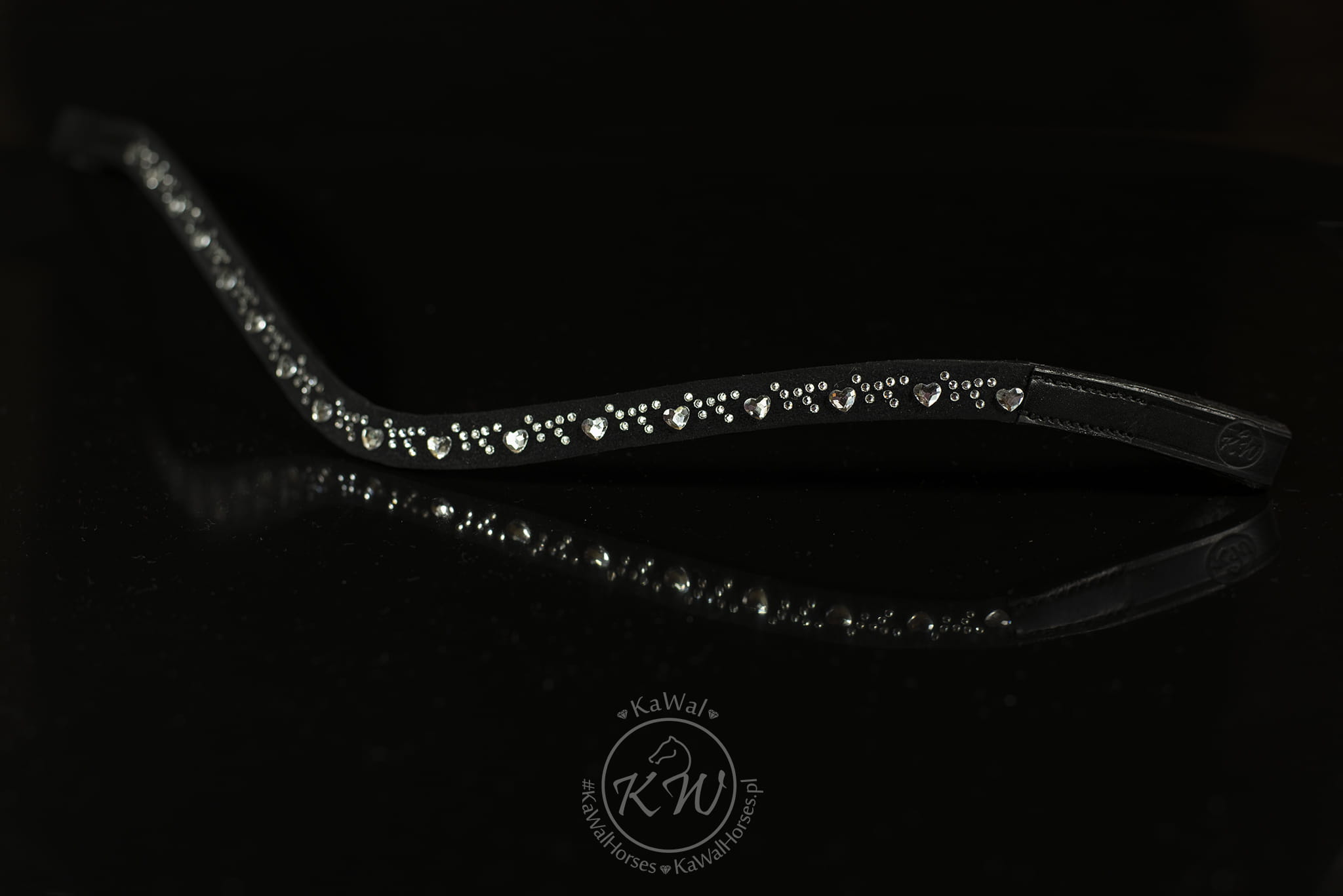 Piękny, bardzo subtelny, cienko podszyty czarną skórą, opadający naczółek ozdobiony umieszczonymi na taśmie nośnej, delikatnie wypukłymi kryształkami bez oprawek, w kształcie serduszek oraz małymi, okrągłymi.