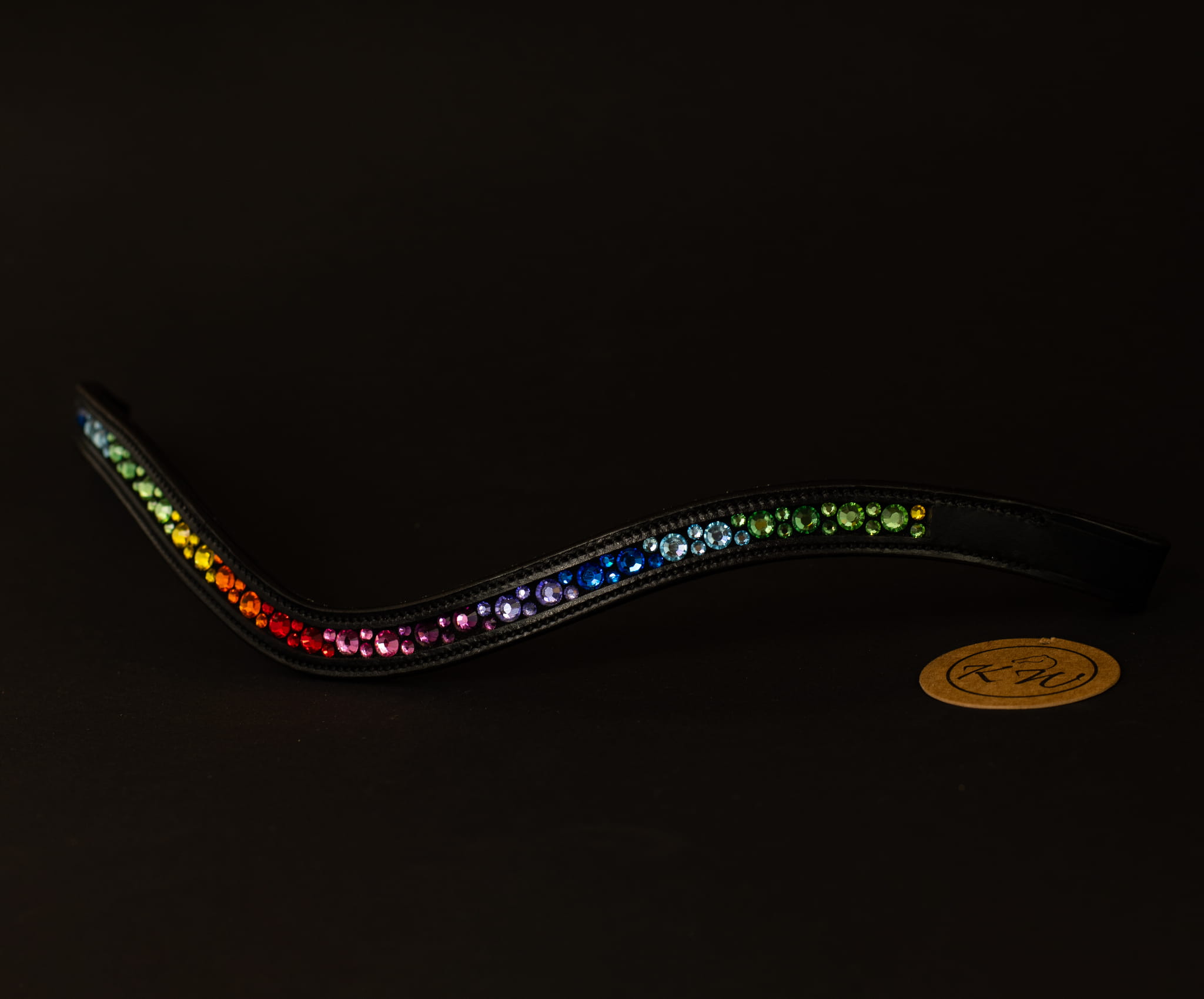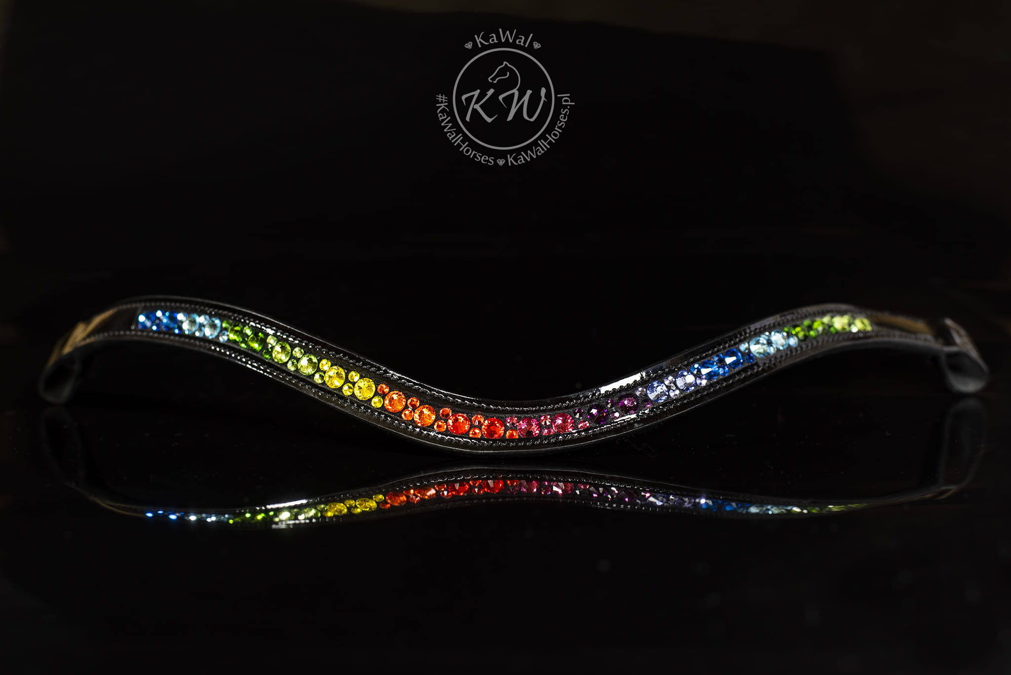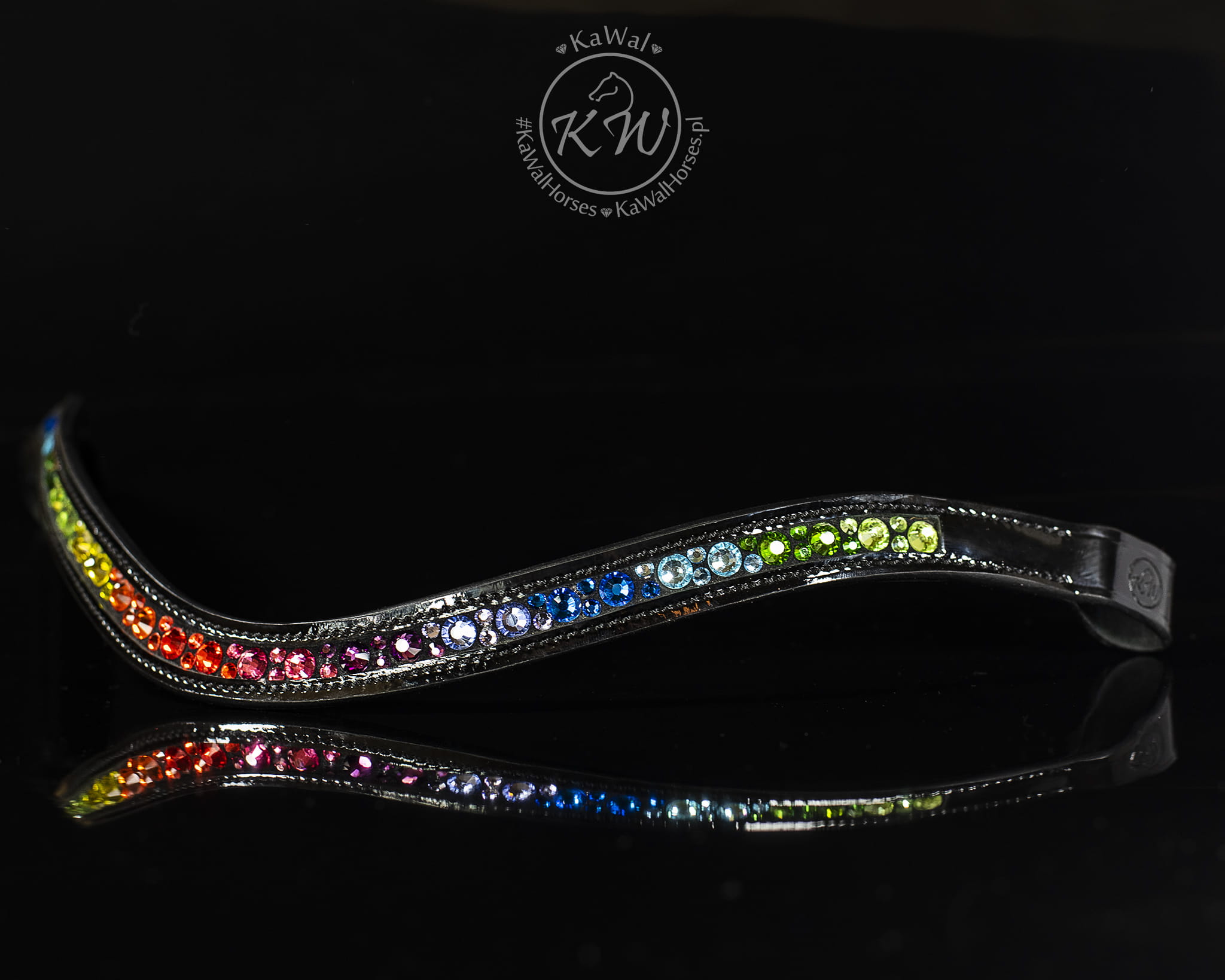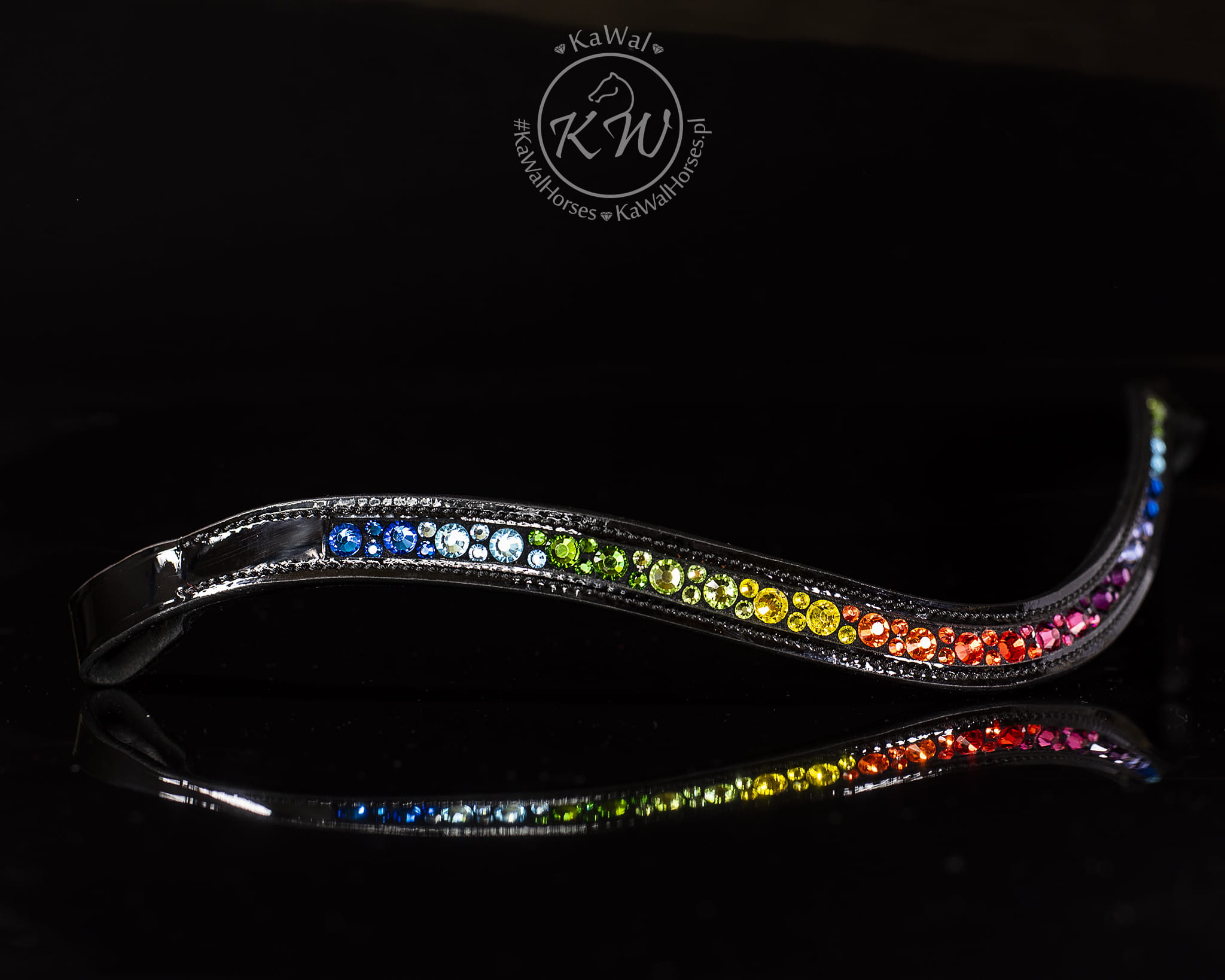 Oryginalny,podszyty czarną skórą, opadający, lakierowany naczółek ozdobiony wieloma kryształkami w kolorach tęczy, bez oprawek. Naczółek bardzo mocno mieni się w słońcu, a jednocześnie, dzięki sposobie mocowania kryształków, wyróżnia się trwałością.