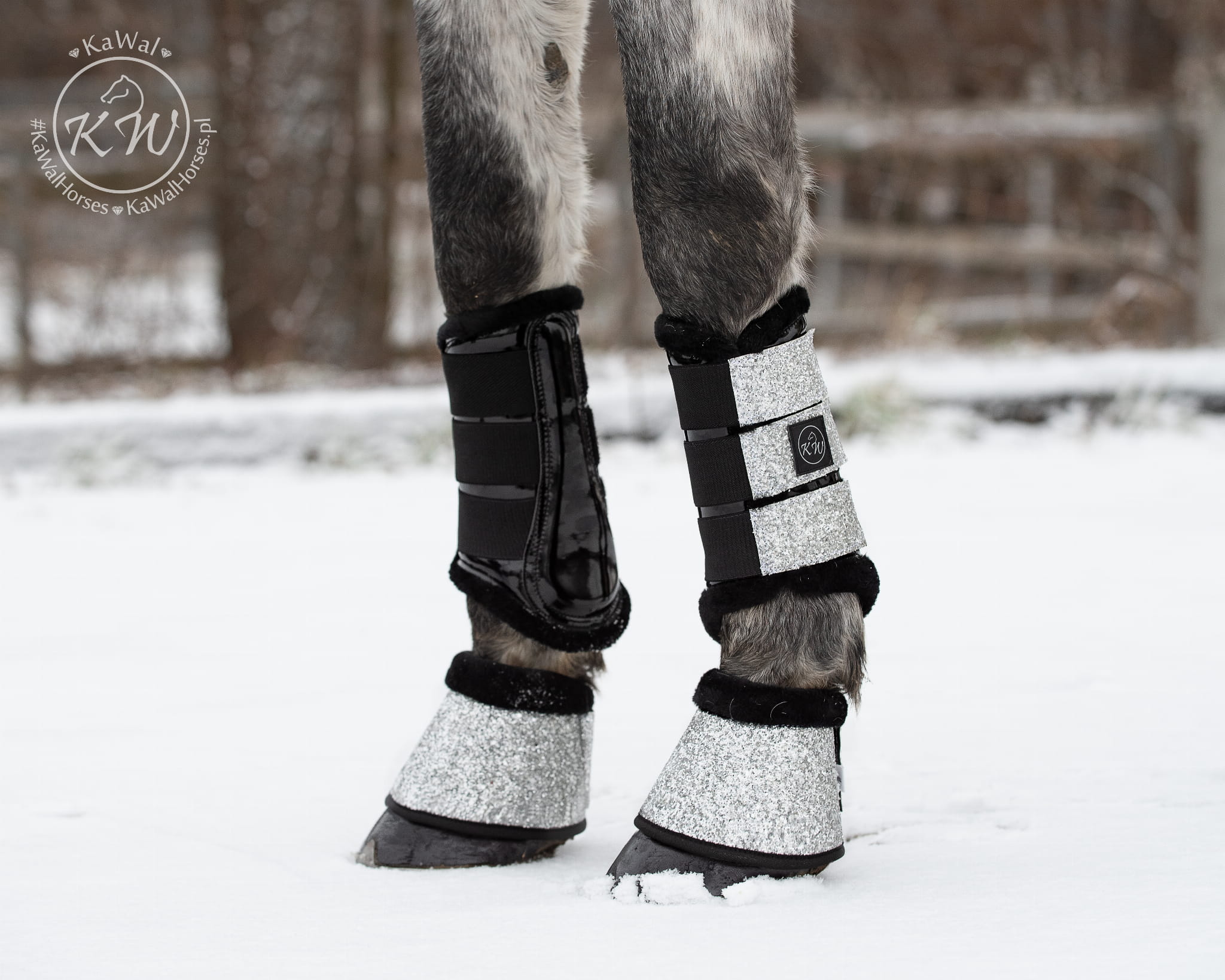 Piękne, białe, lakierowane ochraniacze, zapinane na trzy mocne rzepy ozdobione srebrnym brokatem Wykończone miękkim, gęstym, syntetycznym futerkiem w kolorze czarnym. Amortyzują uderzenia, chronią nogi, zapobiegają otarciom.