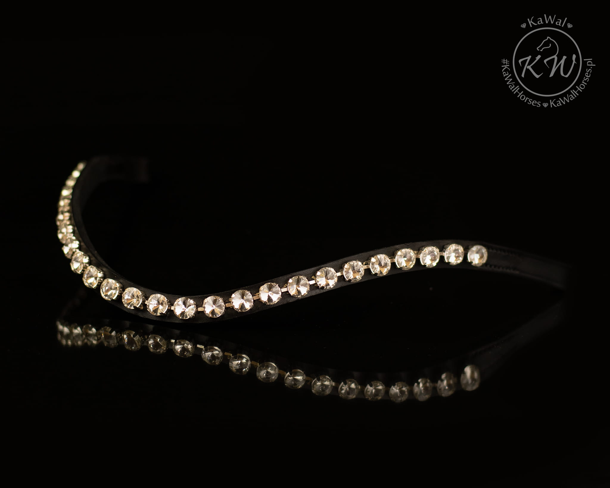 Delikatne, rurkowe, czarne ogłowie z opadającym naczółkiem ozdobionym dużymi białymi kryształkami oraz szerokim,lakierowanym nachrapnikiem. Profilowany nagłówek i nachrapnik zostały miękko podszyte białą skórą.