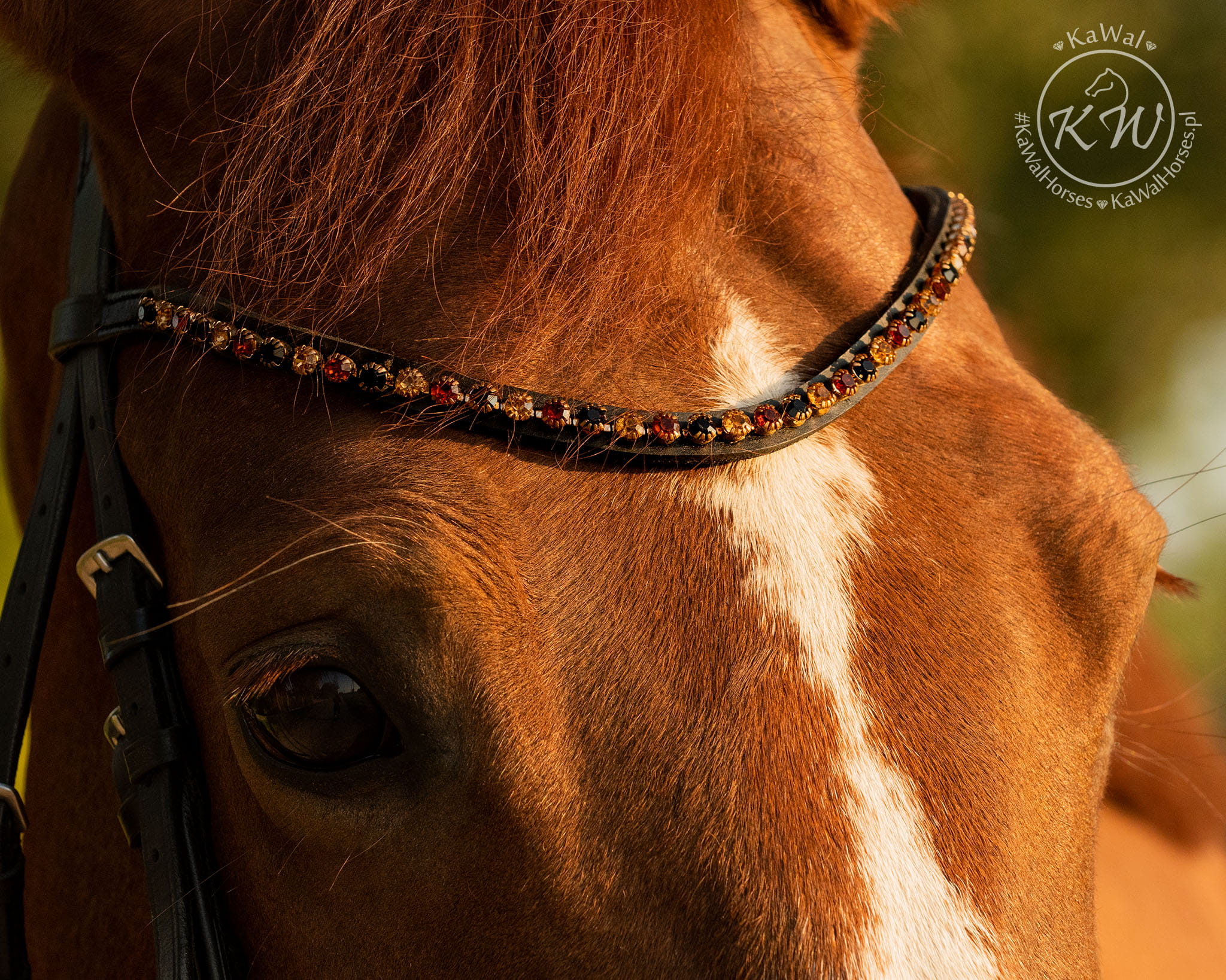 Piękne, lakierowane, nierurkowe ogłowie z matowym nachrapnikiem szwedzkim w kolorze czarnym, z delikatnym naczółkiem ozdobionym kryształami w kolorze złotym, bursztynowym oraz czarnym, w złotych oprawkach. Nagłówek oraz nachrapnik wypełnione zostały pianką memory oraz miękko podszyte skórą w kolorze czarnym.