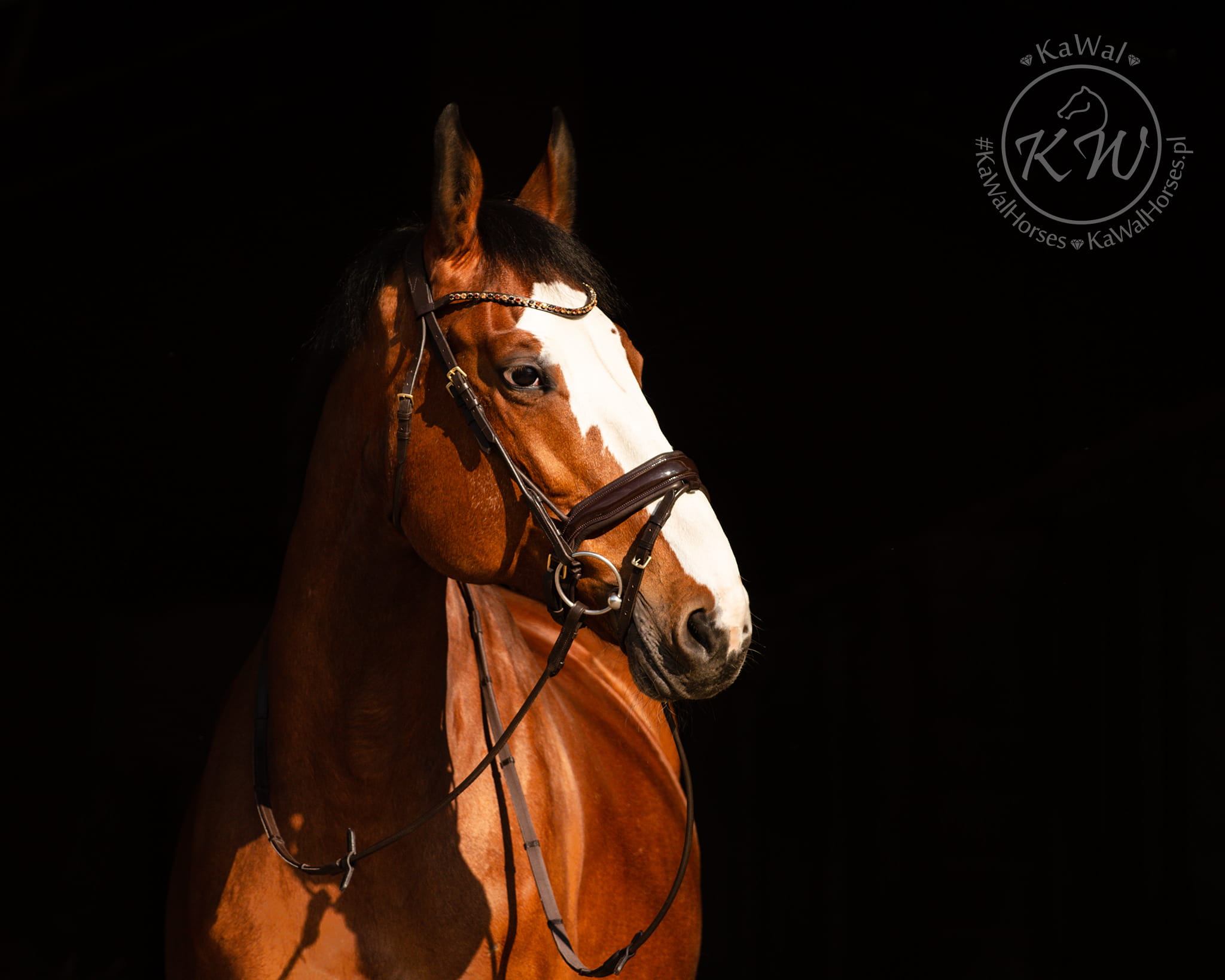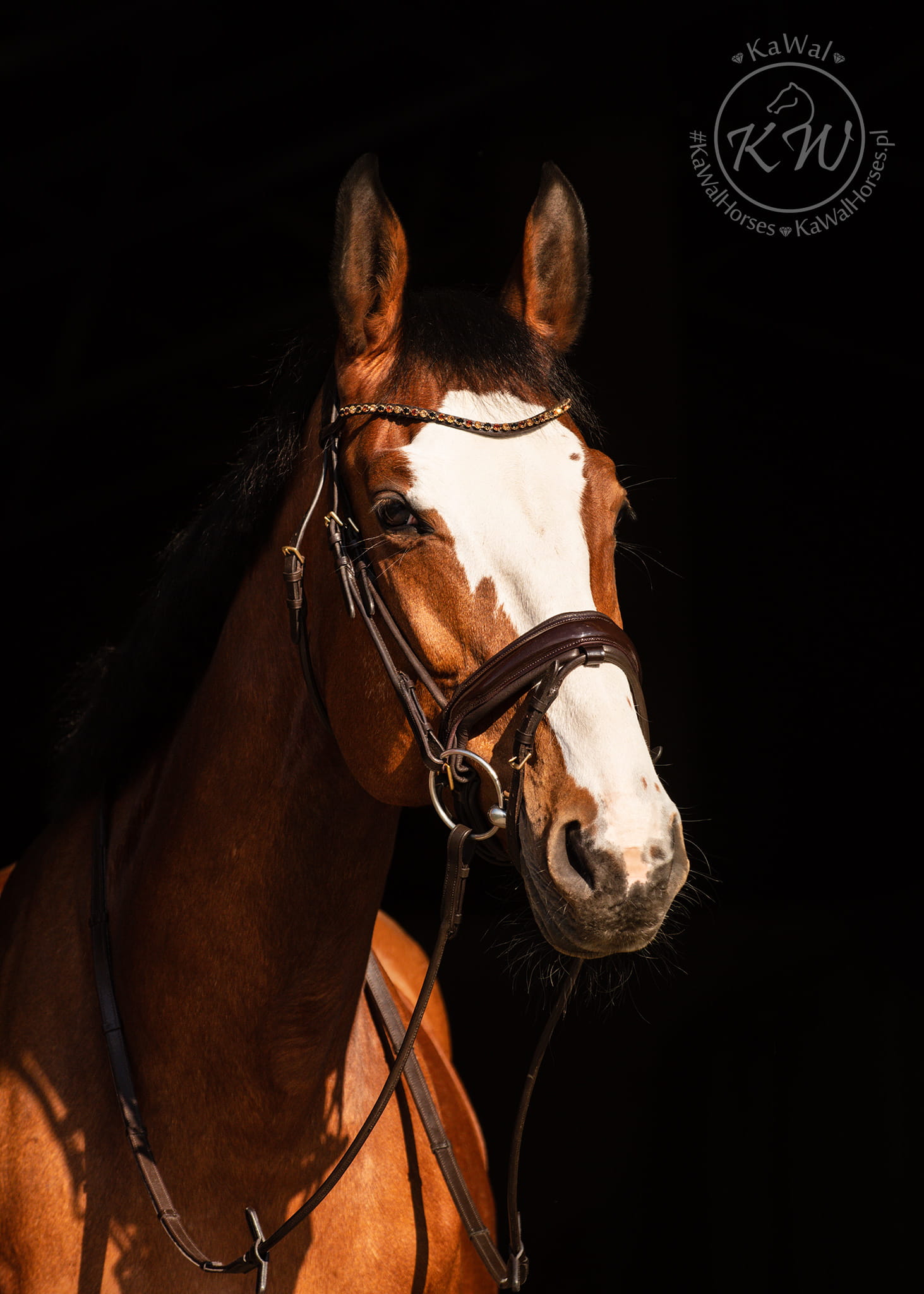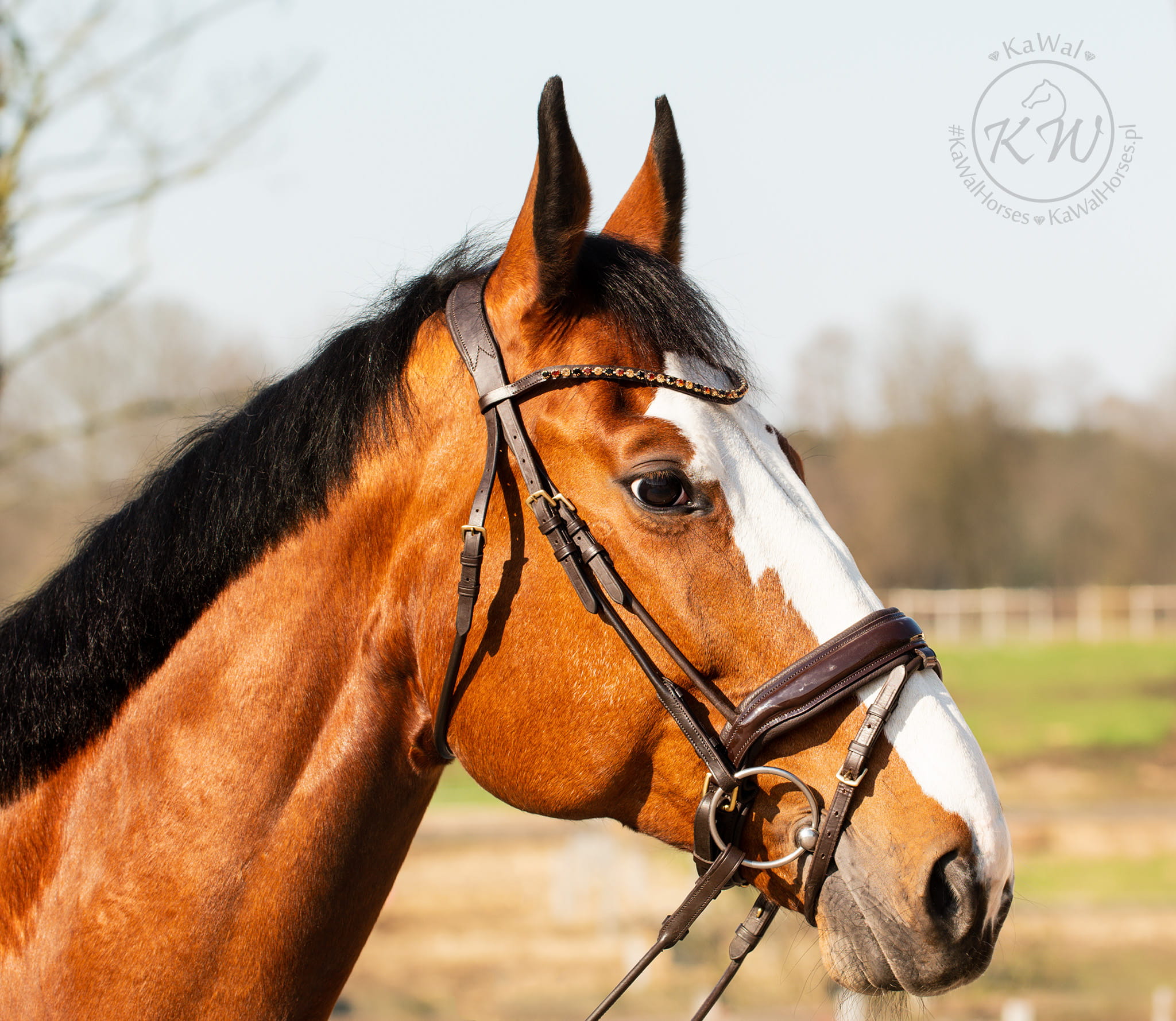 Piękne, lakierowane, rurkowe ogłowie z nachrapnikiem szwedzkim w kolorze czekoladowego brązu, z delikatnym naczółkiem ozdobionym kryształami w kolorze złotym, bursztynowym oraz czarnym, w złotych oprawkach. Nagłówek oraz nachrapnik wypełnione zostały pianką memory oraz miękko podszyte skórą w kolorze czekoladowym.