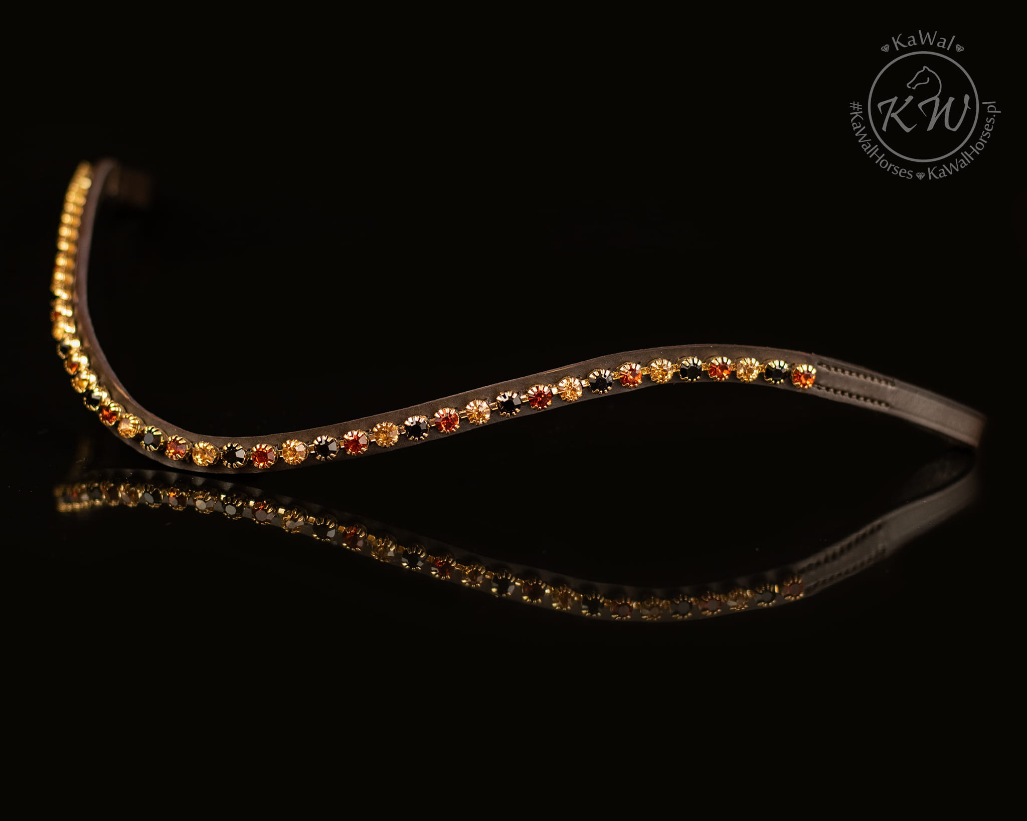 Piękne, lakierowane, rurkowe ogłowie z nachrapnikiem szwedzkim w kolorze czekoladowego brązu, z delikatnym naczółkiem ozdobionym kryształami w kolorze złotym, bursztynowym oraz czarnym, w złotych oprawkach.