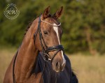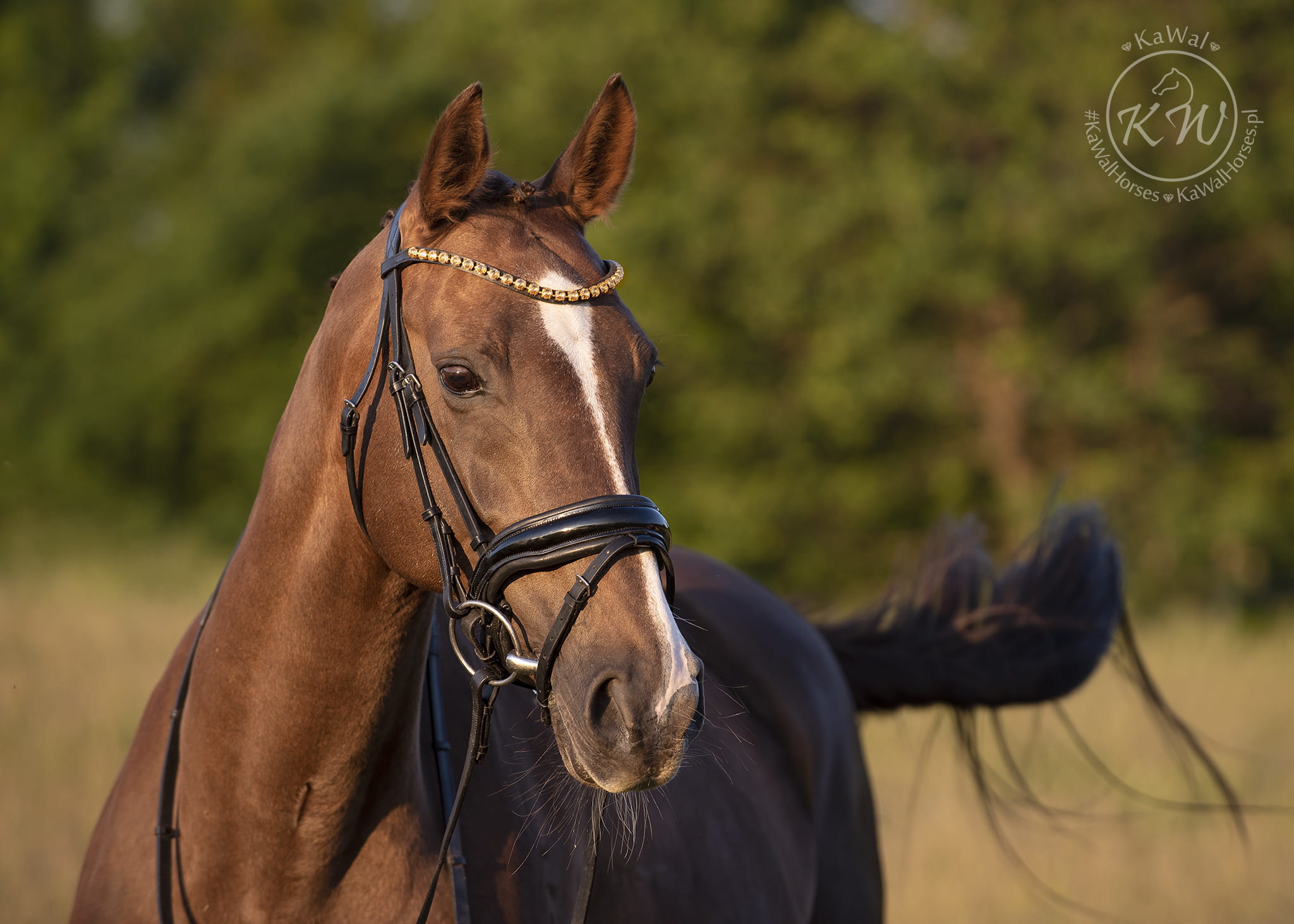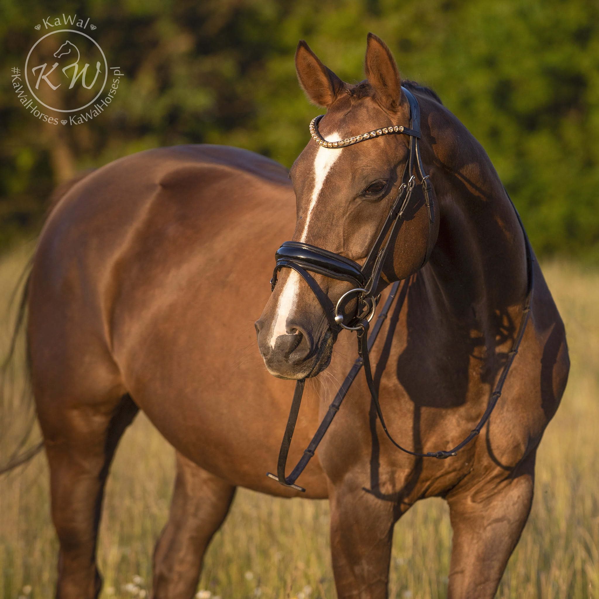 Czarne ogłowie z szerokim, lakierowanym nachrapnikiem szwedzkim, miękko podszytym skórą w kolorze czarnym oraz opadającym naczółkiem ozdobionym dużymi kryształkami w złotych oprawkach, o delikatnym, złotym zabarwieniu. Anatomiczna, profilowana potylica posiada miękkie podszycie z czarnej skóry.