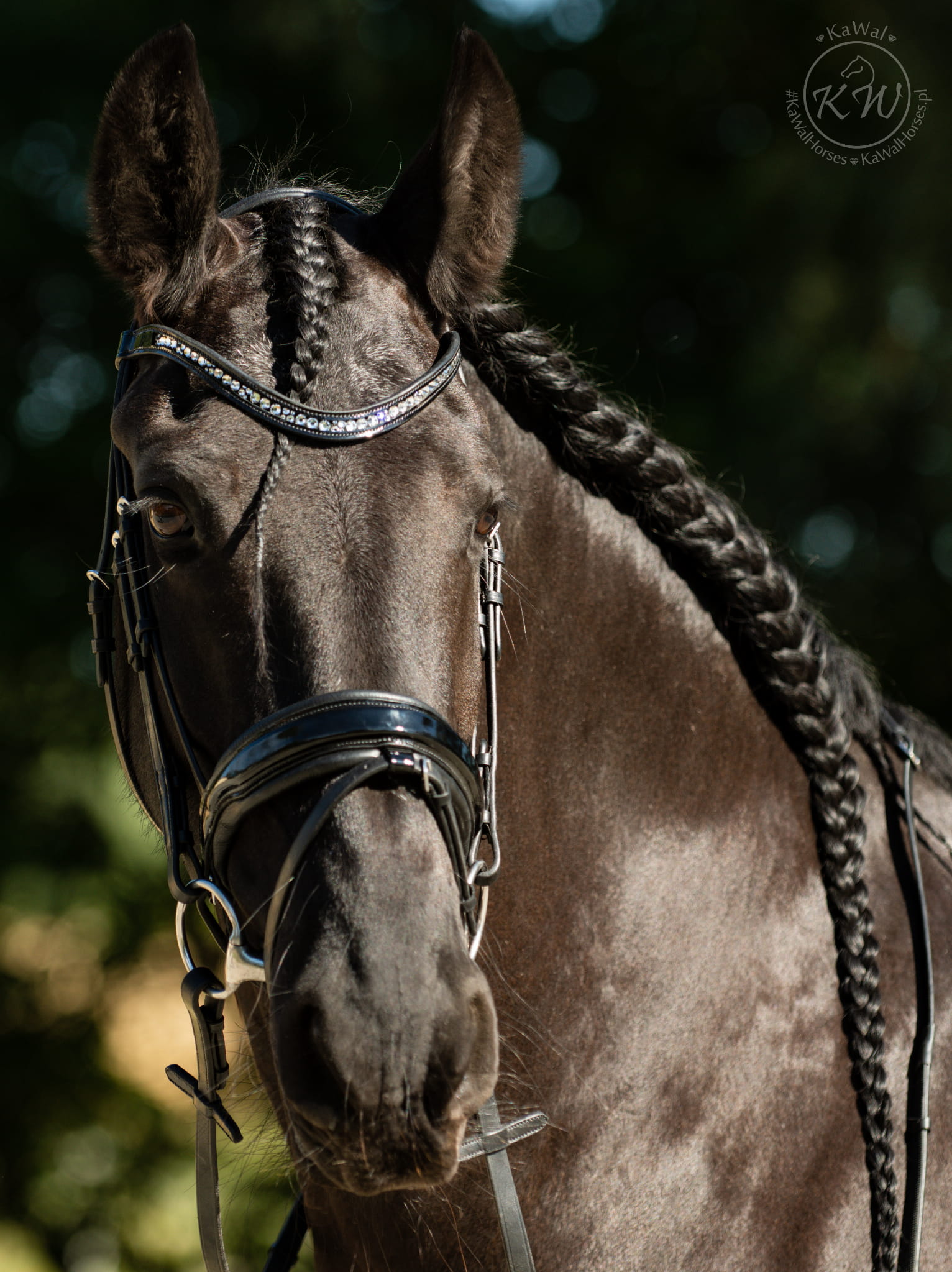 Czarne ogłowie z szerokim, lakierowanym nachrapnikiem szwedzkim, miękko podszytym skórą w kolorze czarnym oraz mocno opadającym, lakierowanym naczółkiem ozdobionym dużymi srebrnymi kryształkami bez oprawek. Anatomiczna, profilowana potylica posiada miękkie podszycie z czarnej skóry.