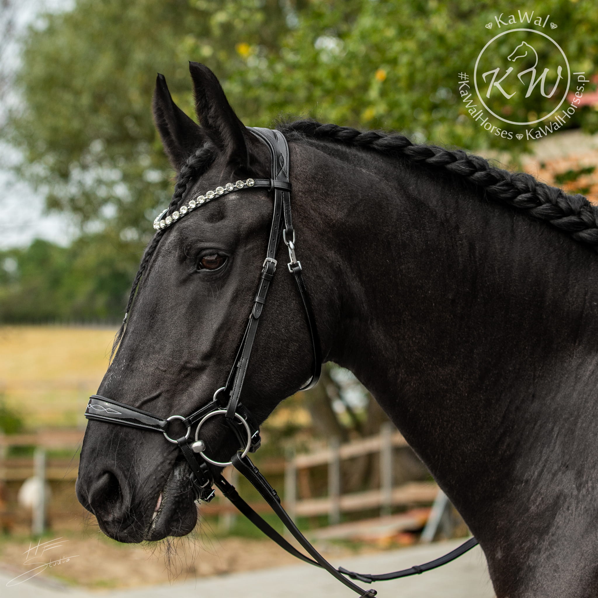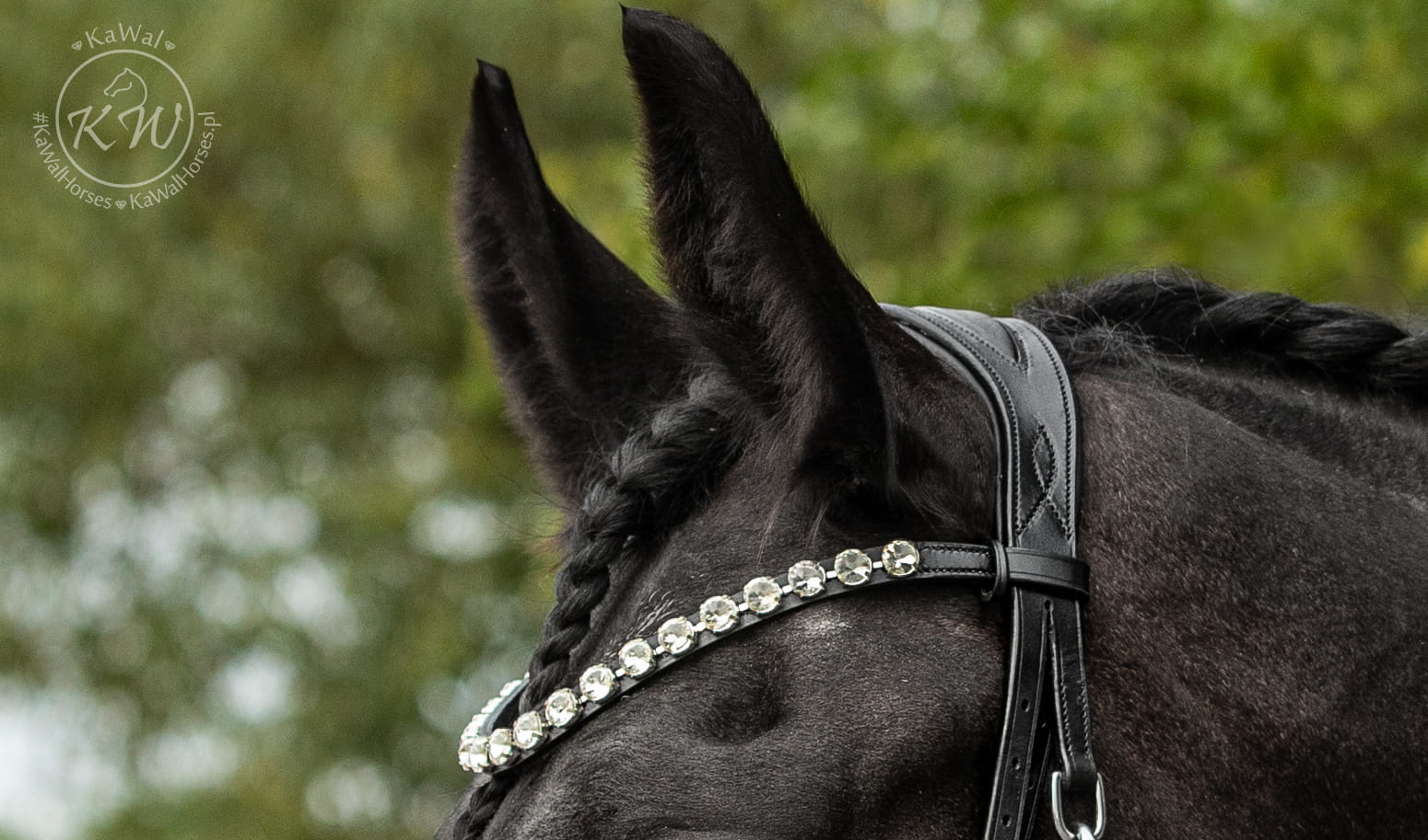 Czarne ogłowie z miękką, profilowaną, anatomiczną potylicą podszytą skórą w kolorze czarnym oraz z lakierowanym, anatomicznym nachrapnikiem. Całość ozdobiona mocno opadającym naczółkiem ozdobionym dużymi srebrnymi kryształkami. Dodatkowo ogłowie posiada podgardle obustronnie zapinane na snapsy, dzięki czemu można je szybko zapinać lub w razie potrzeby całkowicie wypiąć z ogłowia.