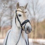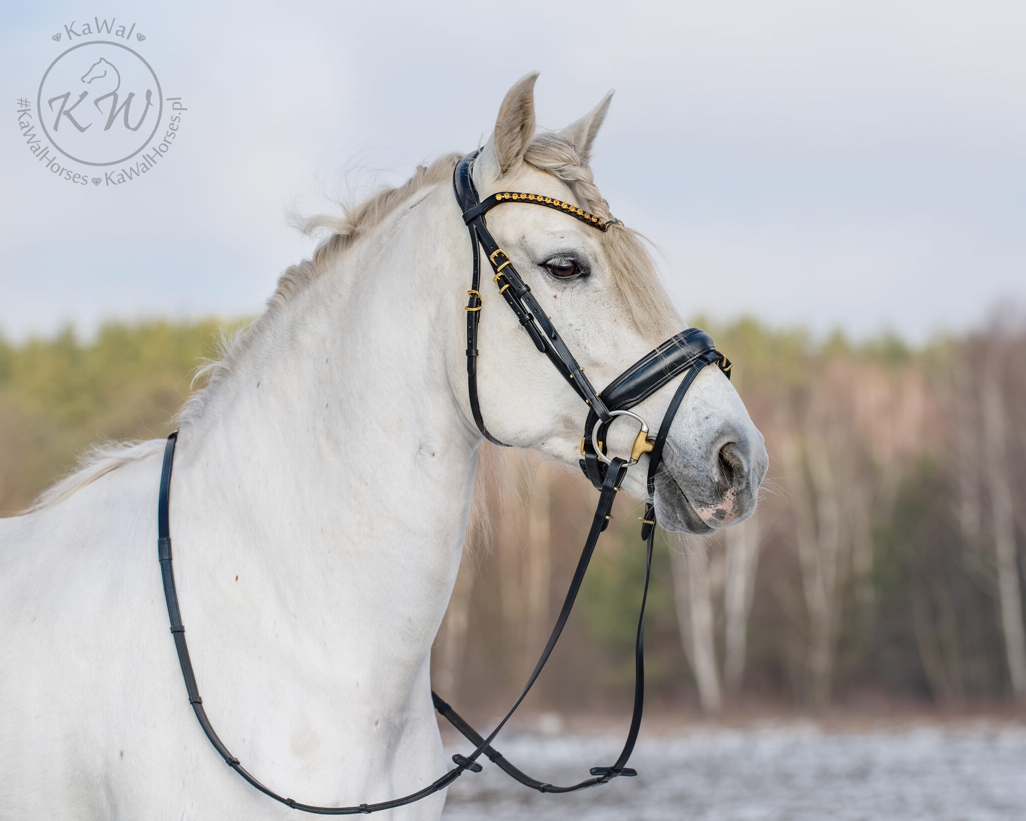 Czarne ogłowie z mocno opadającym naczółkiem ozdobionym jednym rzędem średniej wielkości kryształków w kolorze złotym oraz szerokim, matowym nachrapnikiem szwedzkim. Dodatkowo ogłowie posada ozdobne, złote sprzączki z metalową, złotą szlufką. Profilowany nagłówek i nachrapnik zostały miękko podszyte czarną skórą.