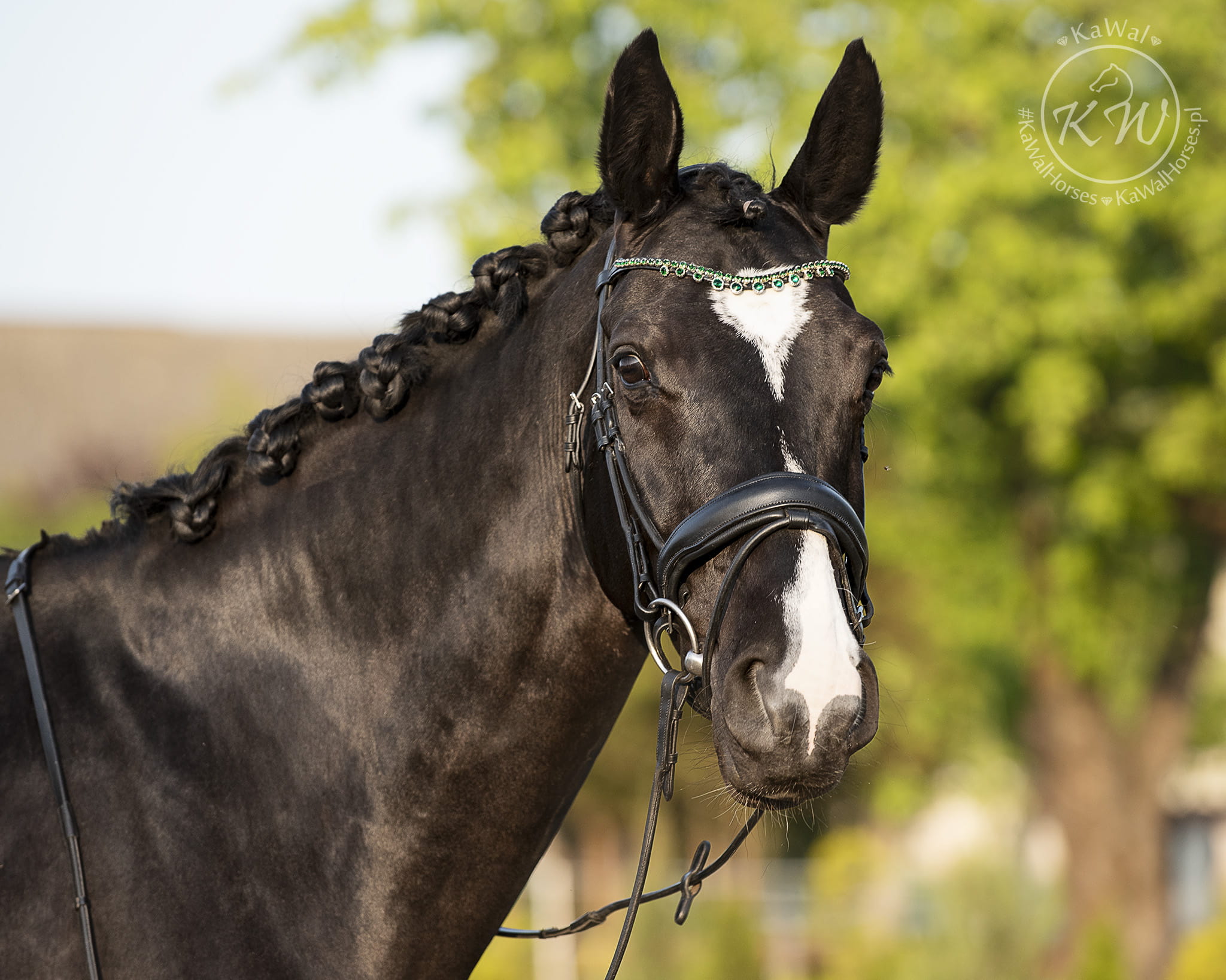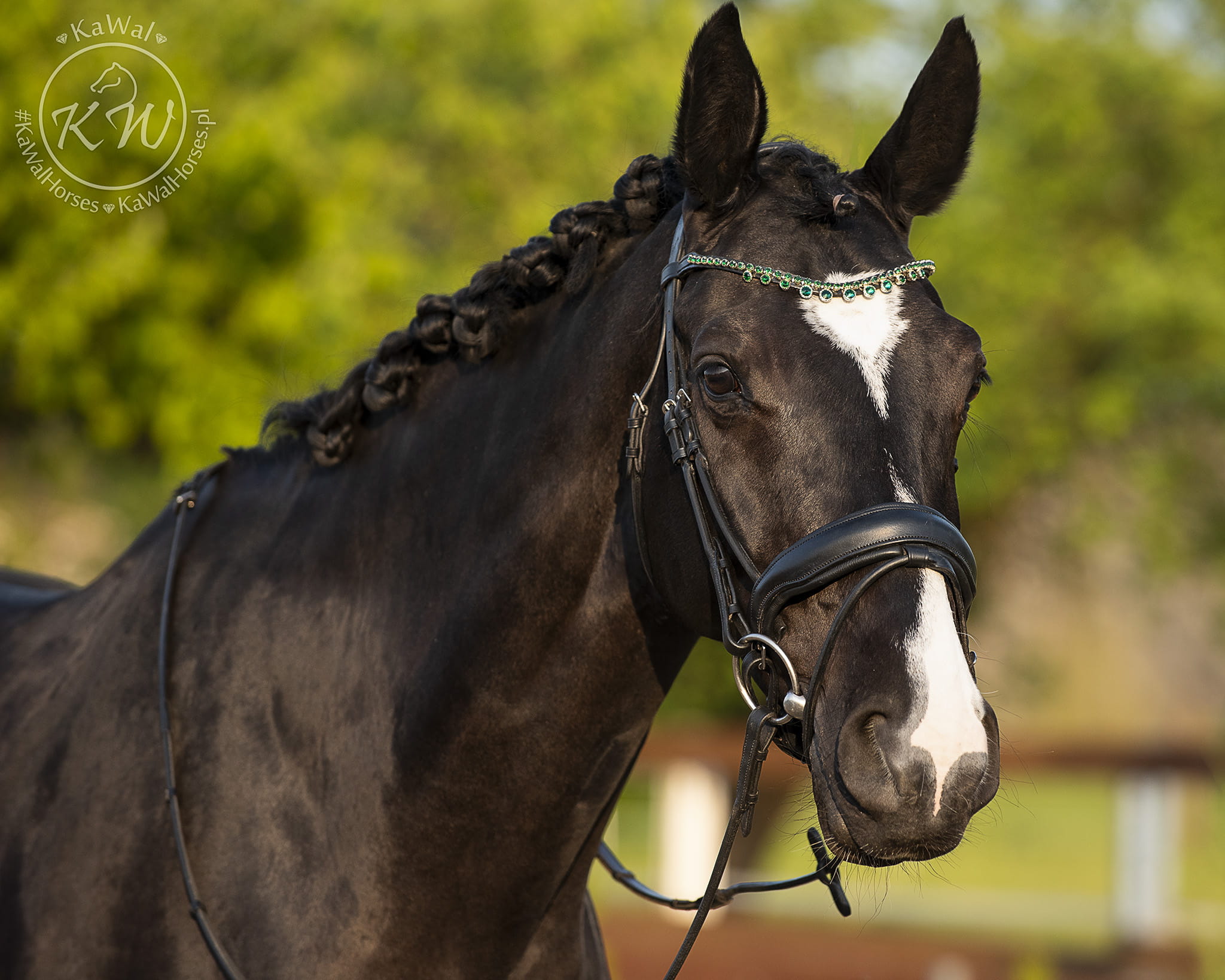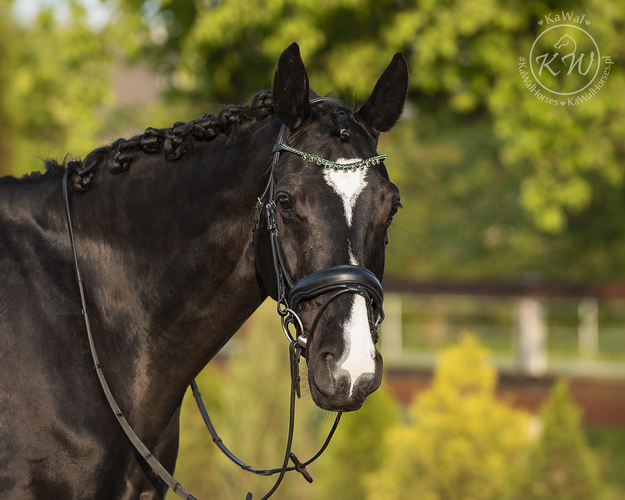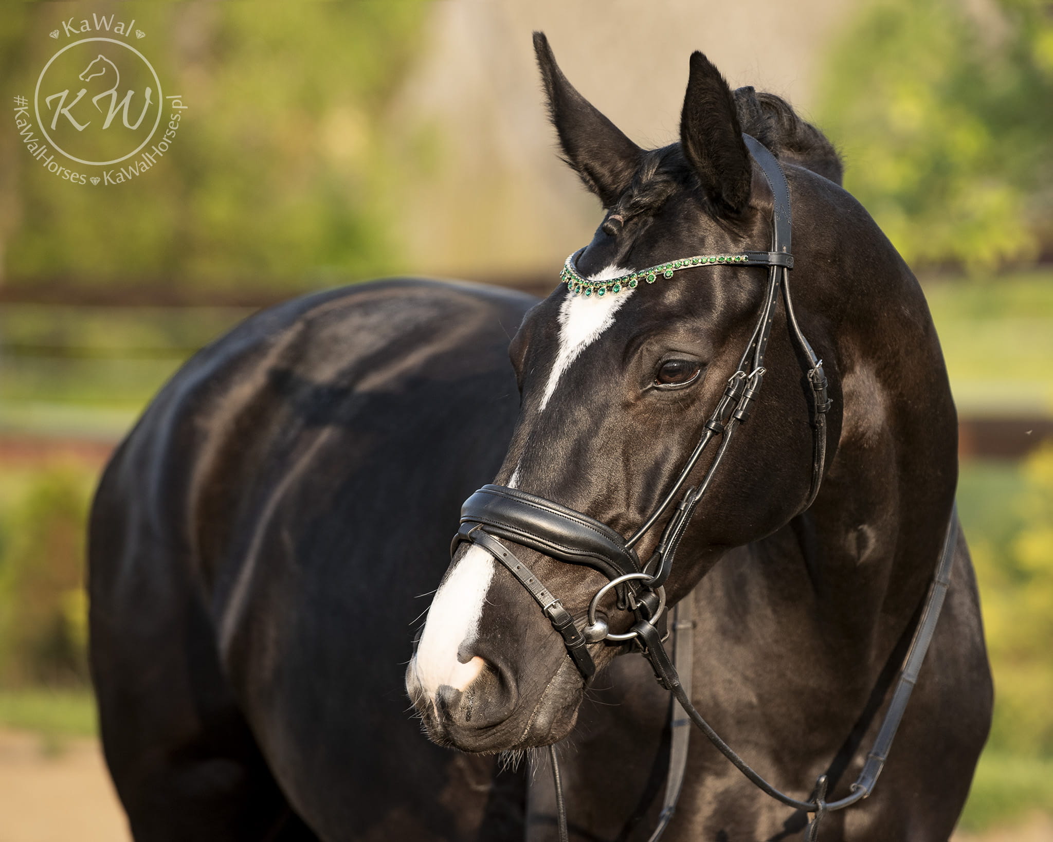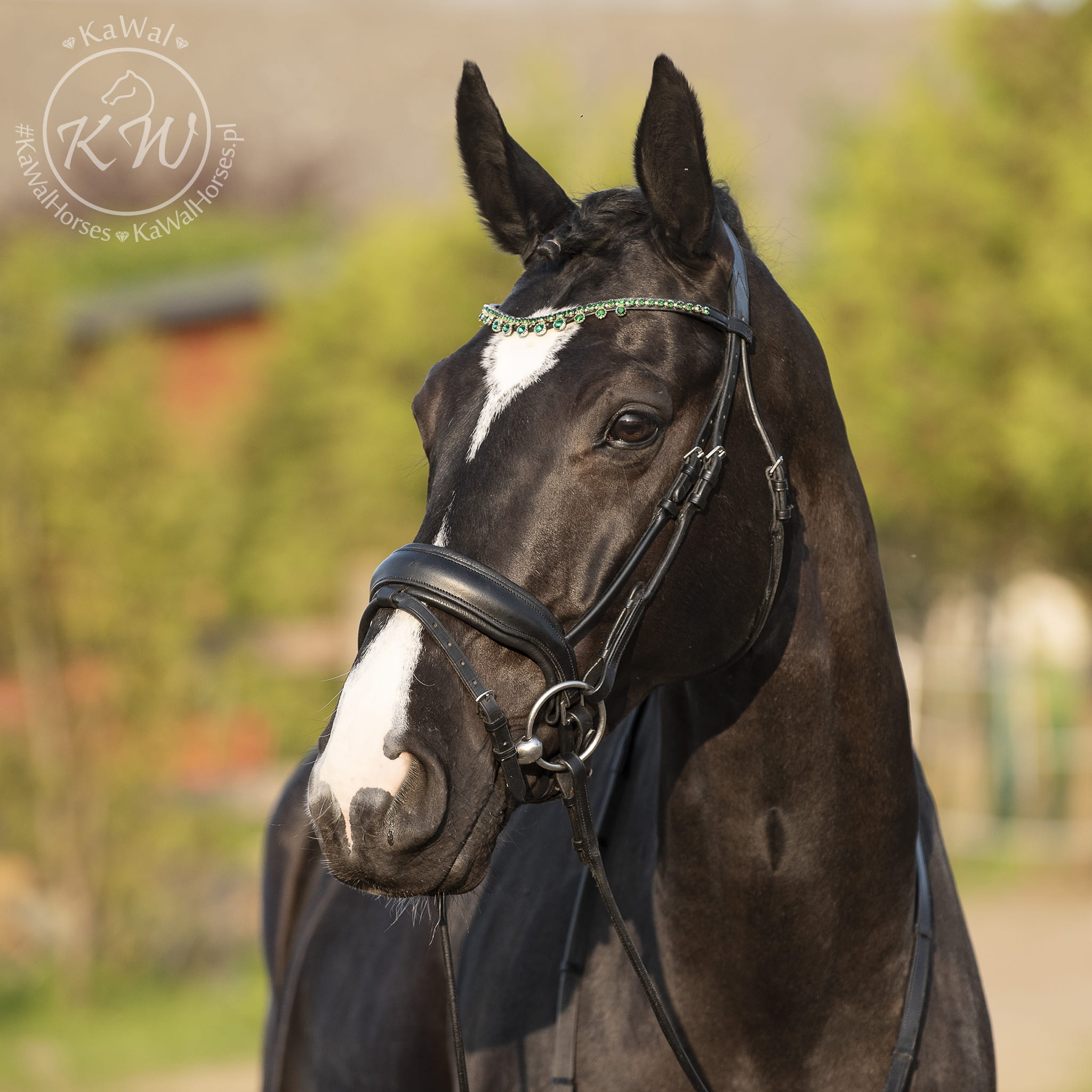 Czarne ogłowie z szerokim, matowym nachrapnikiem szwedzkim, miękko podszytym skórą w kolorze czarnym oraz mocno opadającym naczółkiem ozdobionym kryształkami w kolorze szmaragdowym, oprawione w ozdobne ramki w kolorze srebrnym. Anatomiczna, profilowana potylica posiada miękkie podszycie z czarnej skóry.