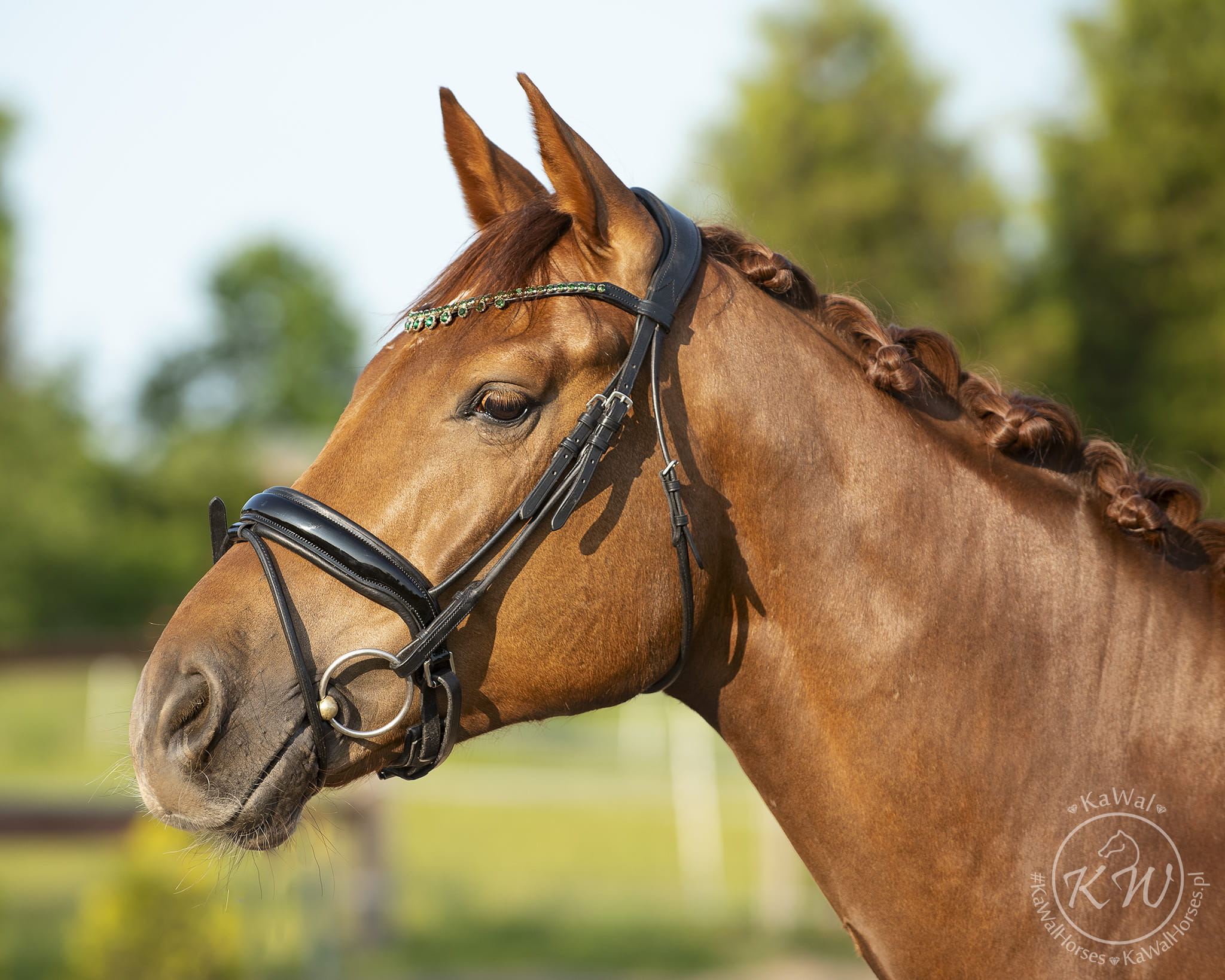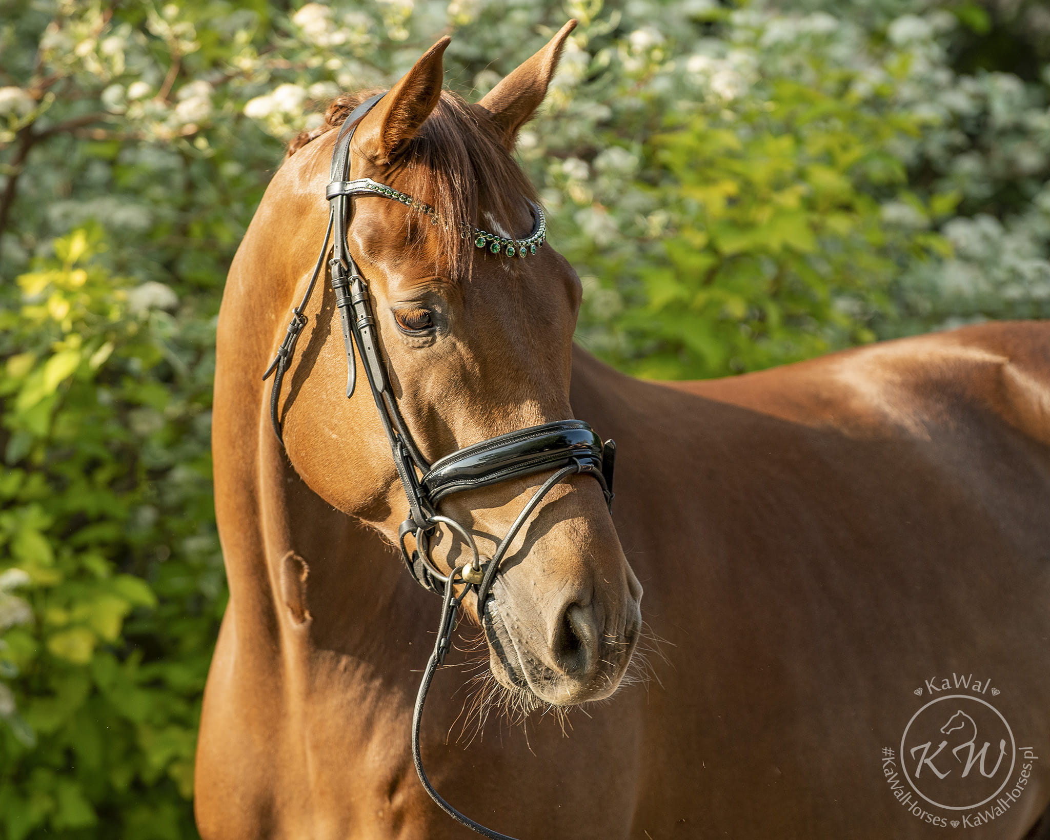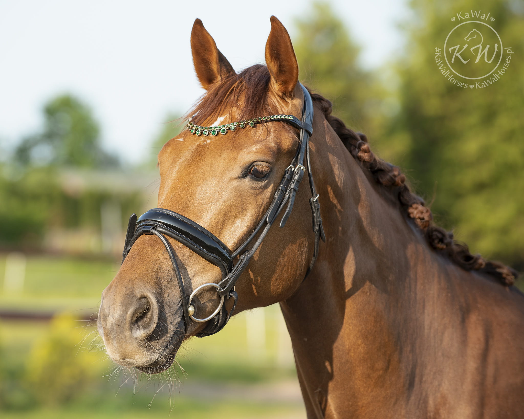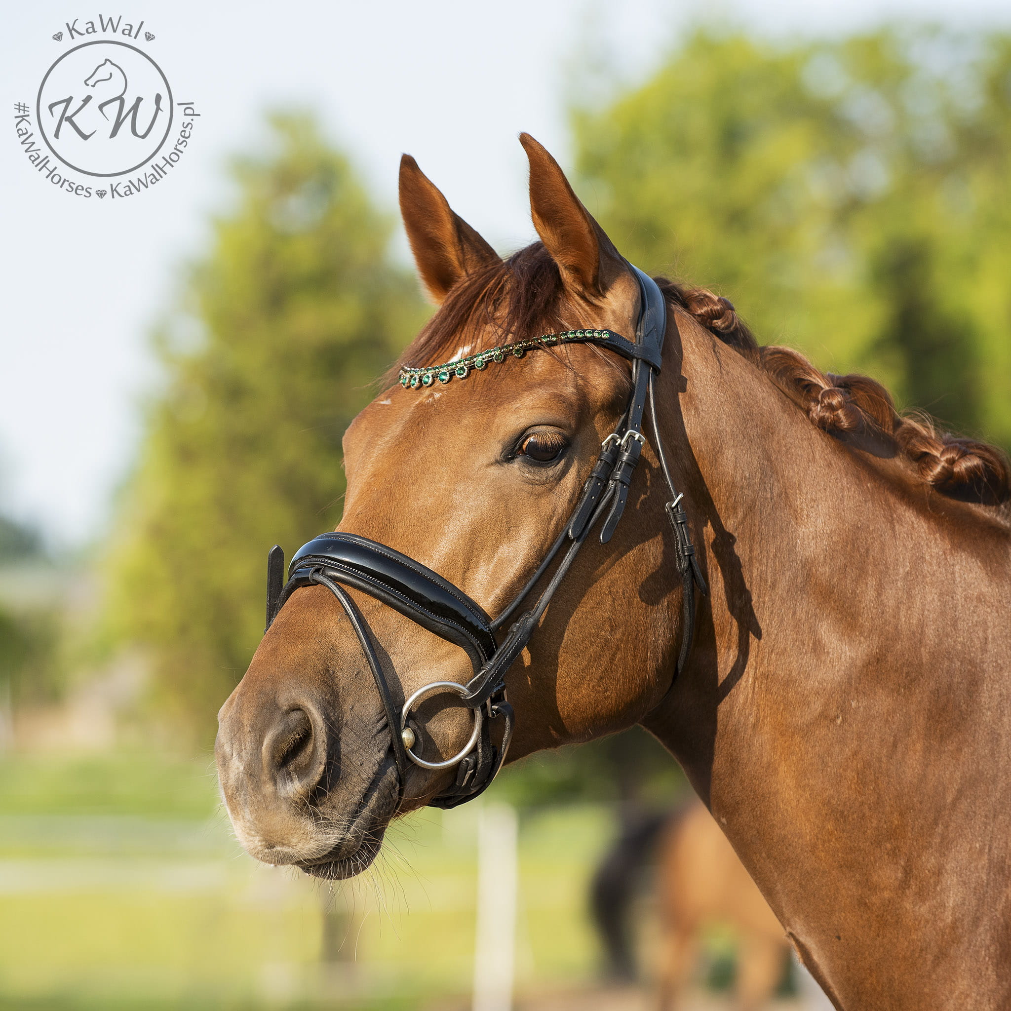 Czarne ogłowie z szerokim, rurkowym, lakierowanym nachrapnikiem szwedzkim, miękko podszytym skórą w kolorze czarnym oraz mocno opadającym naczółkiem ozdobionym kryształkami w kolorze szmaragdowym, oprawione w ozdobne ramki w kolorze srebrnym. Anatomiczna, profilowana potylica posiada miękkie podszycie z czarnej skóry.