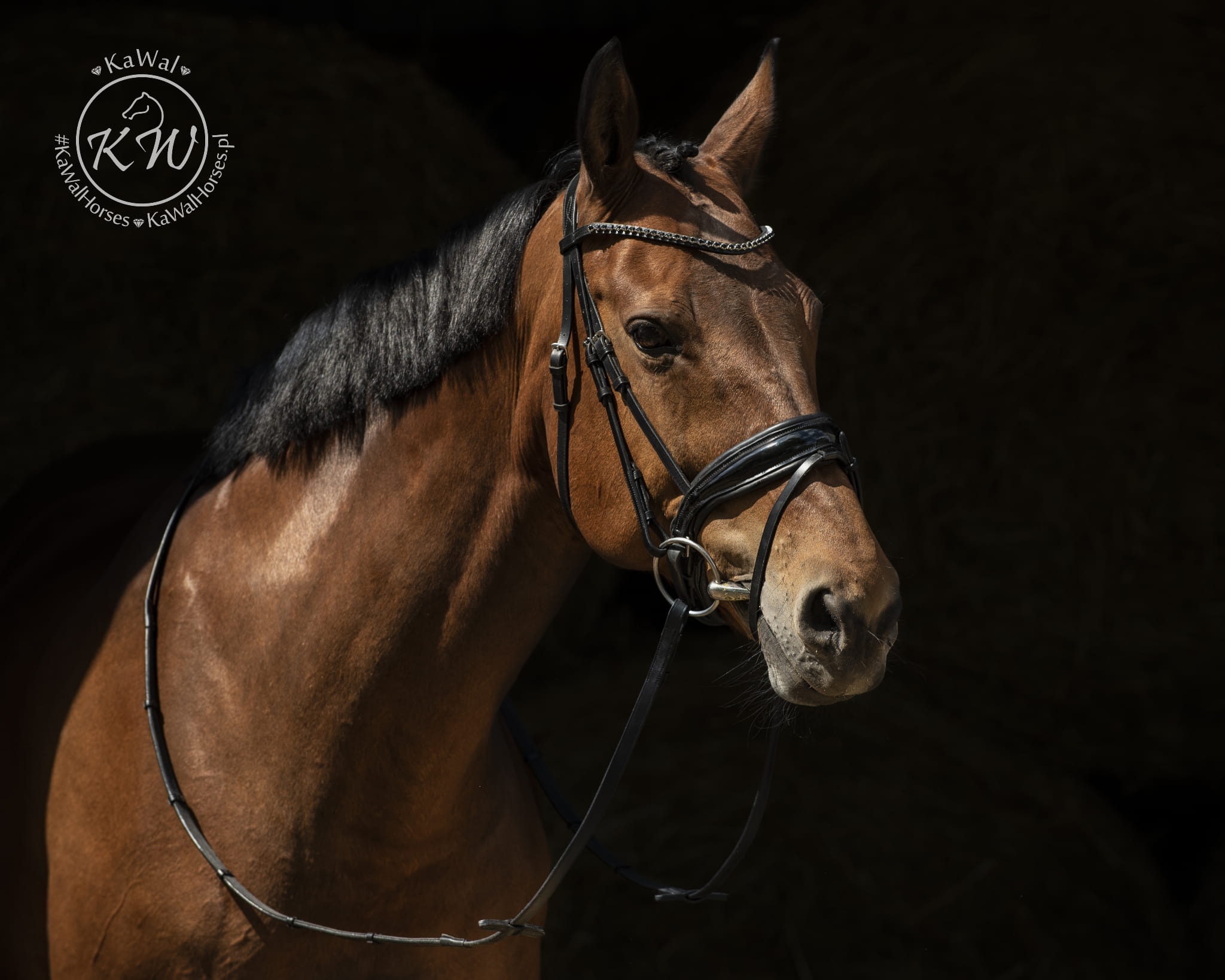Czarne ogłowie z mocno opadającym naczółkiem ozdobionym jednym rzędem kryształków w kolorze czarnym oraz szerokim, lakierowanym nachrapnikiem. Profilowany nagłówek i nachrapnik zostały miękko podszyte czarną skórą.