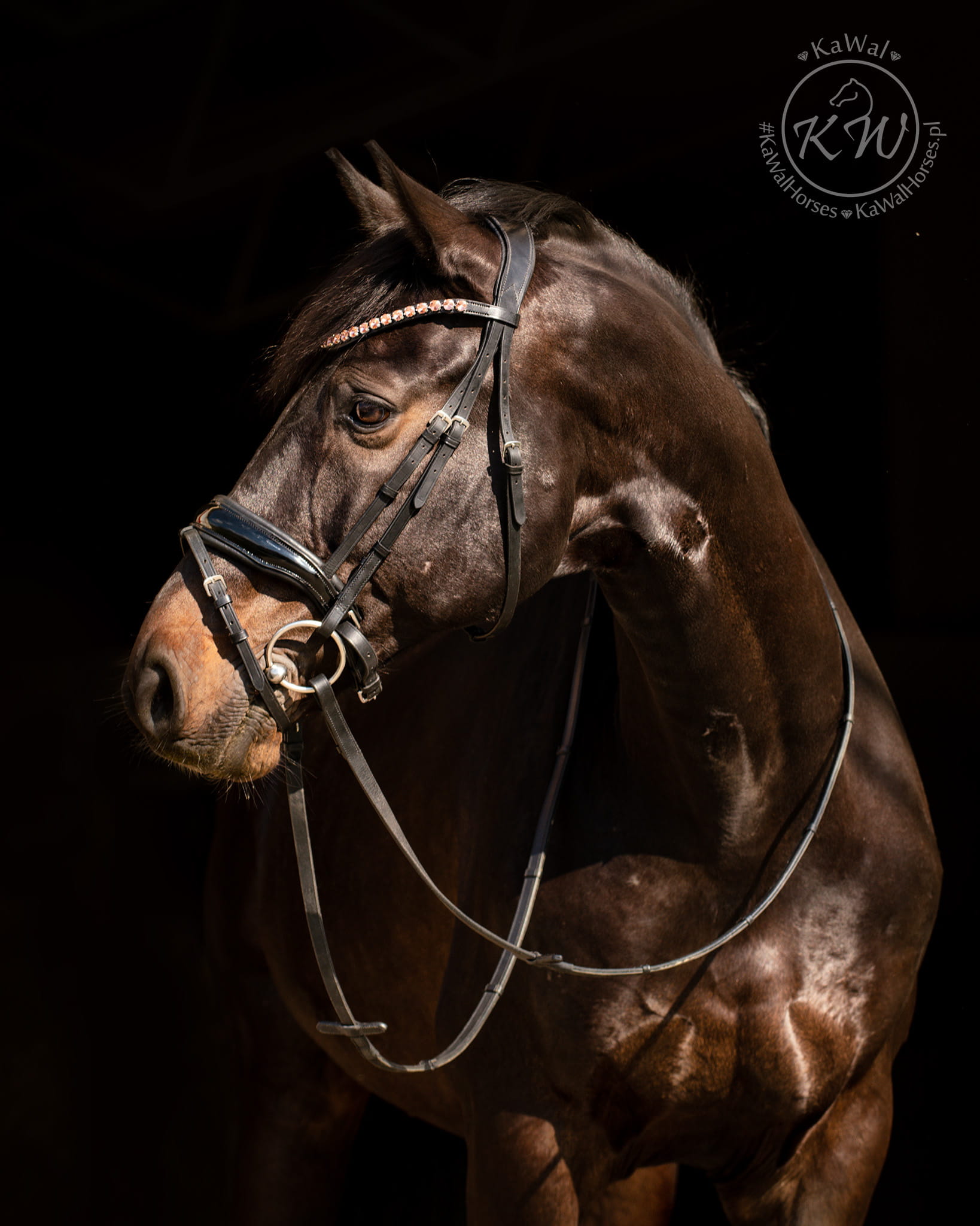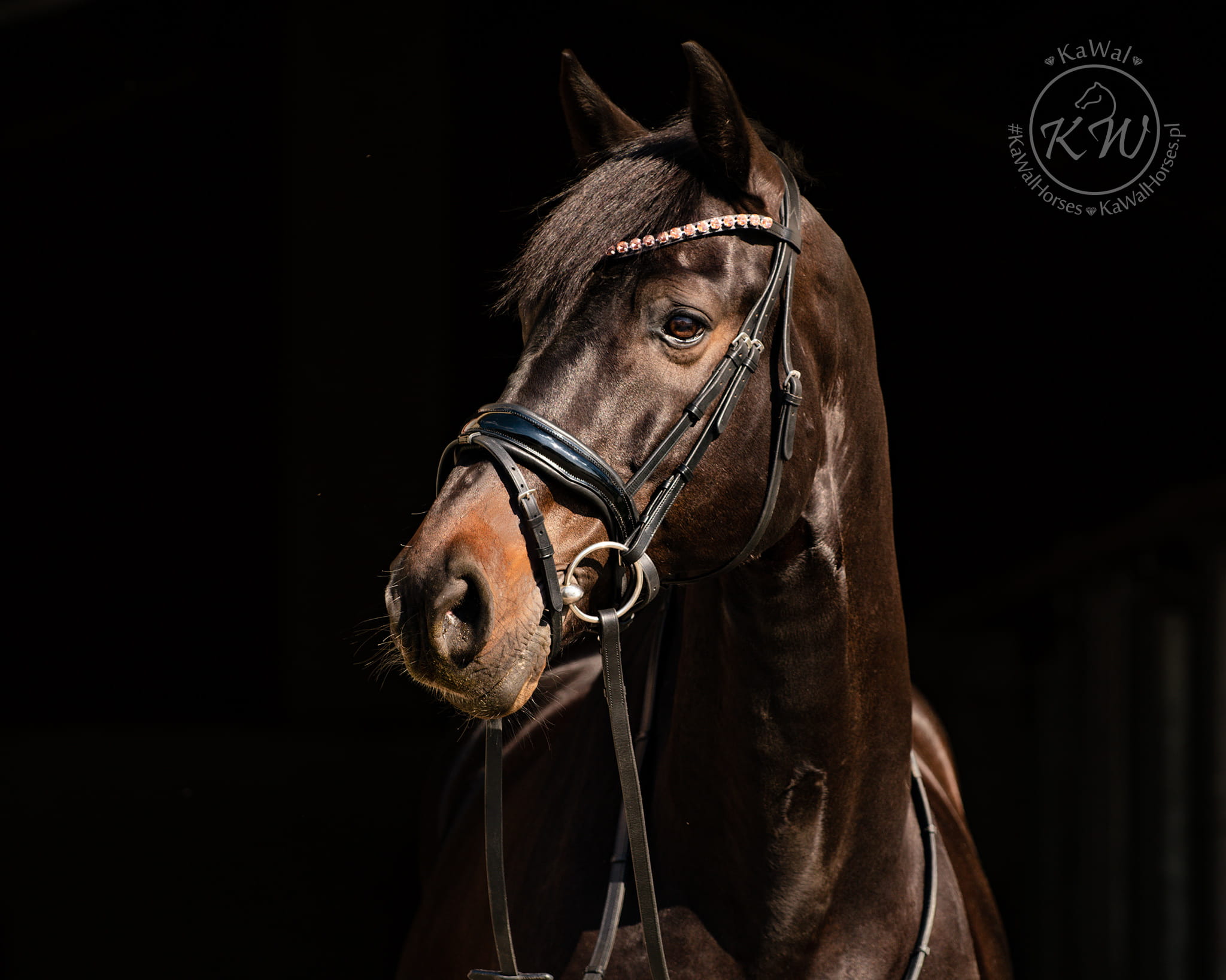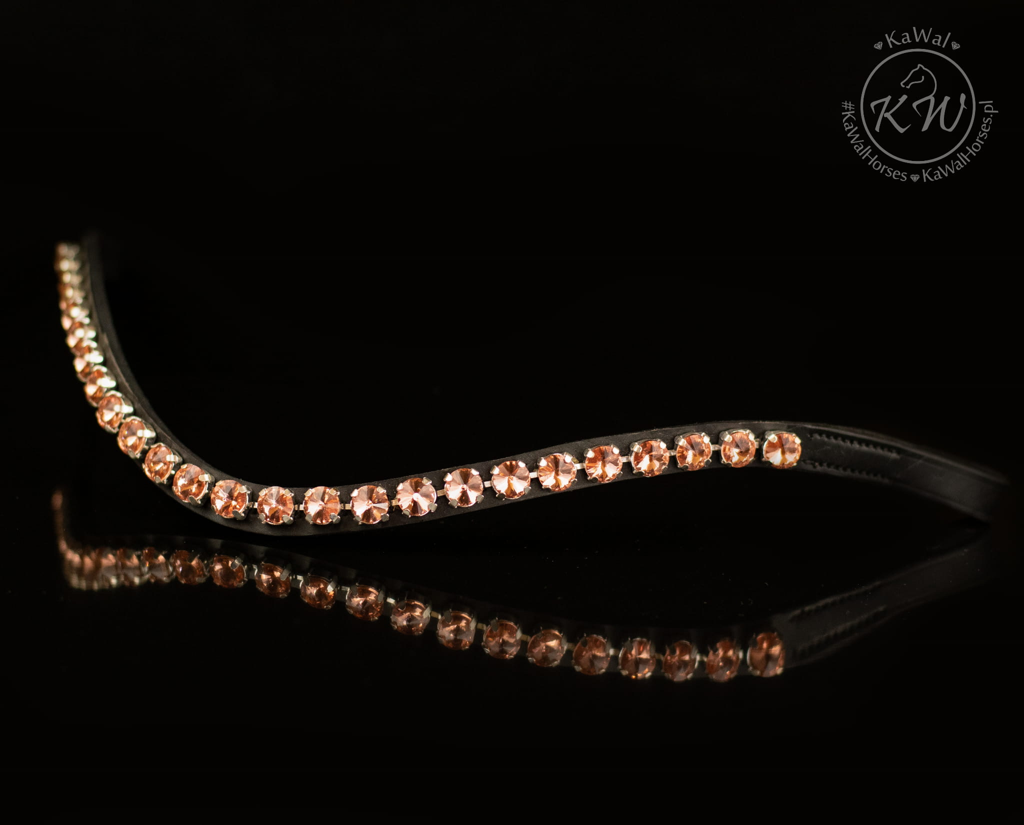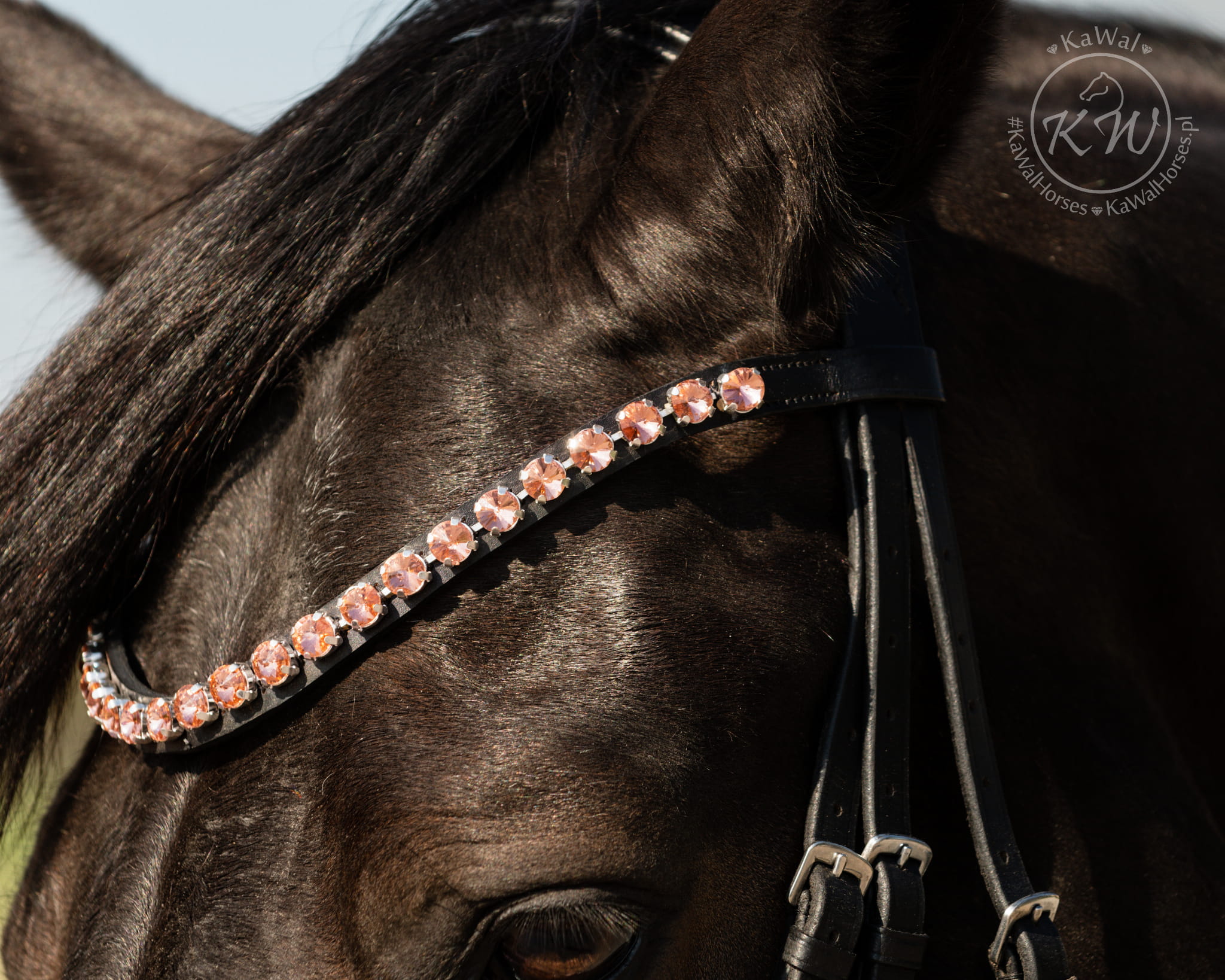Czarne ogłowie z delikatnym, opadającym naczółkiem ozdobionym dużymi kryształkami w kolorze jasnoróżowym oraz szerokim,lakierowanym nachrapnikiem. Profilowany nagłówek i nachrapnik zostały miękko podszyte czarną skórą.