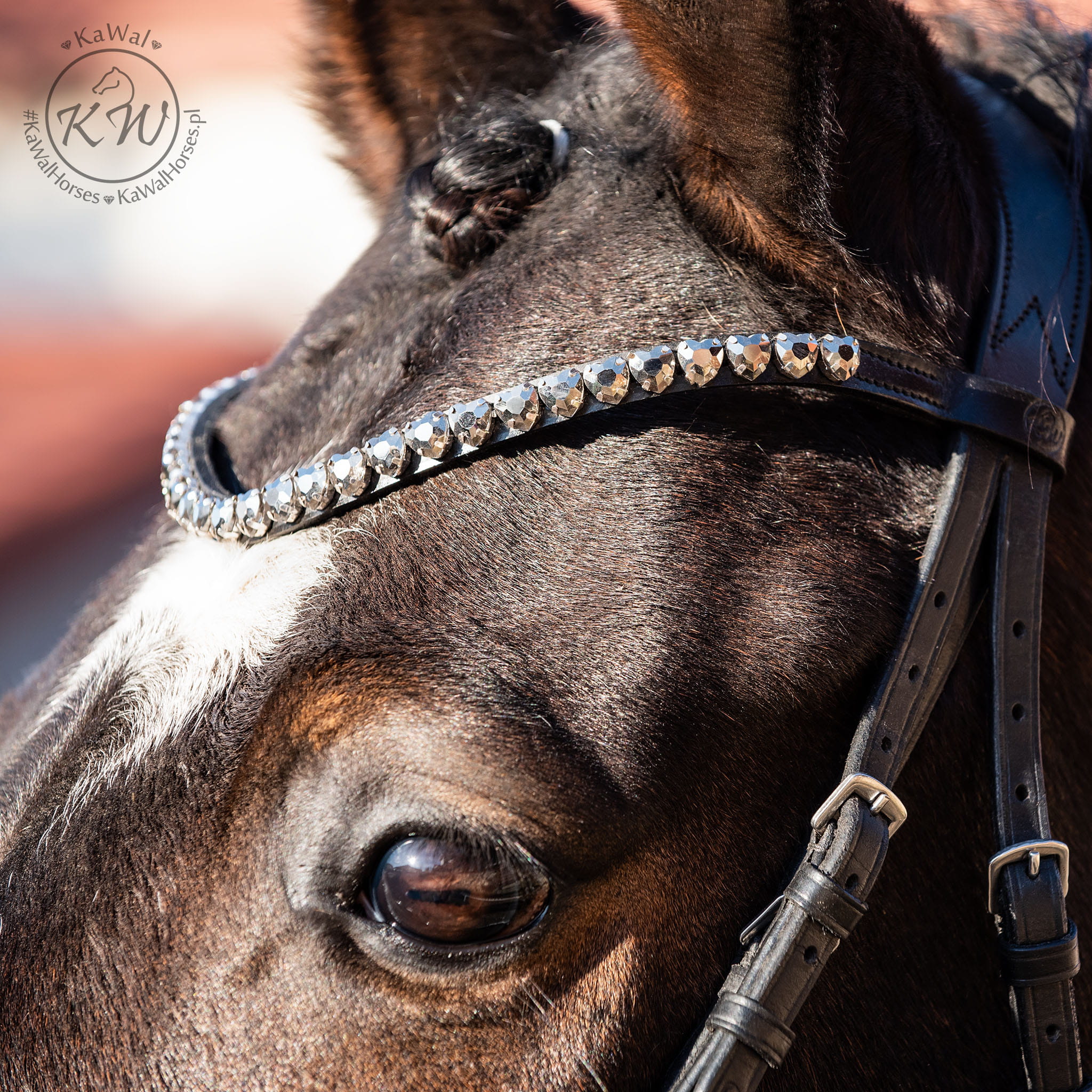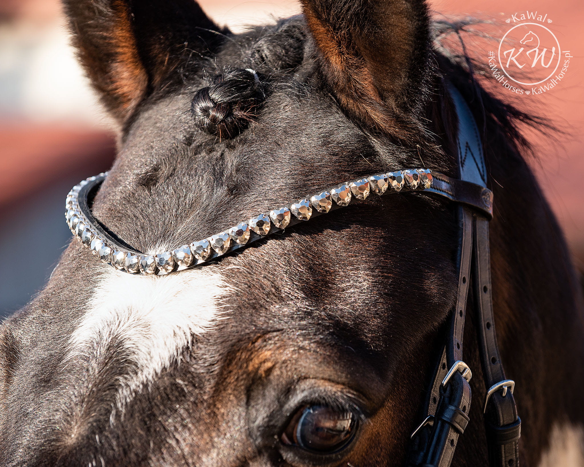 Czarne ogłowie z szerokim, lakierowanym nachrapnikiem szwedzkim, miękko podszytym skórą w kolorze czarnym oraz mocno opadającym naczółkiem ozdobionym kryształkami w kształcie serduszek, w kolorze grafitowo - lustrzanym. Anatomiczna, profilowana potylica posiada miękkie podszycie z czarnej skóry.