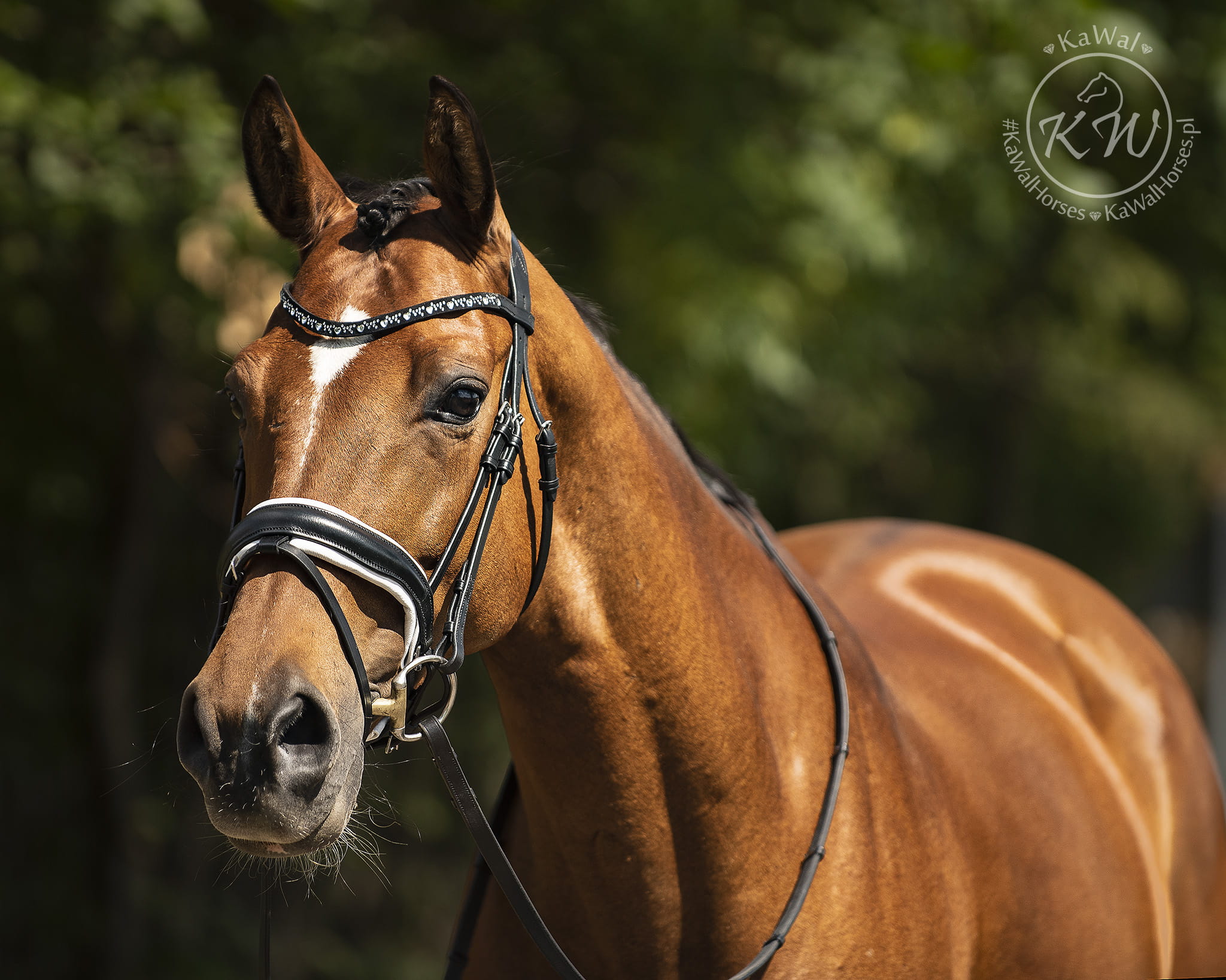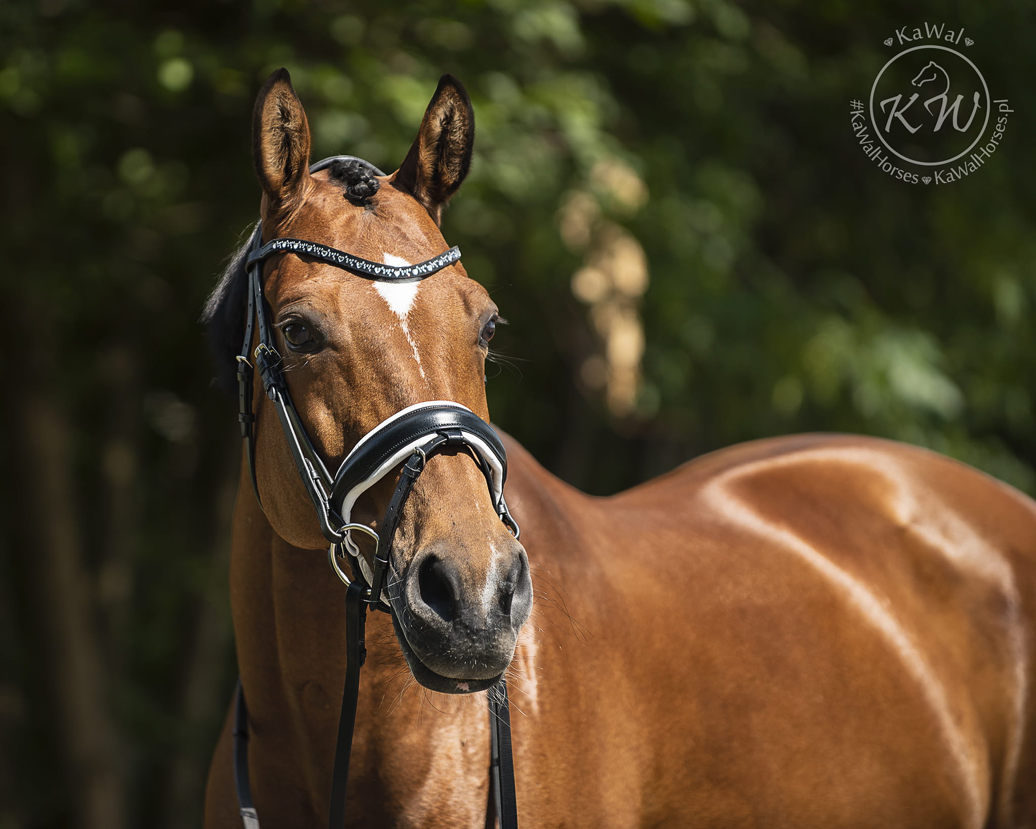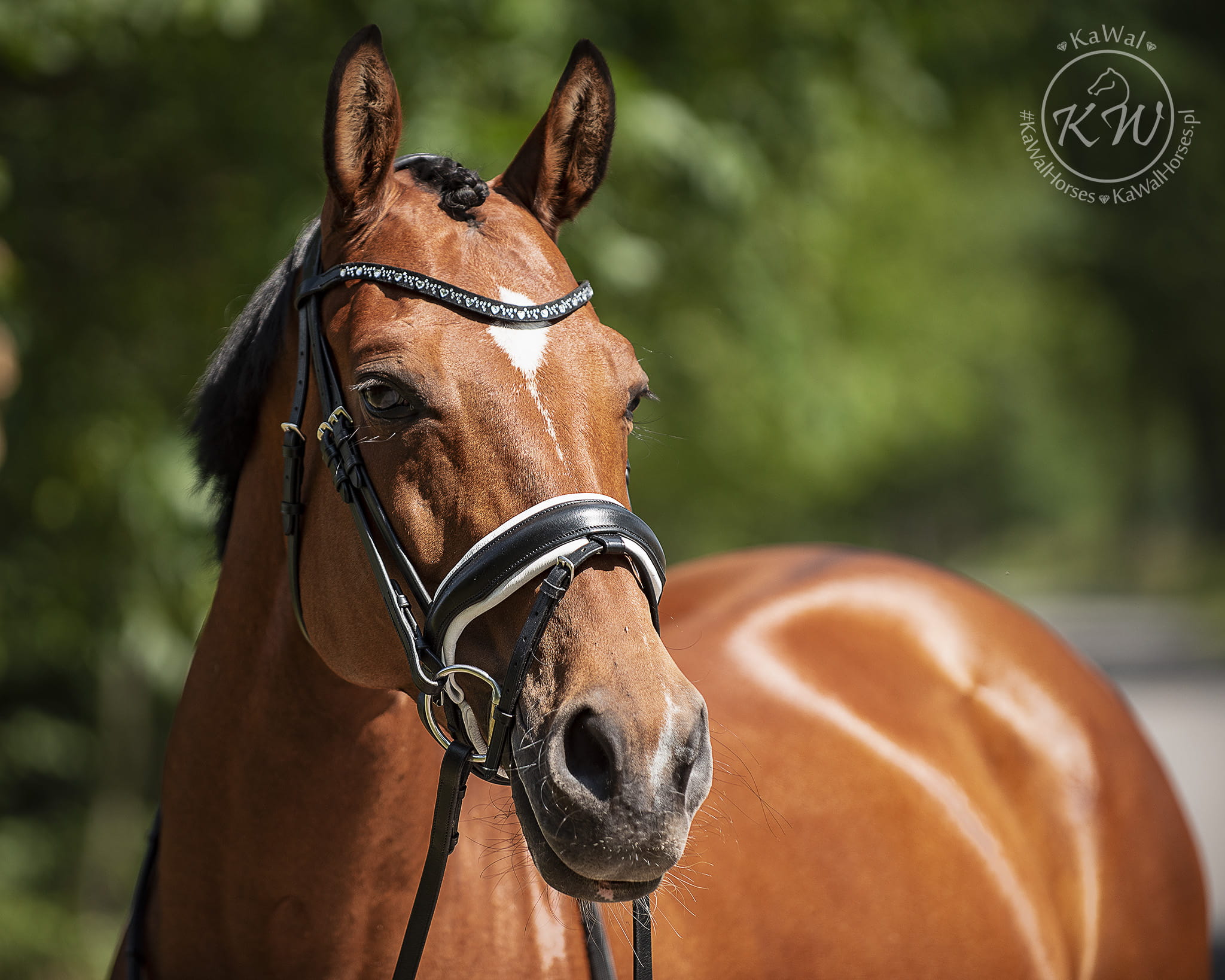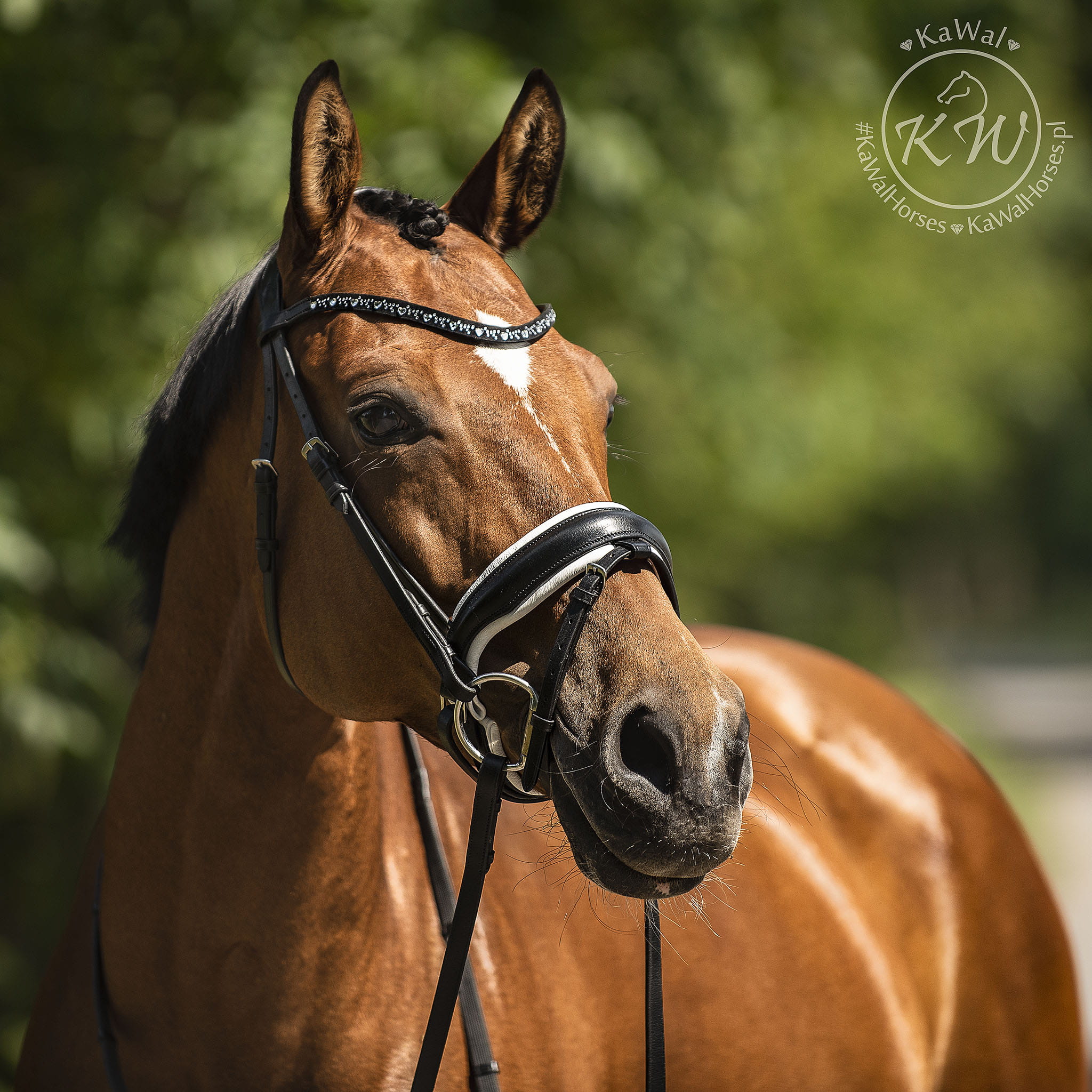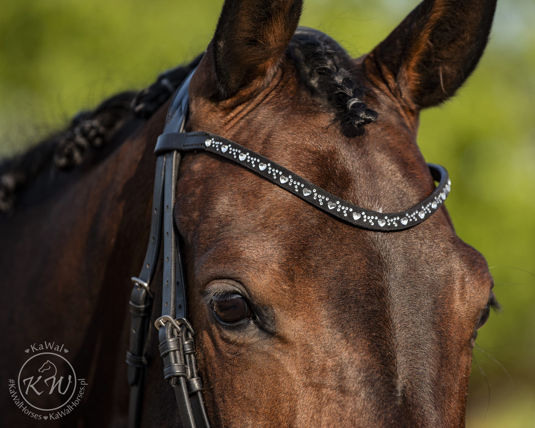 Czarne ogłowie z mocno opadającym naczółkiem ozdobionym, umieszczonymi na taśmie nośnej, wklejonymi, delikatnie wypukłymi kryształkami w kształcie serduszek i małymi, okrągłymi oraz z szerokim, matowym nachrapnikiem szwedzkim, miękko podszytym skórą w kolorze czarnym. Anatomiczna, profilowana potylica posiada miękkie podszycie z czarnej skóry.