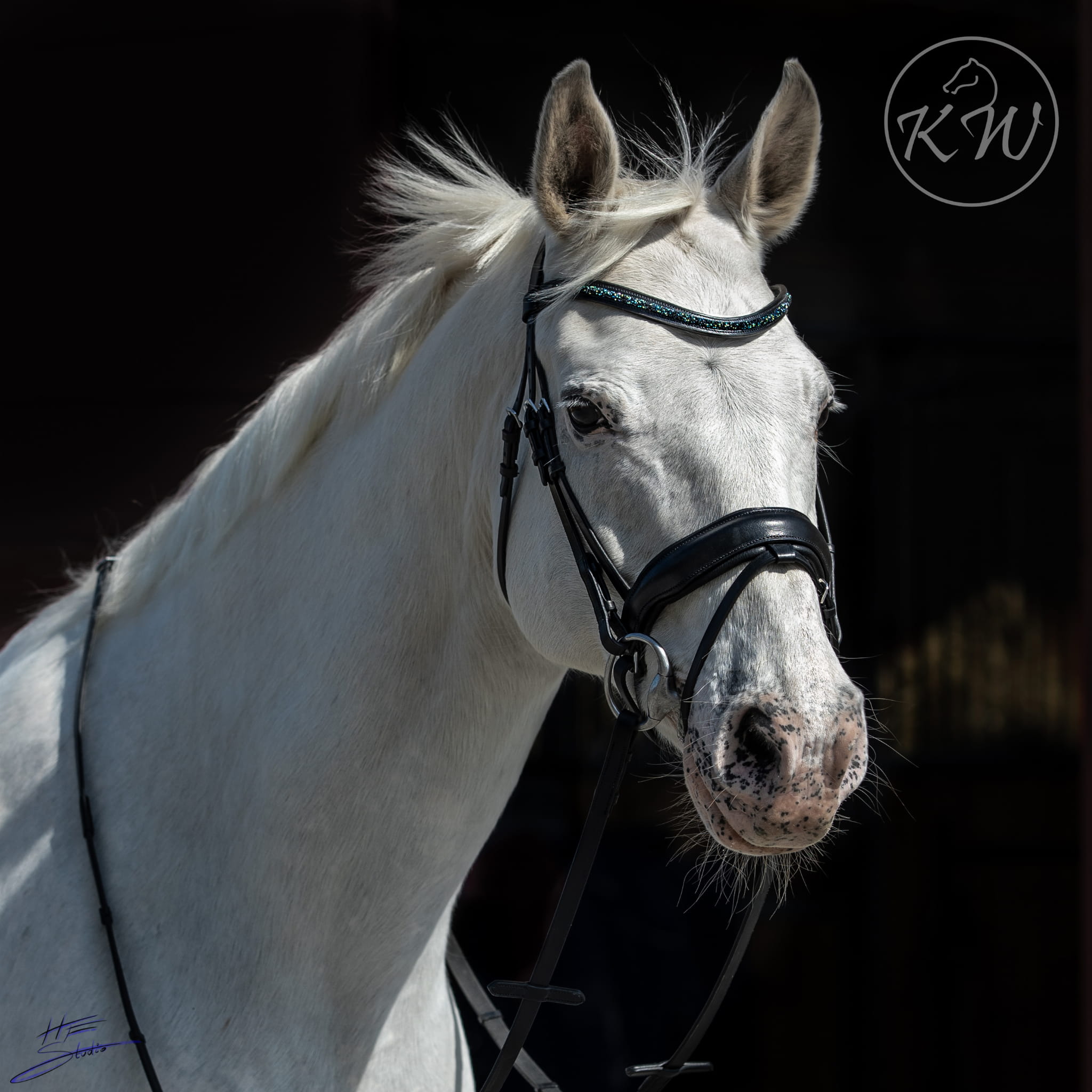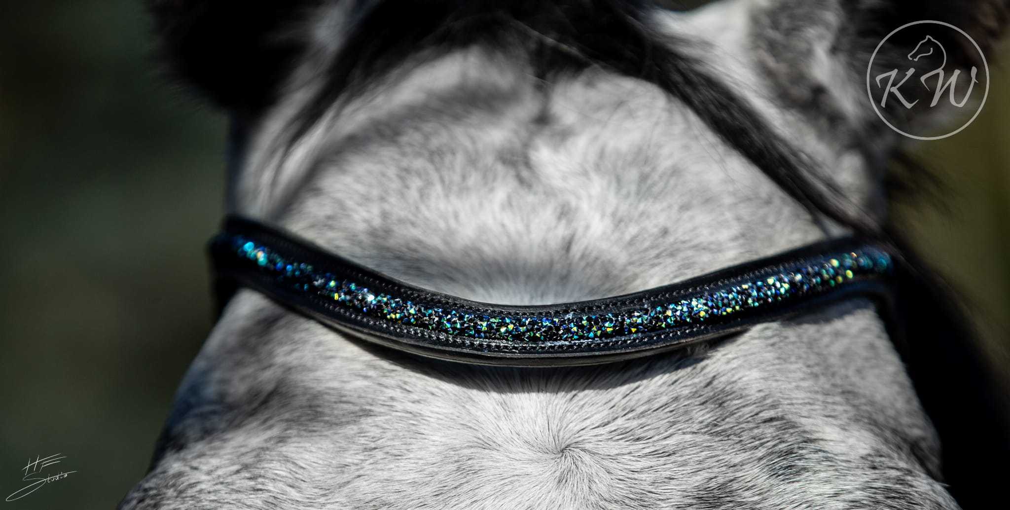 Czarne ogłowie z opadającym naczółkiem z małymi, czarnymi, opalizującymi kryształkami w kolorze czarnym. Ogłowie posiada szwedzki, szeroki, nielakierowany nachrapnik, miękko podszytym skórą w kolorze czarnym. Anatomiczna, profilowana potylica posiada miękkie podszycie z czarnej skóry.