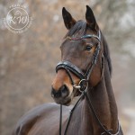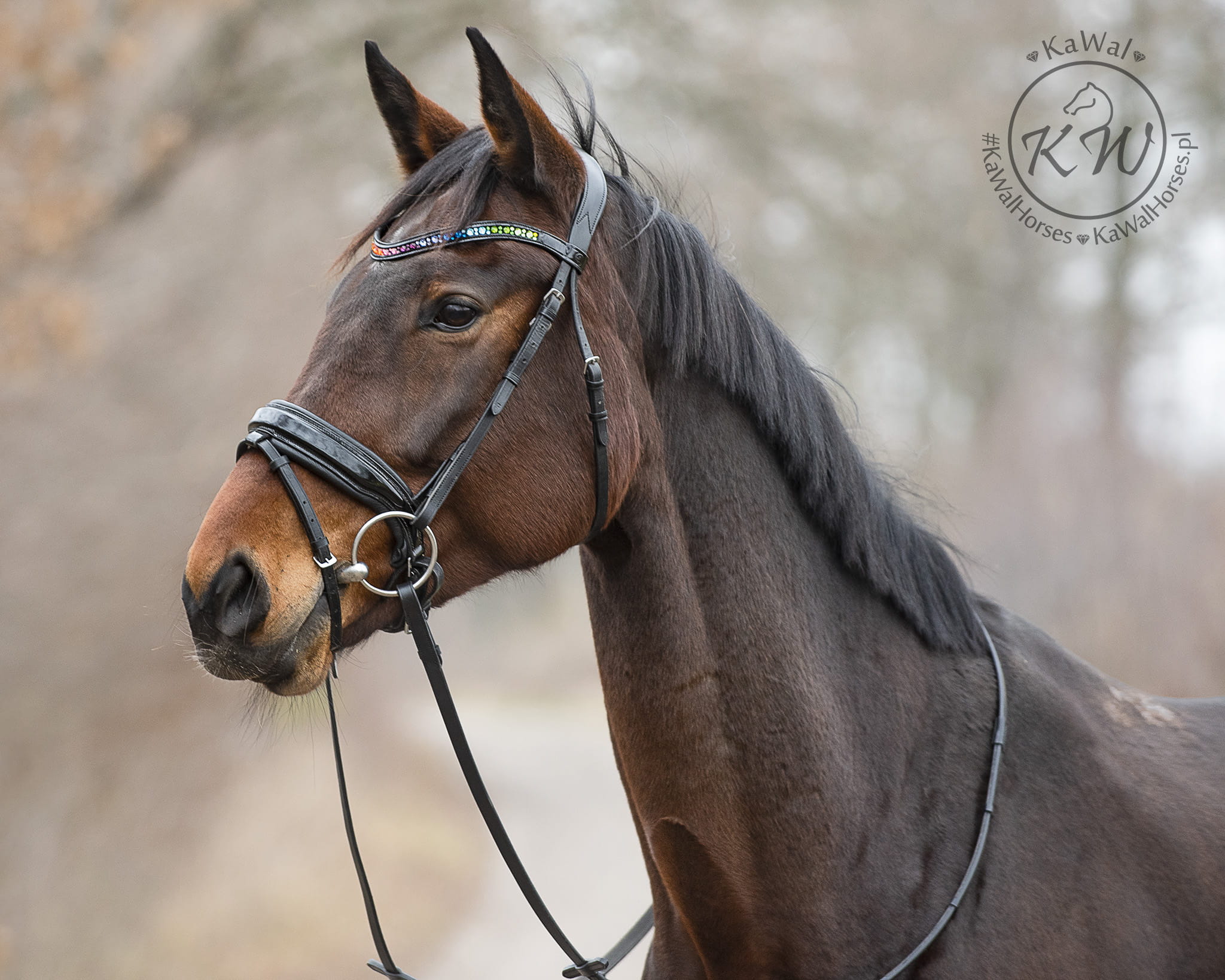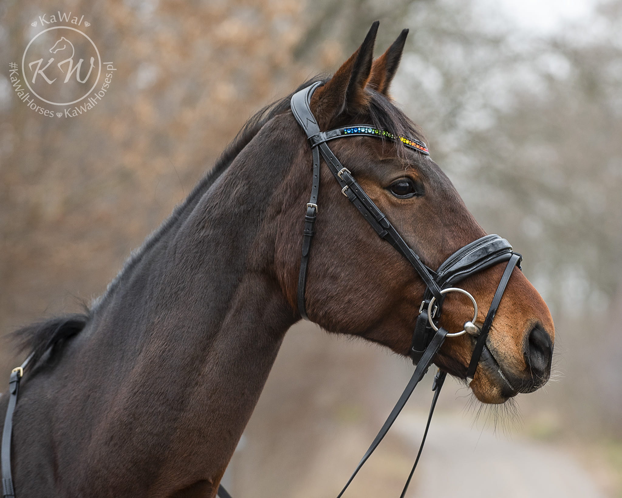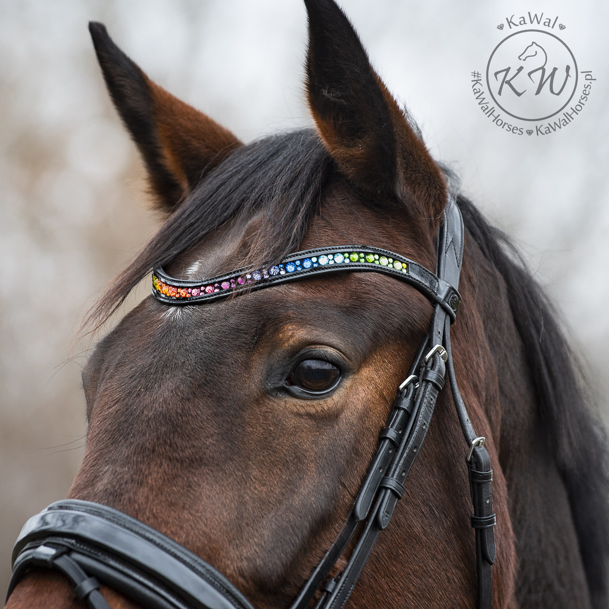 Czarne ogłowie z szerokim, lakierowanym nachrapnikiem szwedzkim, miękko podszytym skórą w kolorze czarnym oraz opadającym, lakierowanym naczółkiem ozdobionym wieloma kryształkami w kolorach tęczy, bez oprawek.Anatomiczna, profilowana potylica posiada miękkie podszycie z czarnej skóry.