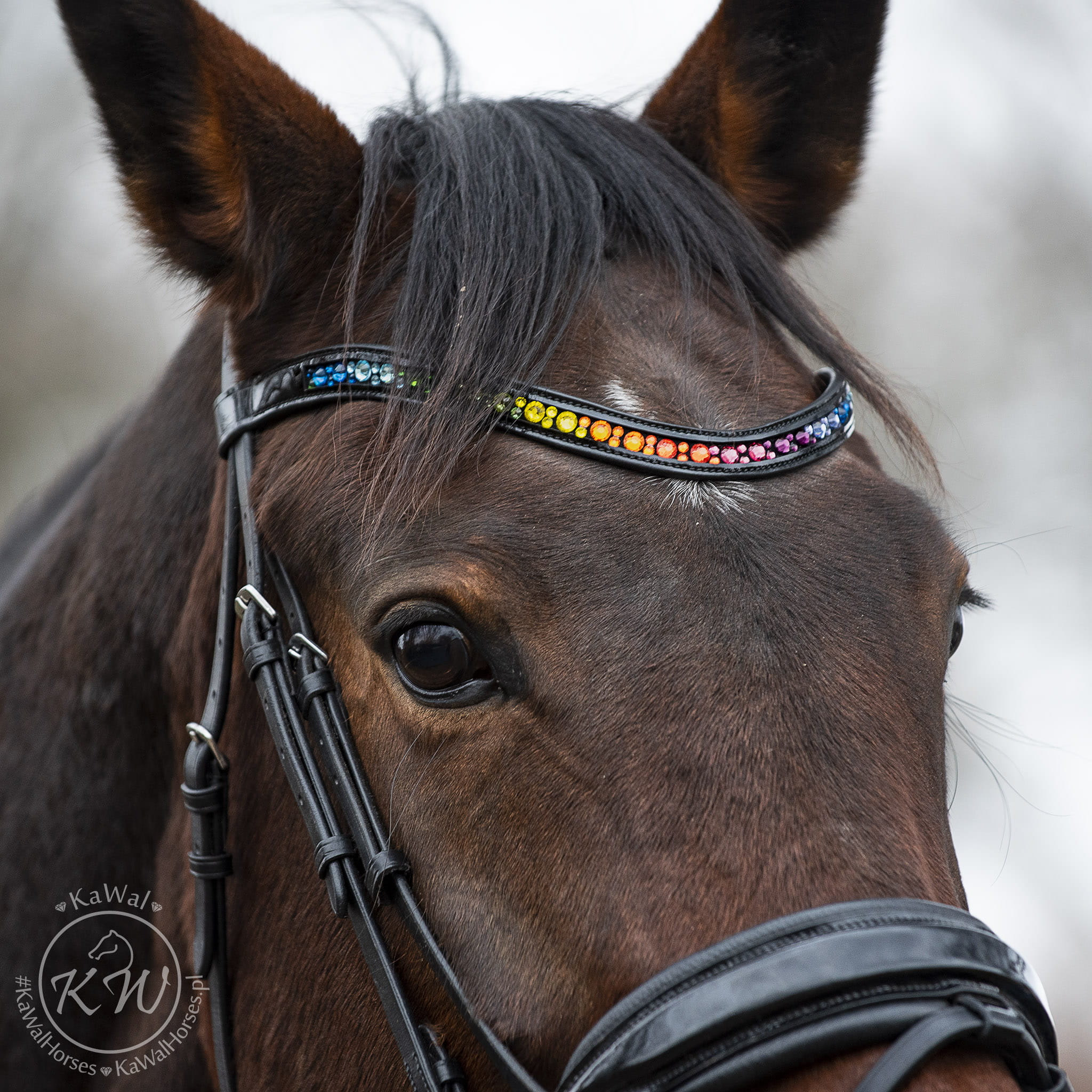 Czarne ogłowie z szerokim, lakierowanym nachrapnikiem szwedzkim, miękko podszytym skórą w kolorze czarnym oraz opadającym, lakierowanym naczółkiem ozdobionym wieloma kryształkami w kolorach tęczy, bez oprawek. Anatomiczna, profilowana potylica posiada miękkie podszycie z czarnej skóry.