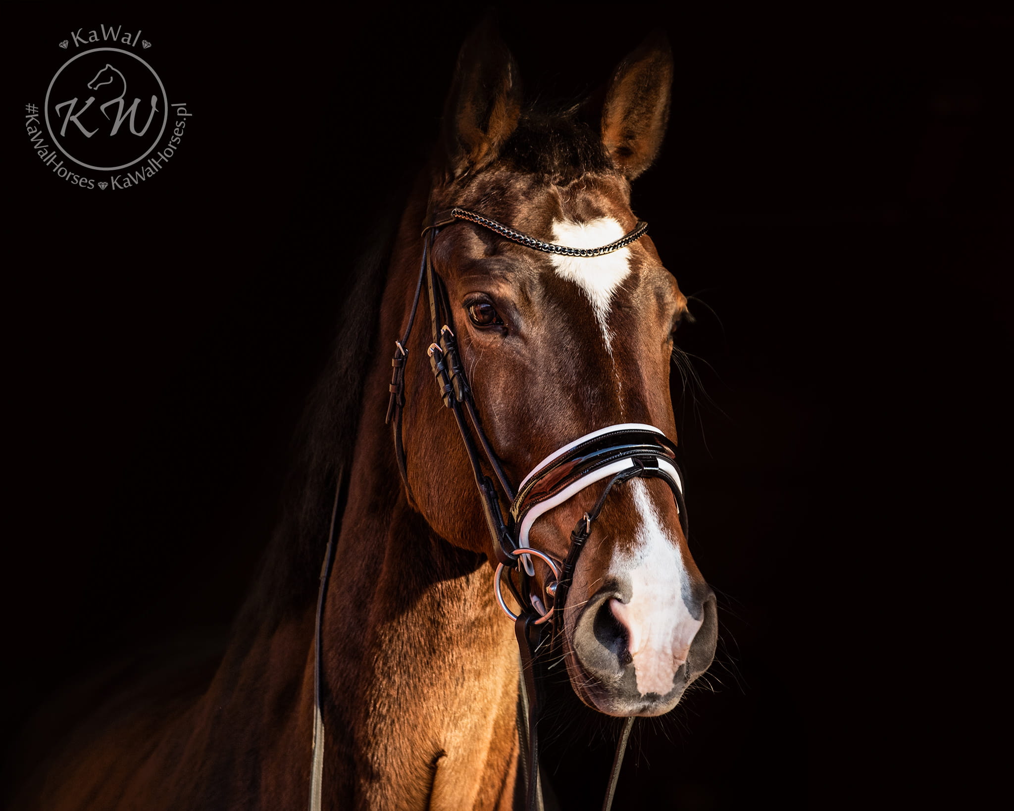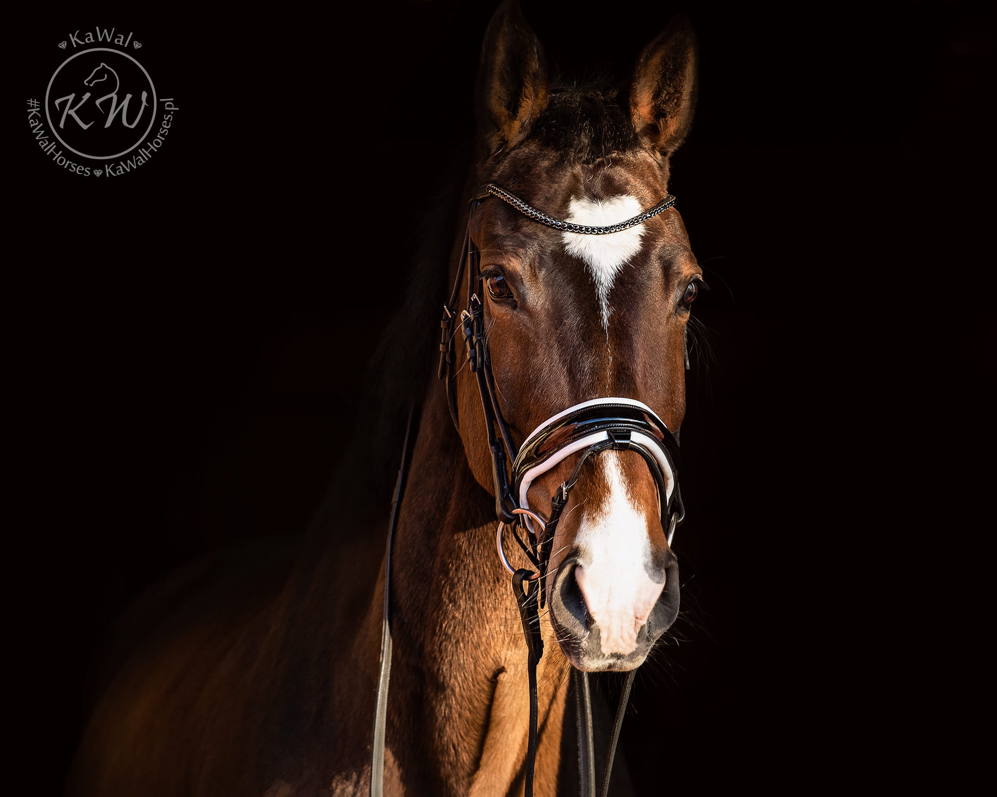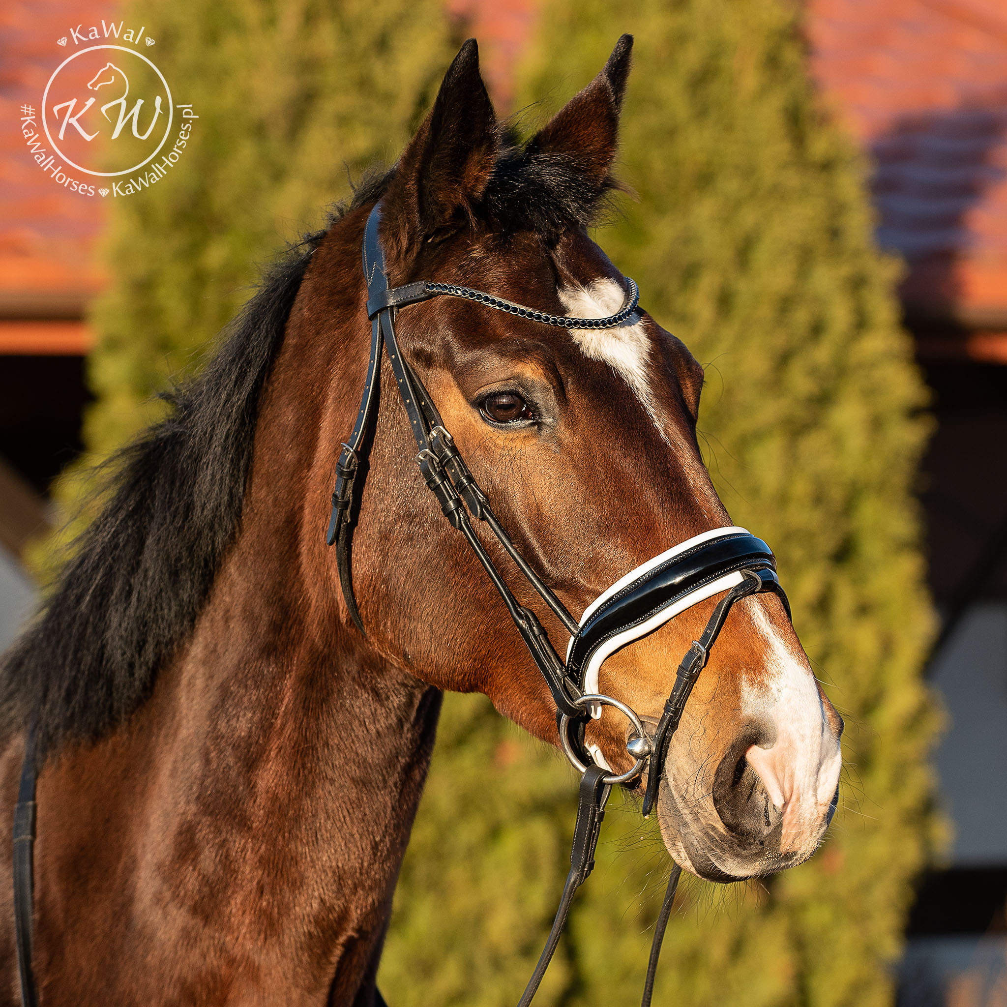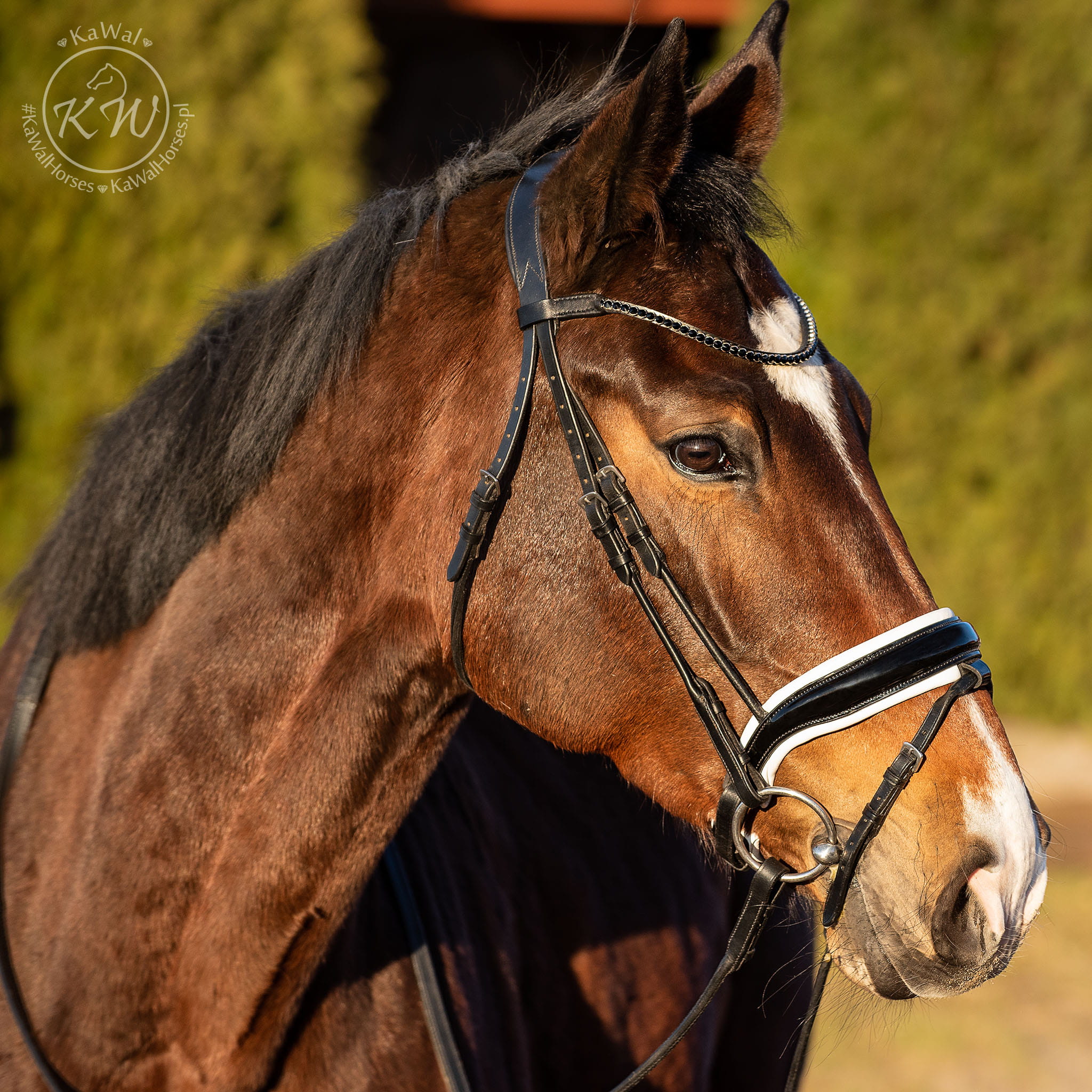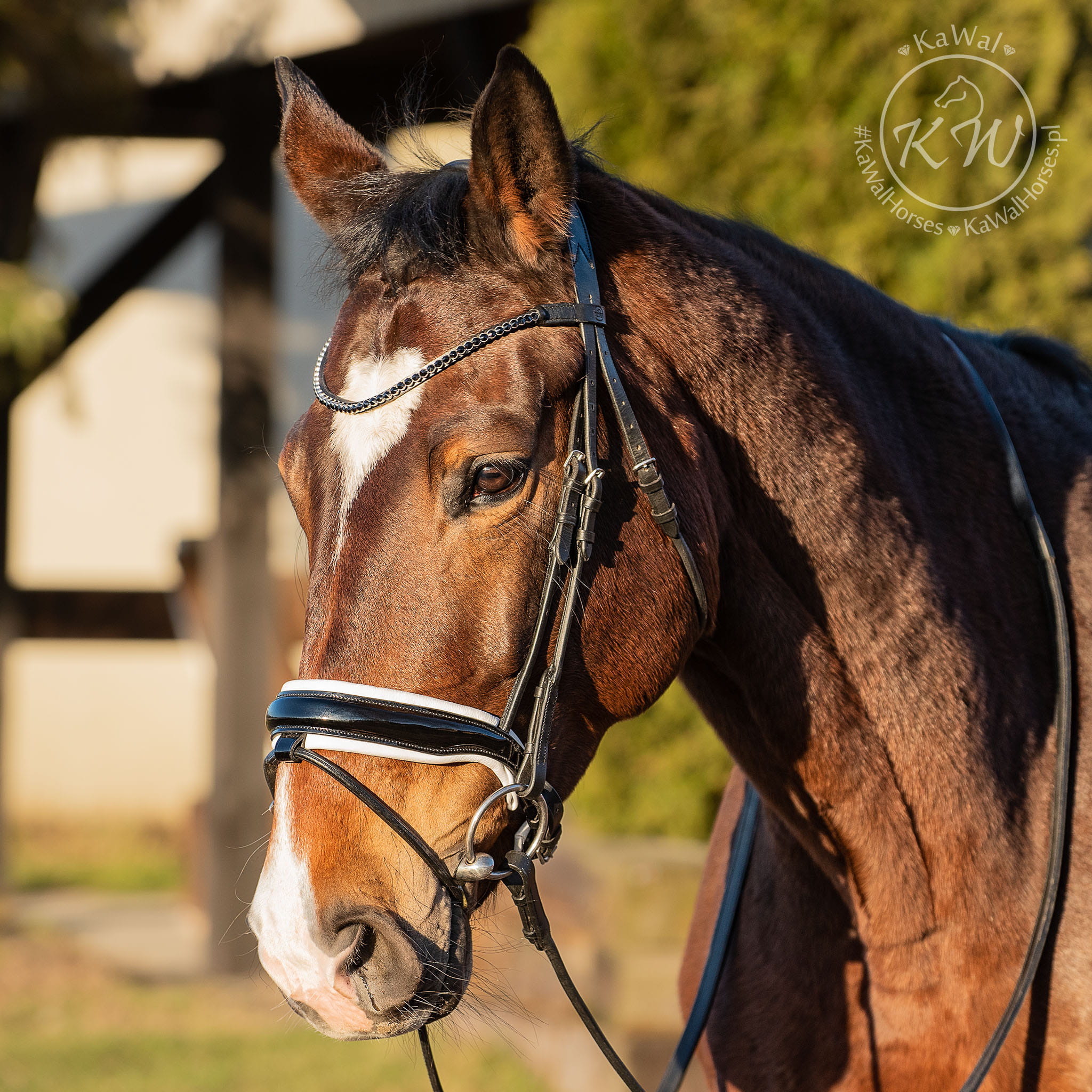 Czarne ogłowie z mocno opadającym naczółkiem ozdobionym jednym rzędem czarnych kryształków oraz szerokim, lakierowanym, podszytym białą skórą, rurkowym nachrapnikiem. Profilowany nagłówek został miękko podszyty czarną skórą.