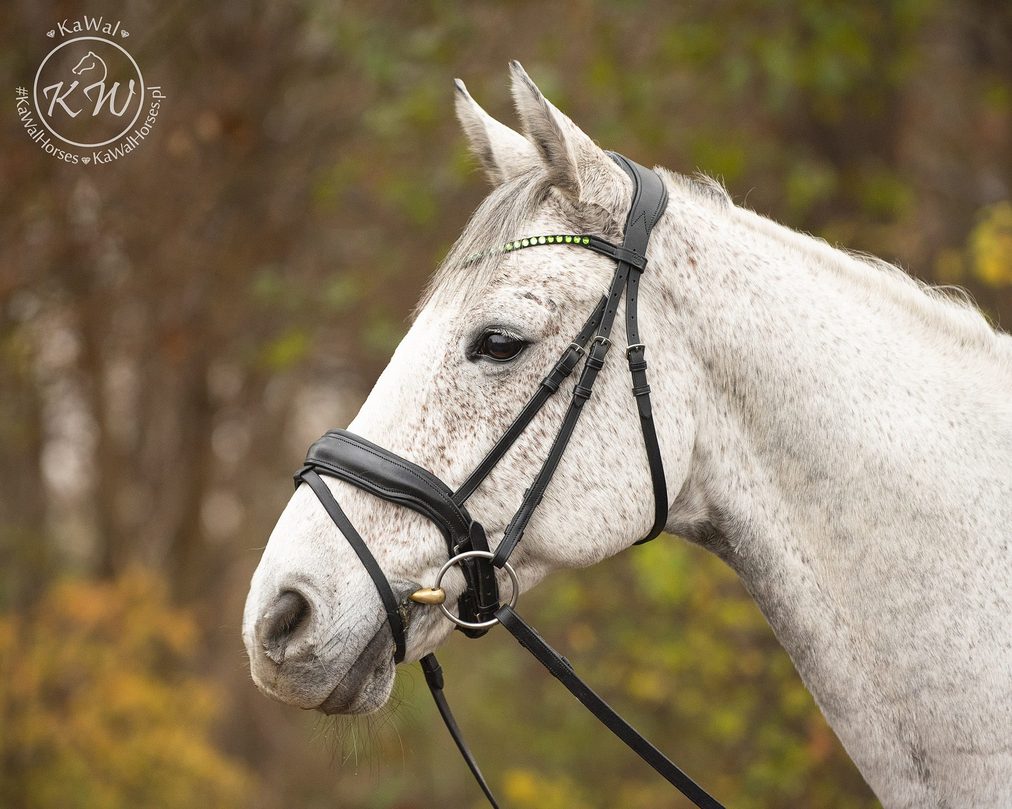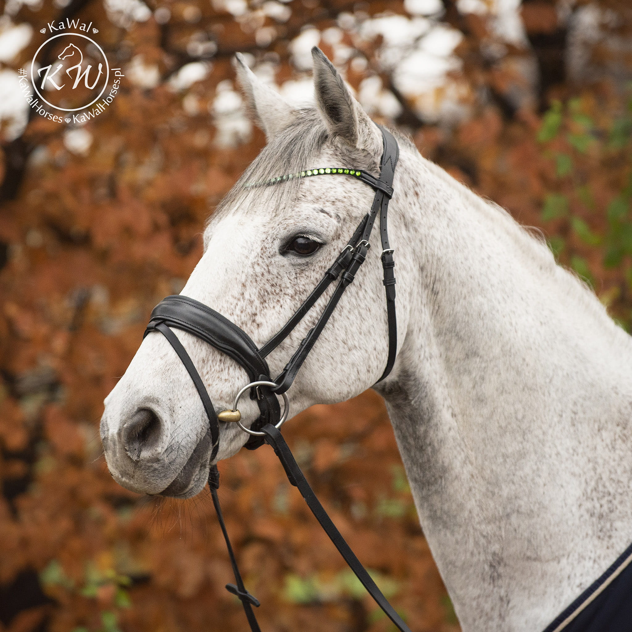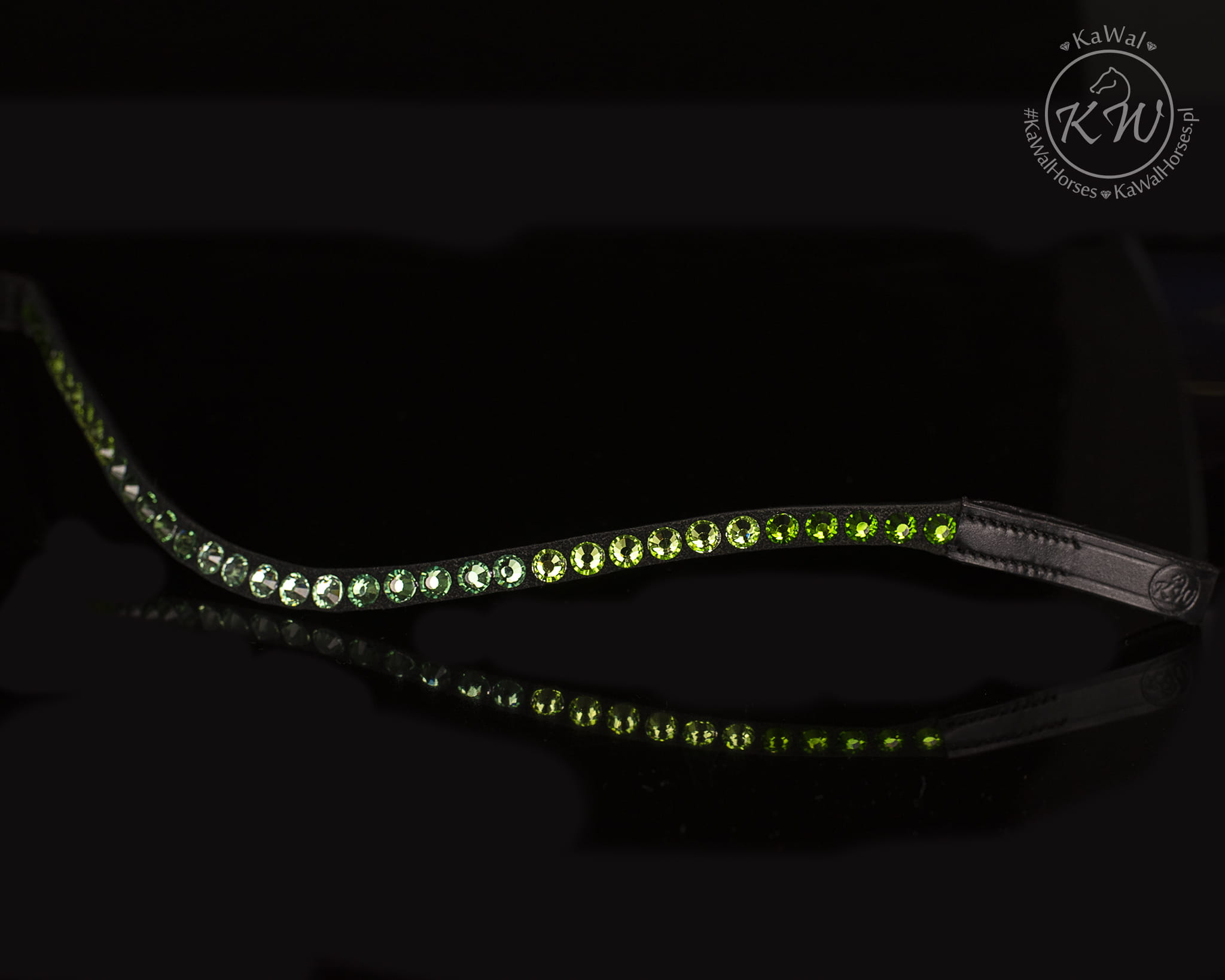 Czarne ogłowie z szerokim, matowym nachrapnikiem szwedzkim, miękko podszytym skórą w kolorze czarnym oraz lakierowanym naczółkiem podszytym czarną skórą i mocno opadającym naczółkiem ozdobionym kryształkami w odcieniach zieleni. Naczółek bardzo mocno mieni się w słońcu, a jednocześnie, dzięki sposobie mocowania kryształków, wyróżnia się trwałością. Anatomiczna, profilowana potylica posiada miękkie podszycie z czarnej skóry.