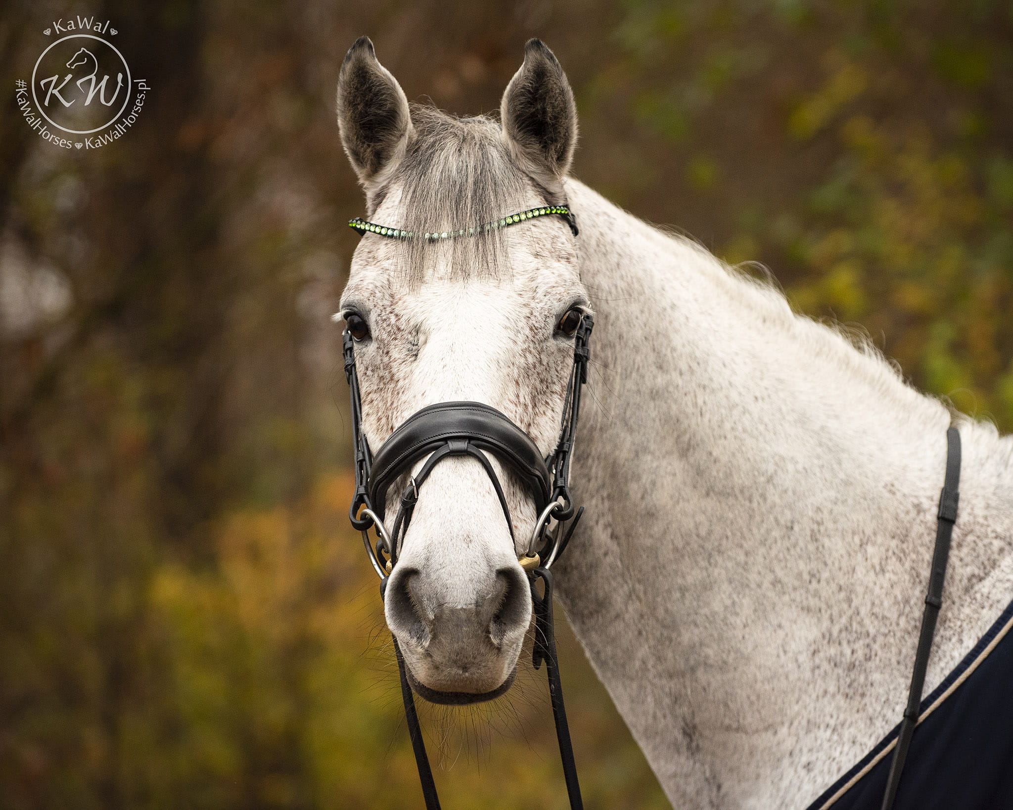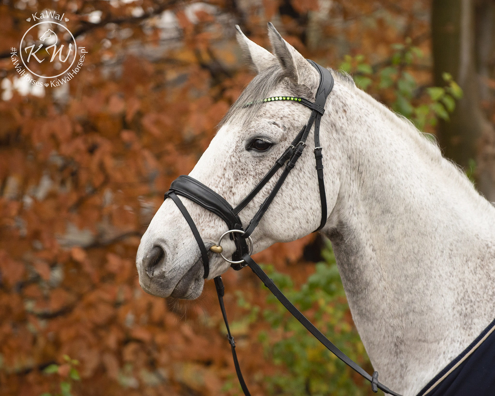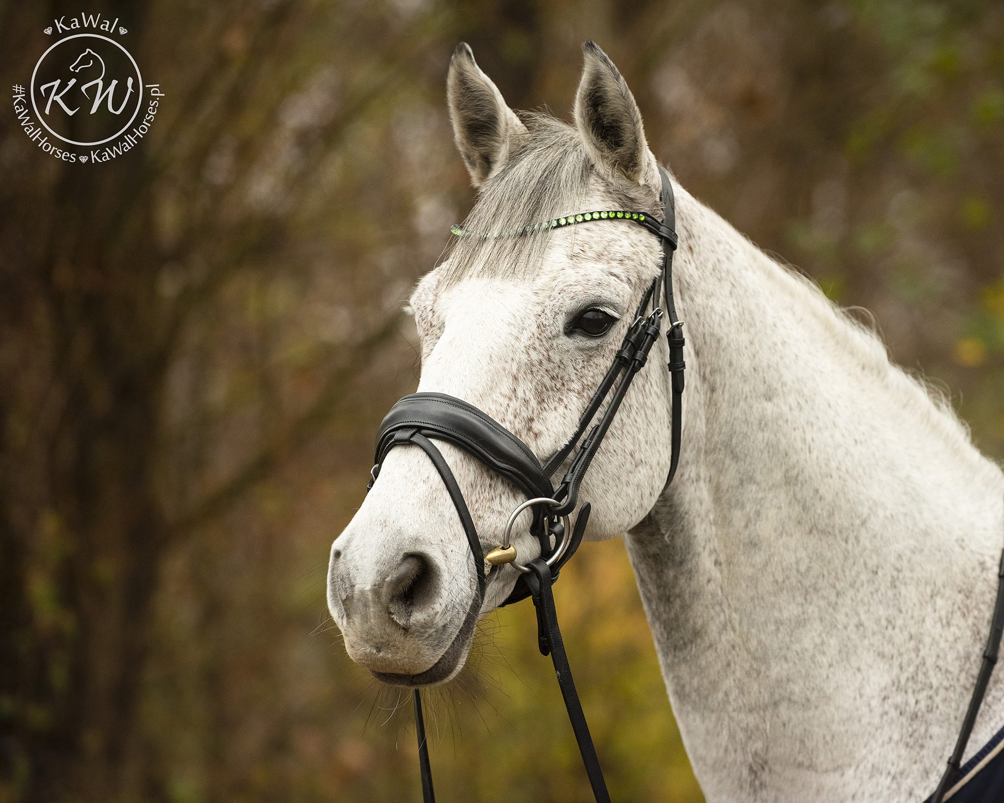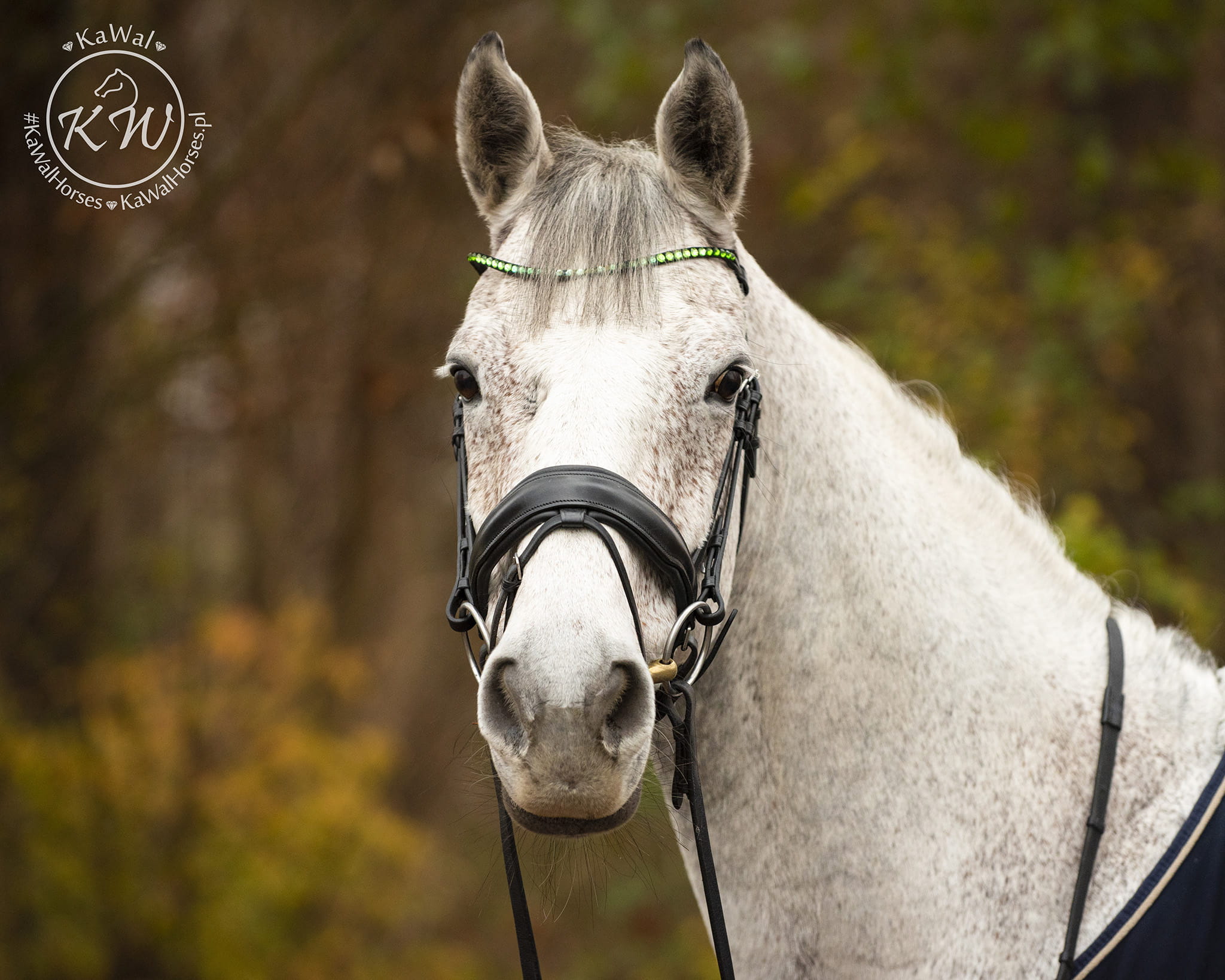 Czarne ogłowie z szerokim, matowym nachrapnikiem szwedzkim, miękko podszytym skórą w kolorze czarnym oraz lakierowanym naczółkiem podszytym czarną skórą i mocno opadającym naczółkiem ozdobionym kryształkami w odcieniach zieleni. Naczółek bardzo mocno mieni się w słońcu, a jednocześnie, dzięki sposobie mocowania kryształków, wyróżnia się trwałością. Anatomiczna, profilowana potylica posiada miękkie podszycie z czarnej skóry.