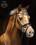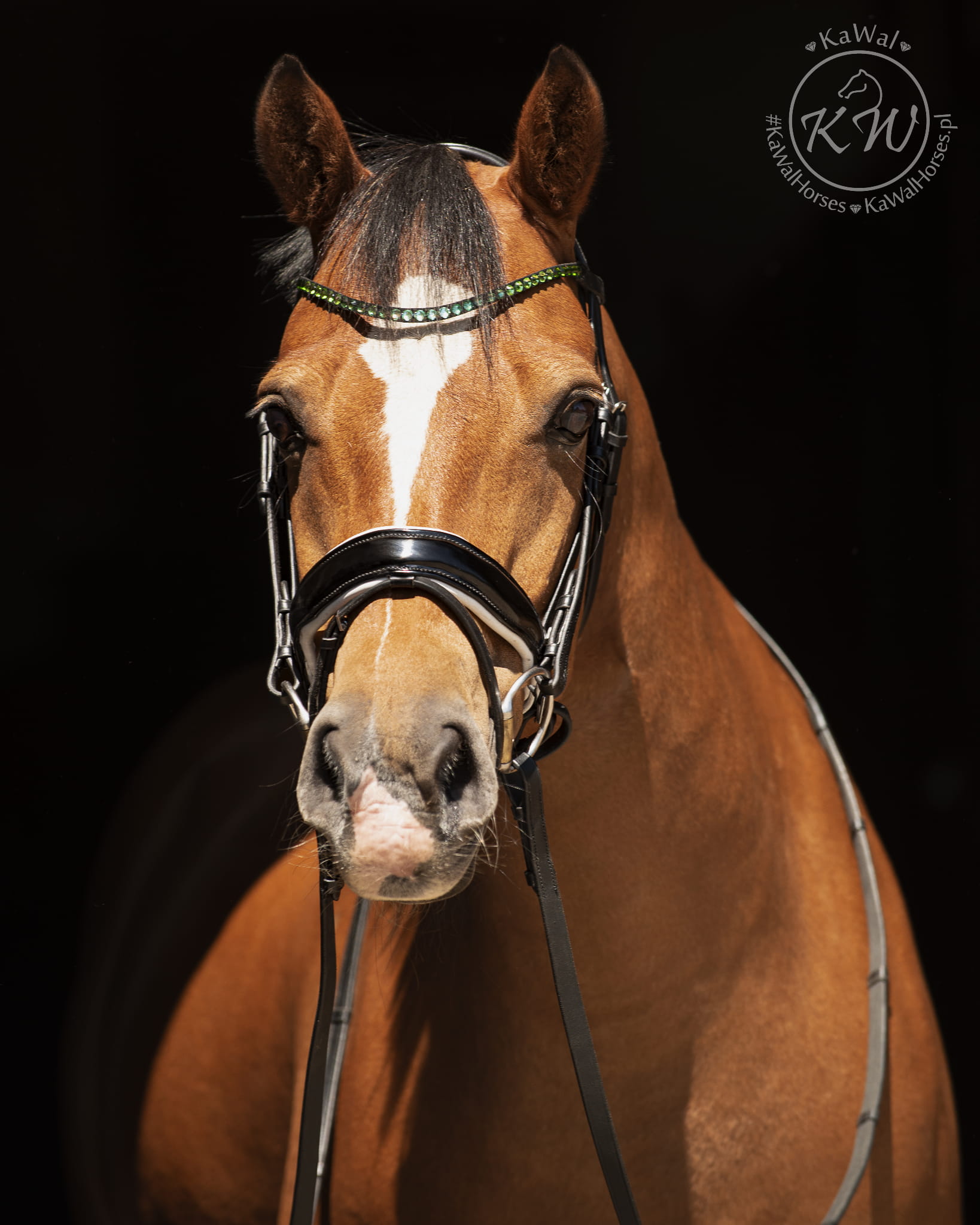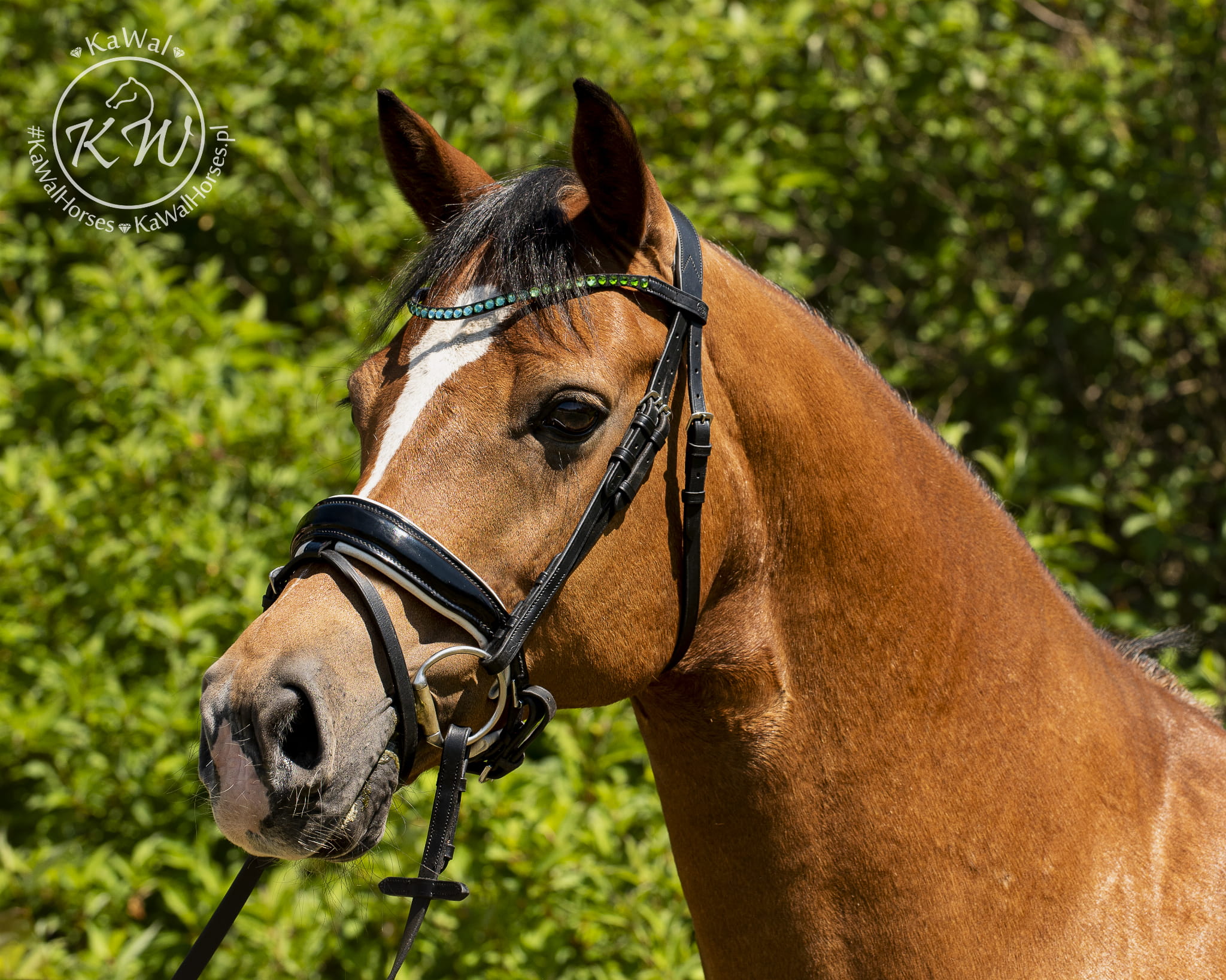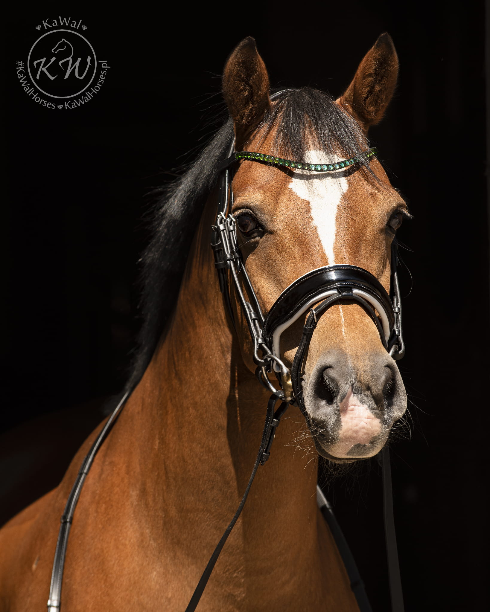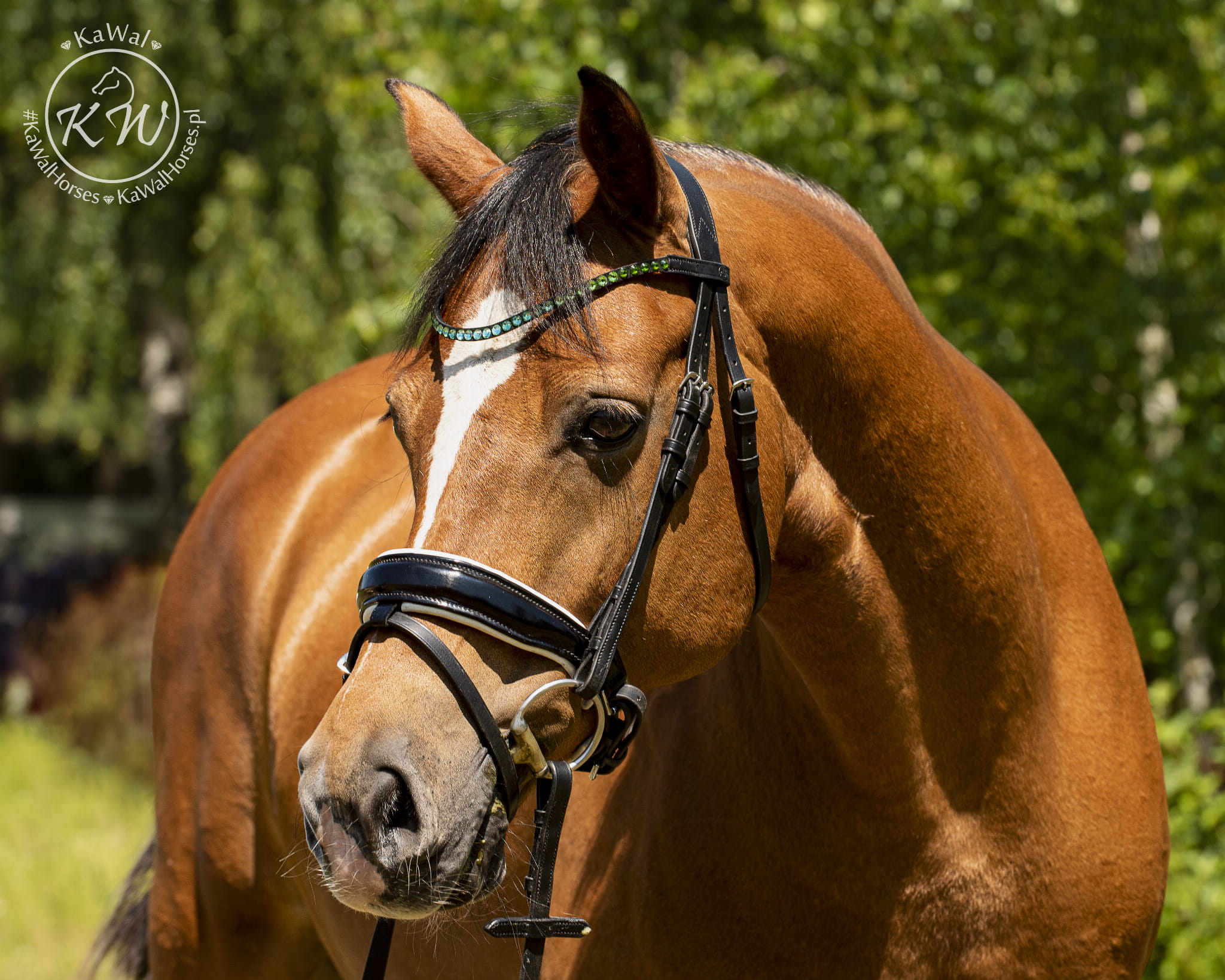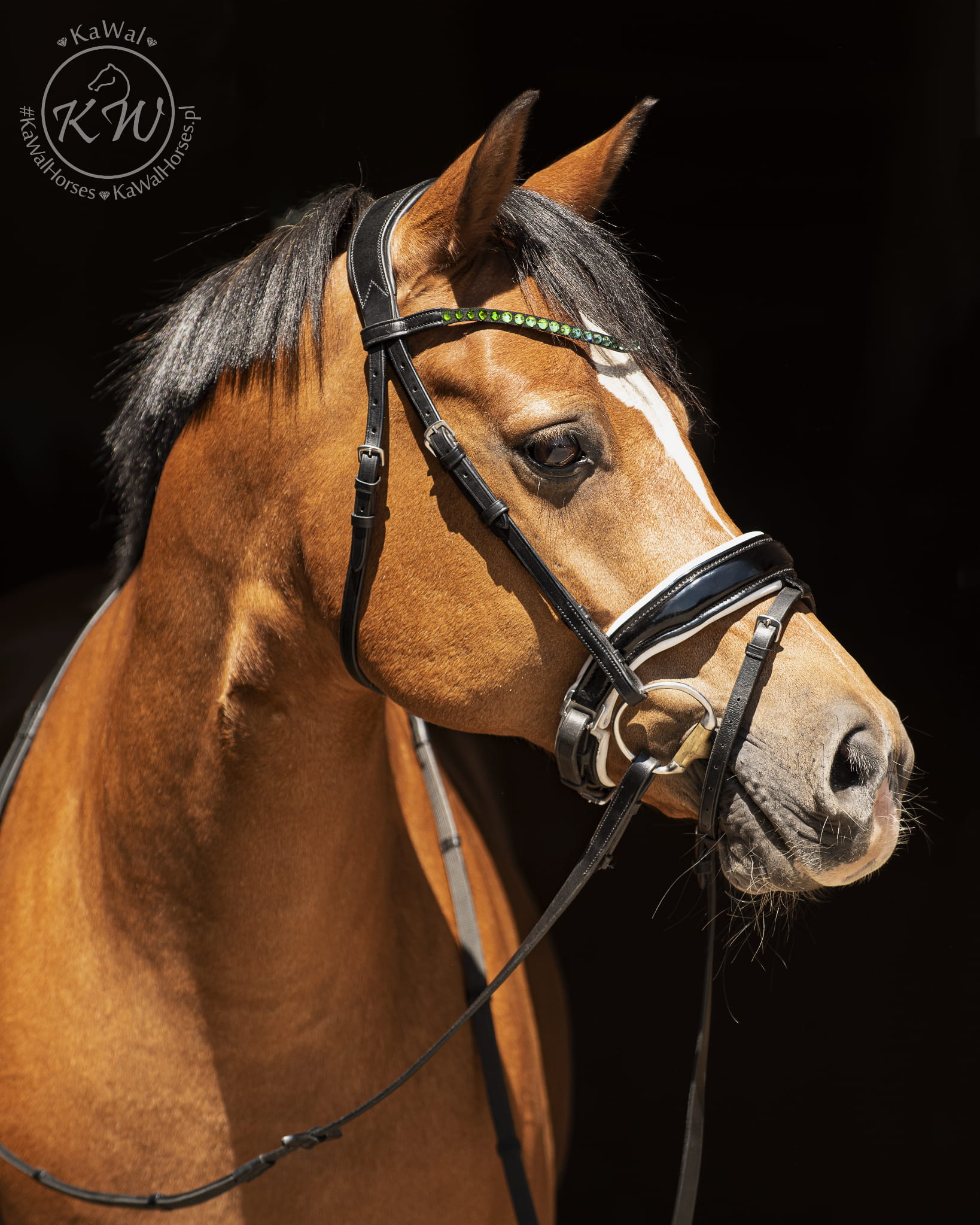 Czarne ogłowie z szerokim, lakierowanym nachrapnikiem szwedzkim, miękko podszytym skórą w kolorze białym oraz mocno opadającym naczółkiem ozdobionym kryształkami w odcieniach zieleni. Naczółek bardzo mocno mieni się w słońcu, a jednocześnie, dzięki sposobie mocowania kryształków, wyróżnia się trwałością. Anatomiczna, profilowana potylica posiada miękkie podszycie z czarnej skóry.