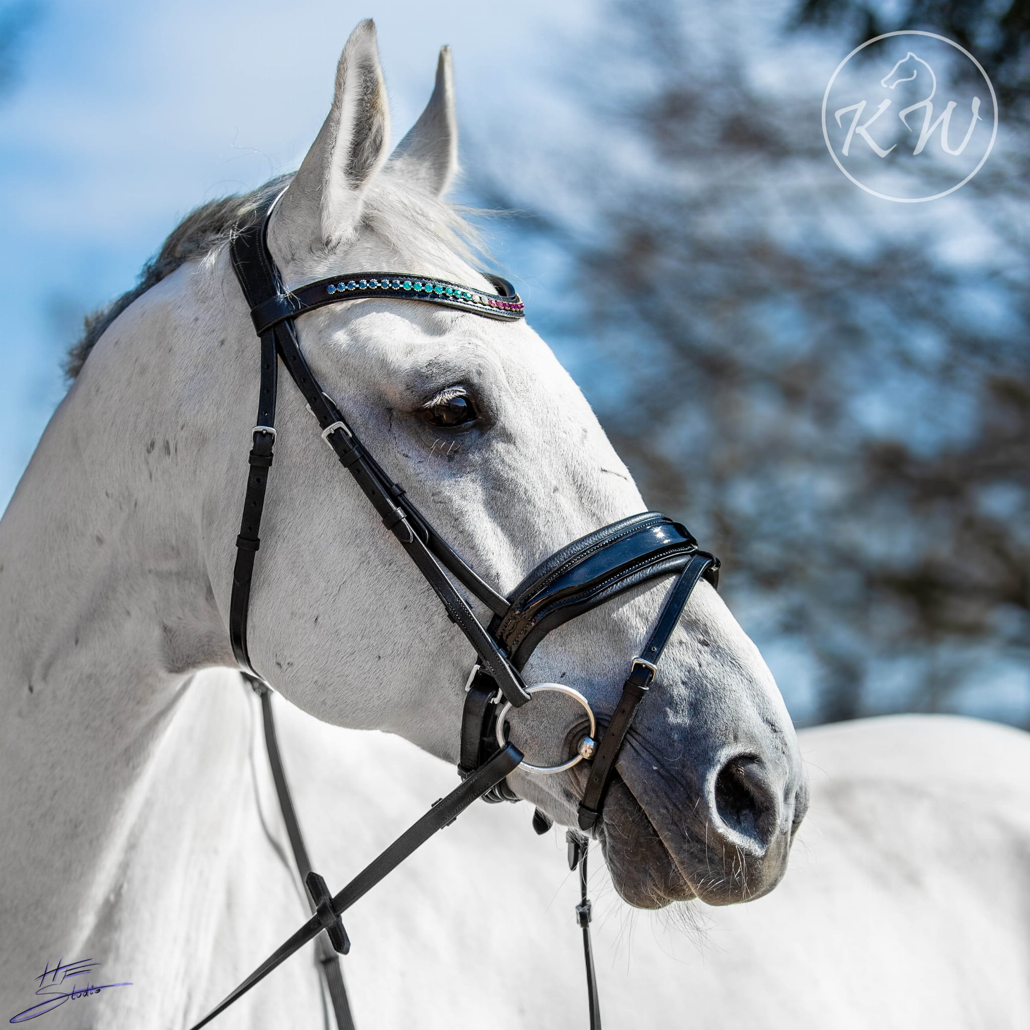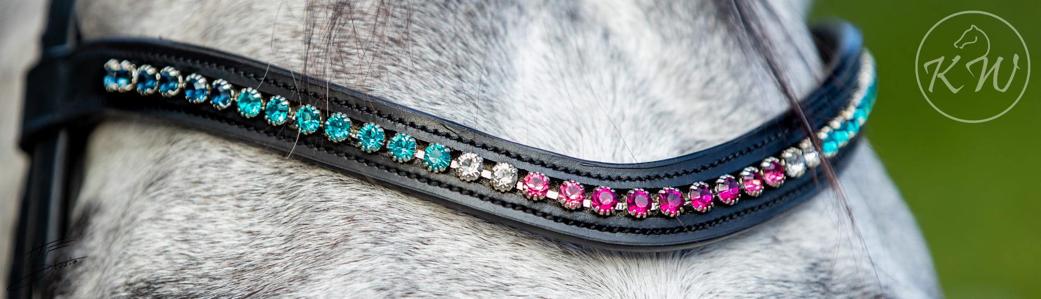Czarne ogłowie z szerokim, lakierowanym nachrapnikiem szwedzkim, miękko podszytym skórą w kolorze czarnym oraz opadającym naczółkiem z dużymi kryształkami w kolorze turkusu, bieli i soczystej fuksji. Anatomiczna, profilowana potylica posiada miękkie podszycie z czarnej skóry.