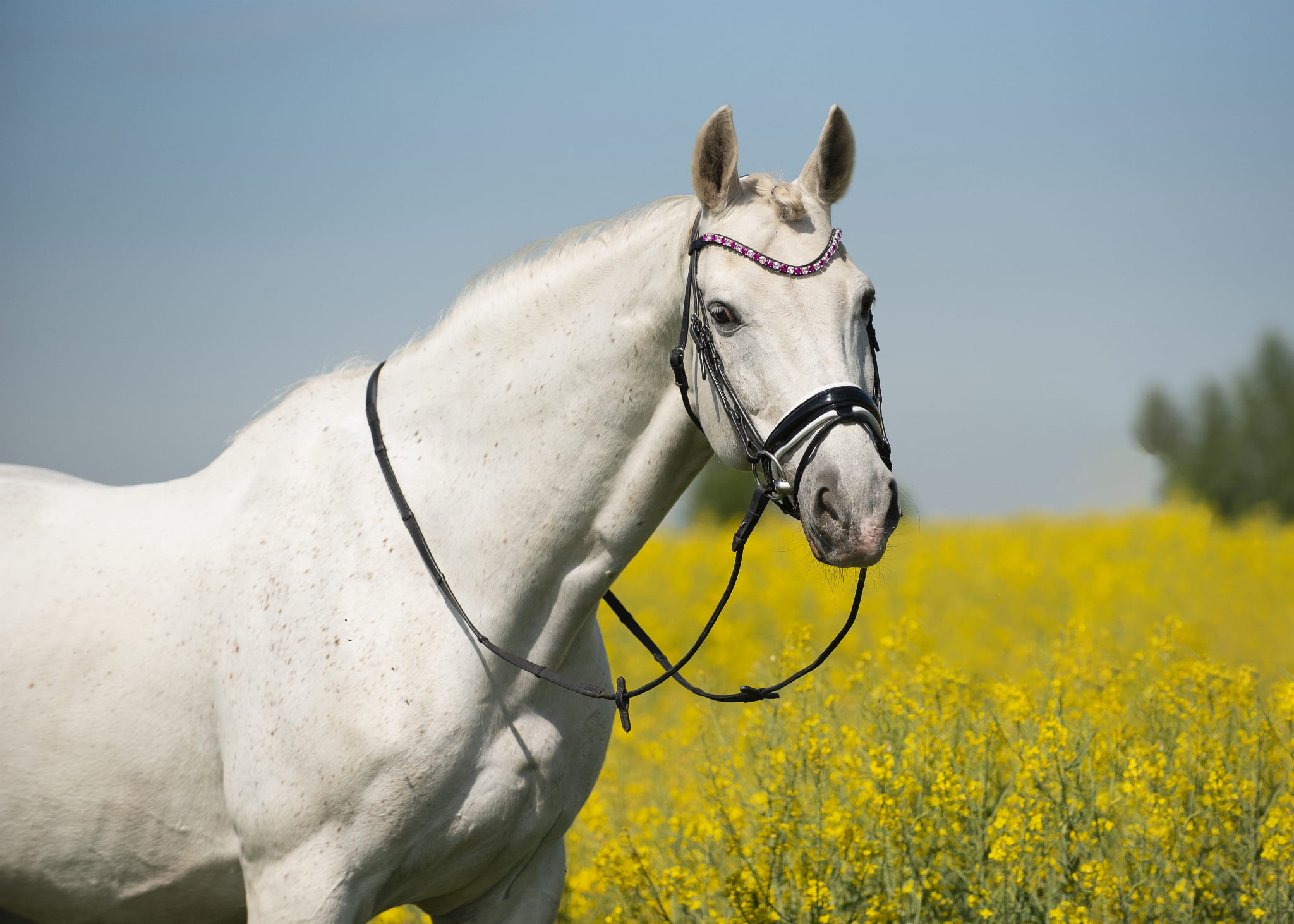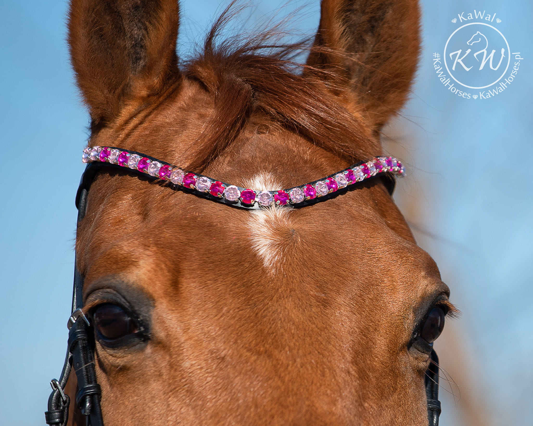 Czarne ogłowie z szerokim, matowym, rurkowym nachrapnikiem szwedzkim, miękko podszytym skórą w kolorze białym oraz mocno opadającym naczółkiem ozdobionym dużymi kryształkami w kolorze jasnoróżowym oraz fuksjowym. Anatomiczna, profilowana potylica posiada miękkie podszycie z białej skóry.