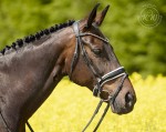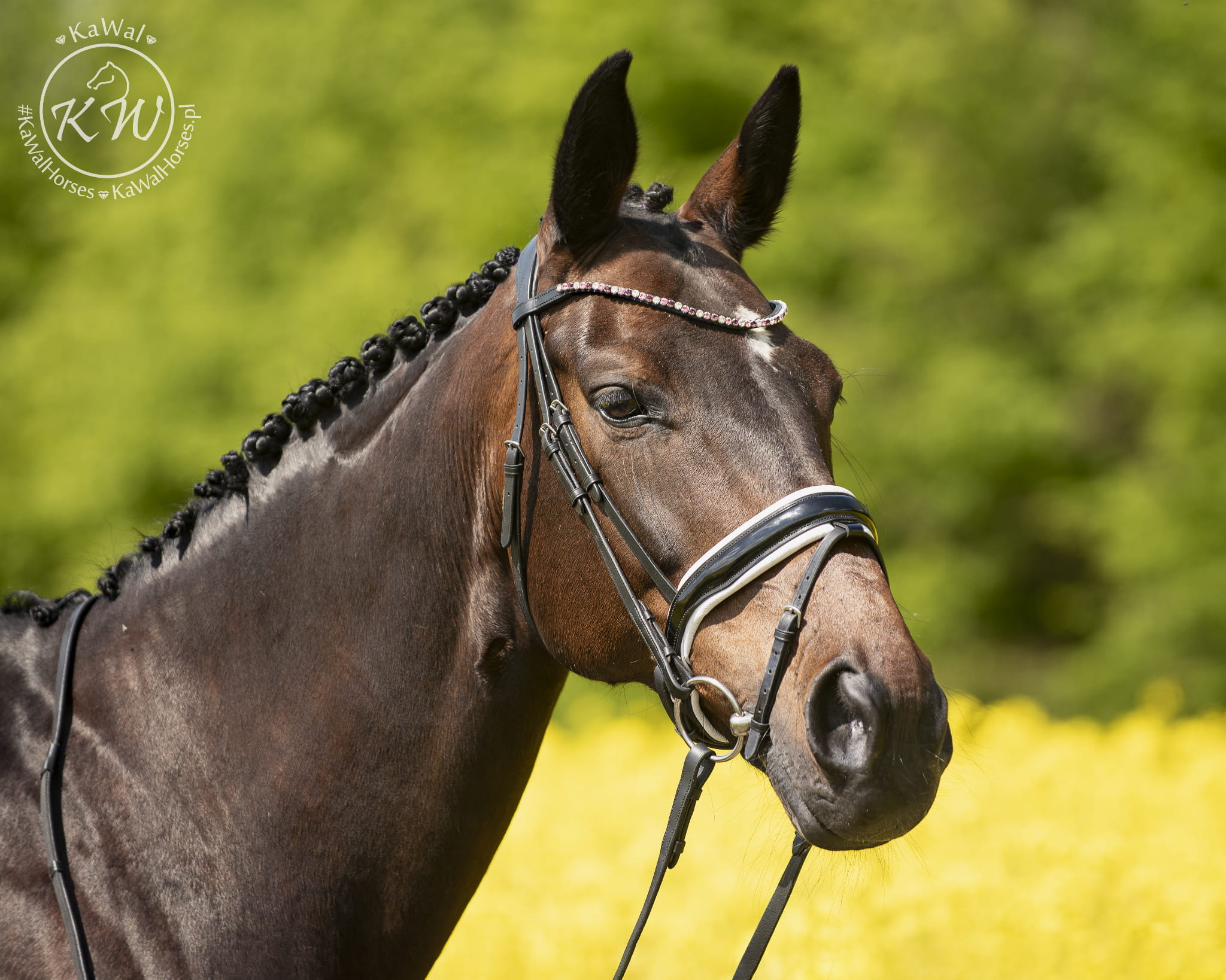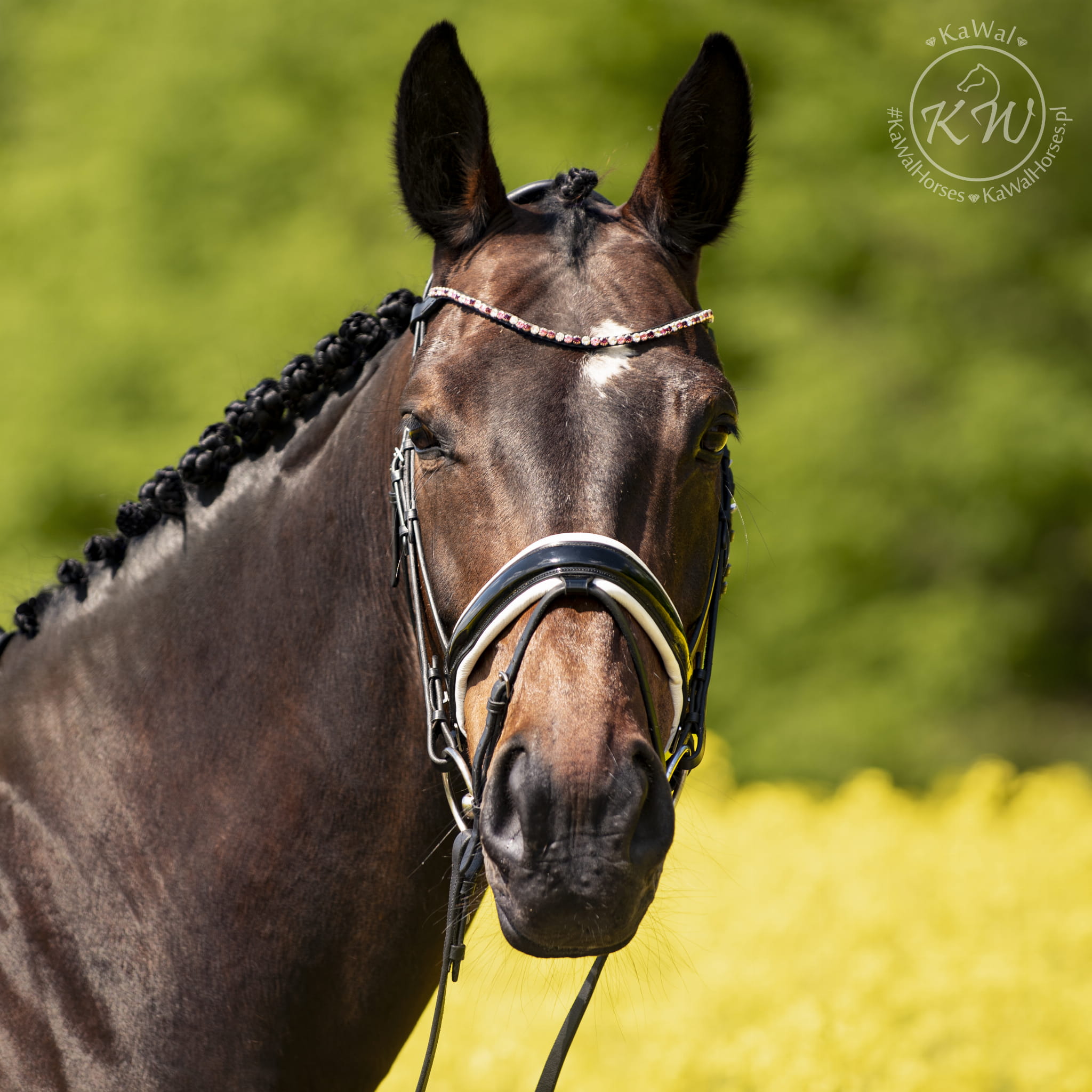 Czarne ogłowie z szerokim, lakierowanym nachrapnikiem szwedzkim, miękko podszytym skórą w kolorze białym oraz opadającym podszytym czarną skórą, mocno opadającym naczółkiem ozdobionym kryształkami w odcieniach bieli, delikatnego różu oraz fioletu. Anatomiczna, profilowana potylica posiada miękkie podszycie z czarnej skóry.