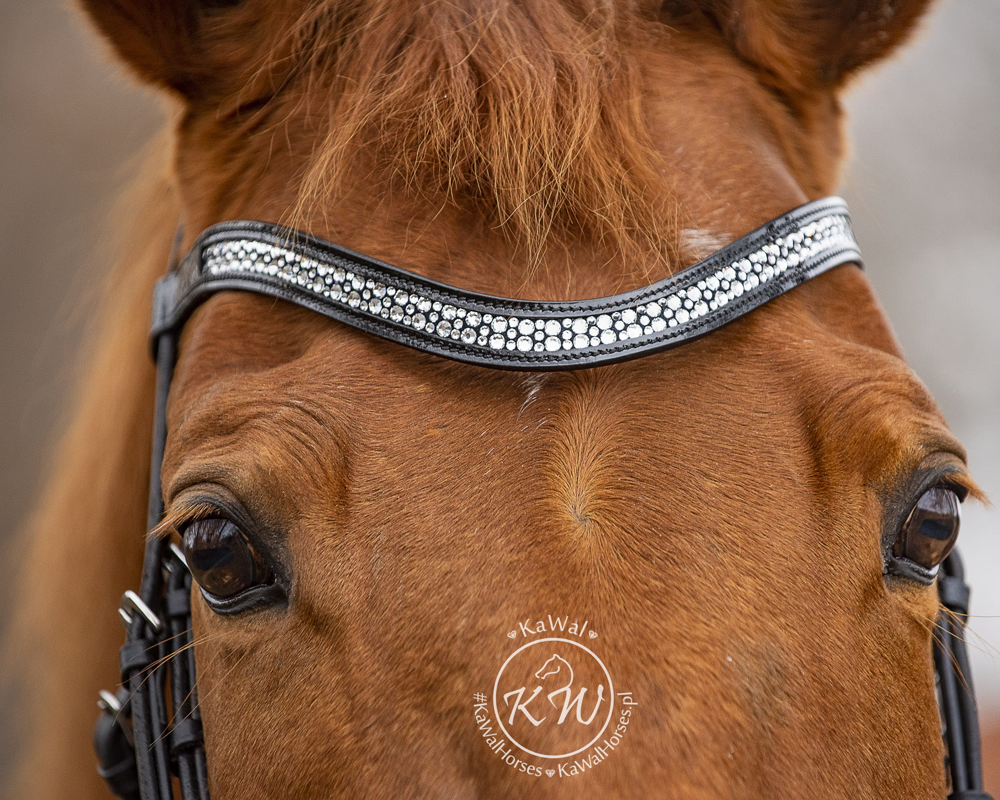 Czarne ogłowie z szerokim, lakierowanym nachrapnikiem szwedzkim, miękko podszytym skórą w kolorze czarnym oraz lakierowanym naczółkiem podszytym czarną skórą i ozdobionym kryształkami różnej wielkości,w kolorze srebrnym. Naczółek bardzo mocno mieni się w słońcu, a jednocześnie, dzięki sposobie mocowania kryształków, wyróżnia się trwałością. Anatomiczna, profilowana potylica posiada miękkie podszycie z czarnej skóry.