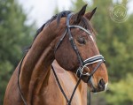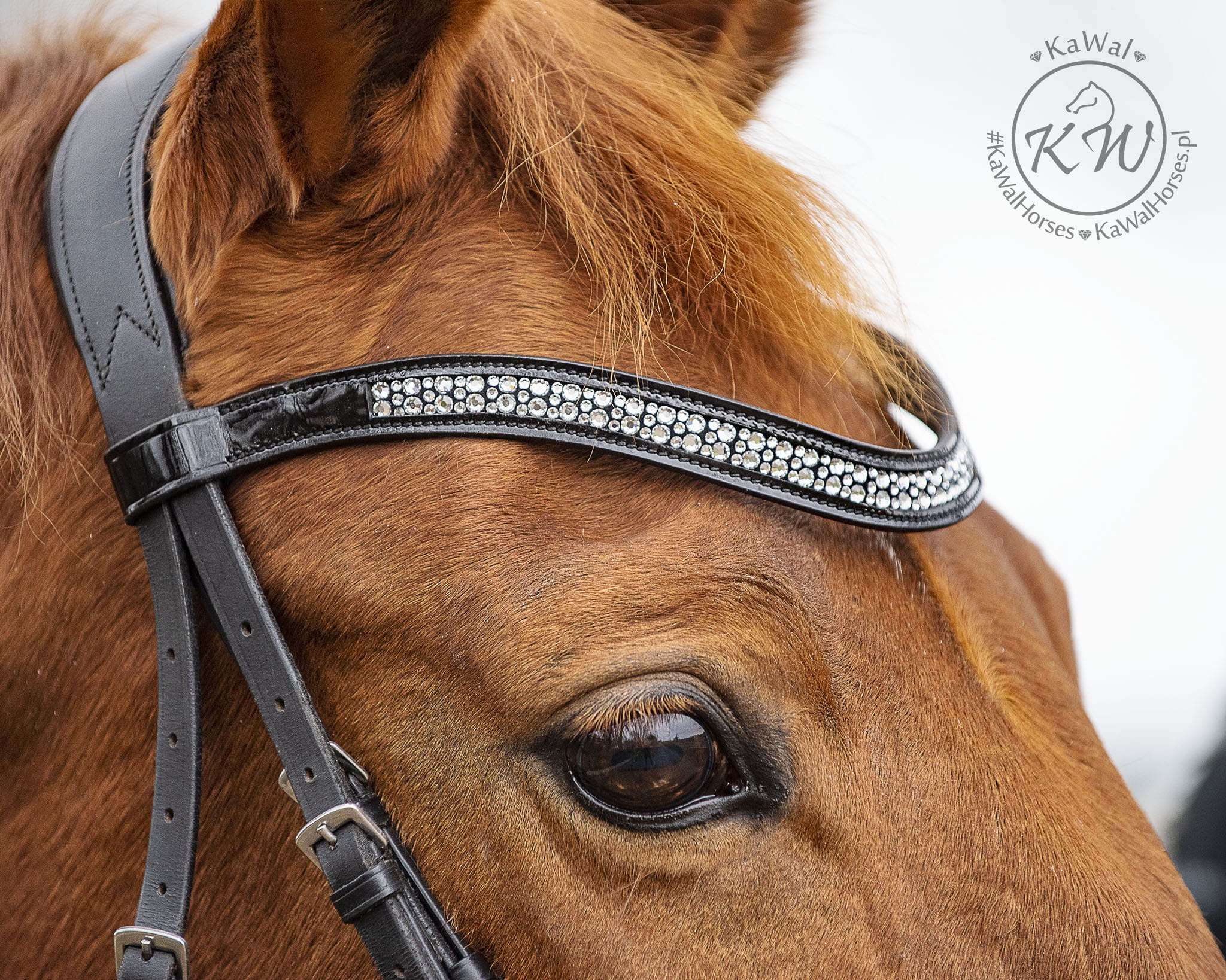 Czarne ogłowie z szerokim, lakierowanym nachrapnikiem szwedzkim, miękko podszytym skórą w kolorze białym oraz lakierowanym naczółkiem podszytym czarną skórą i ozdobionym kryształkami różnej wielkości,w kolorze srebrnym. Naczółek bardzo mocno mieni się w słońcu, a jednocześnie, dzięki sposobie mocowania kryształków, wyróżnia się trwałością. Anatomiczna, profilowana potylica posiada miękkie podszycie z czarnej skóry.