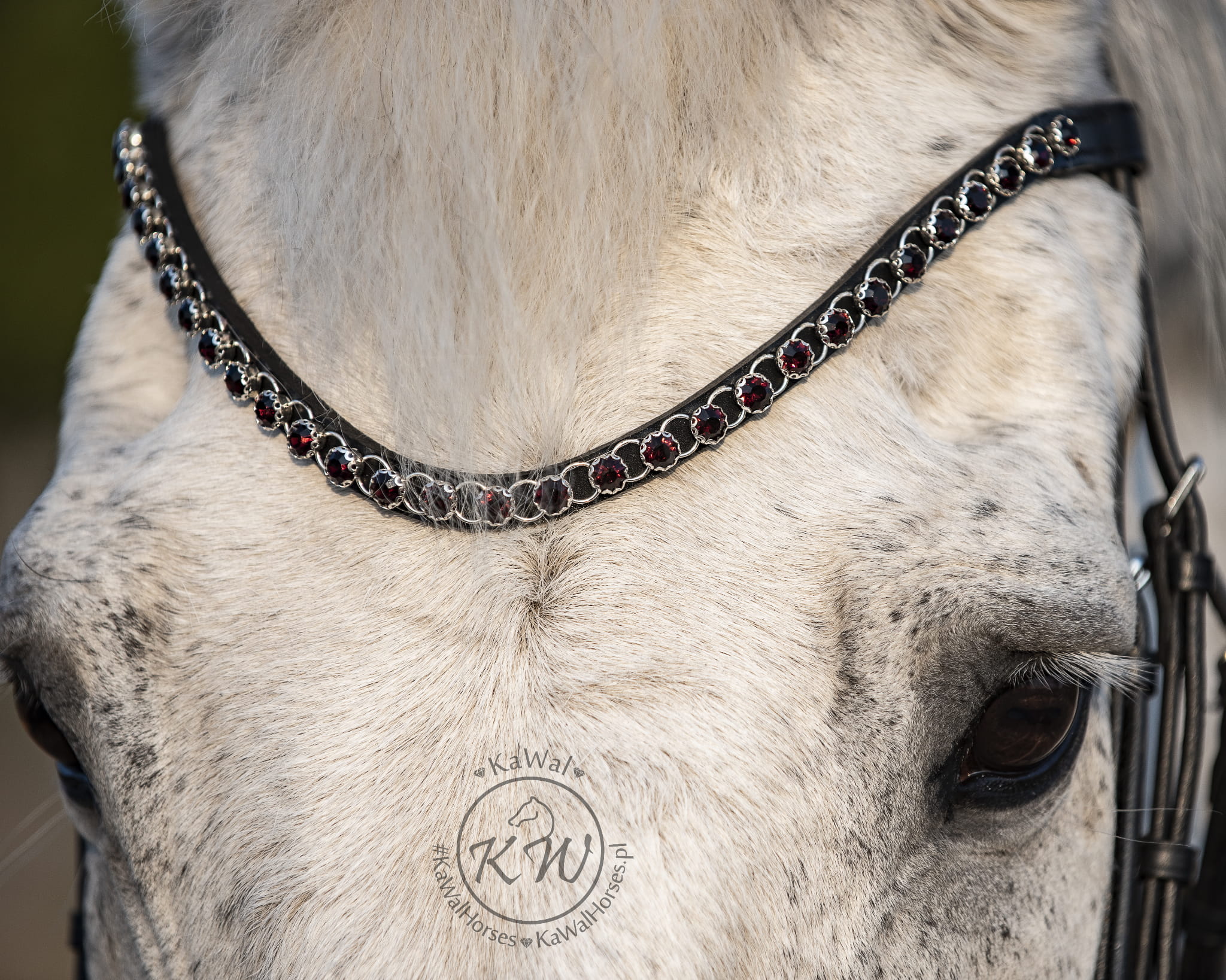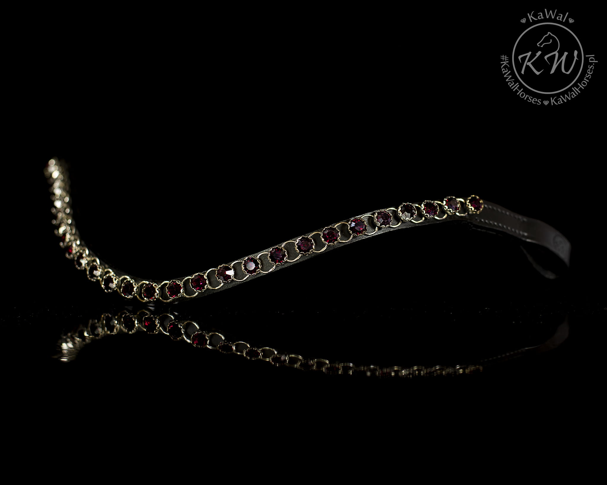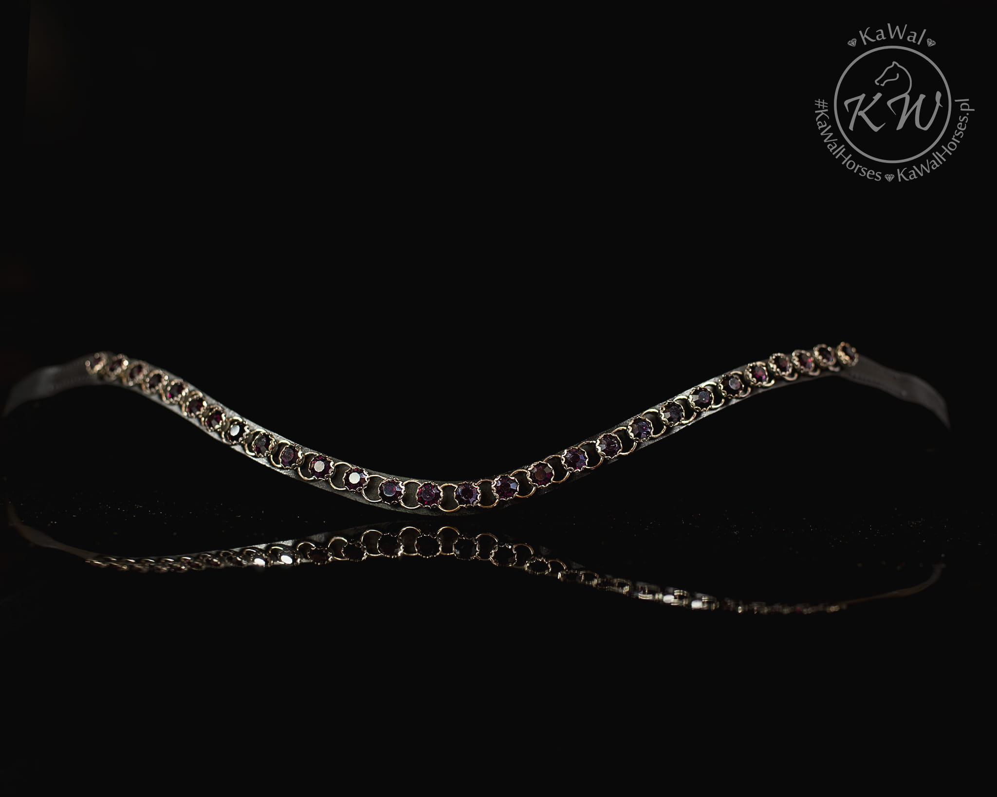 Czarne ogłowie z szerokim, lakierowanym nachrapnikiem szwedzkim, miękko podszytym skórą w kolorze czarnym oraz mocno opadającym, naczółkiem ozdobionym kryształkami w kolorze purpurowo-bordowym. Anatomiczna, profilowana potylica posiada miękkie podszycie z czarnej skóry.