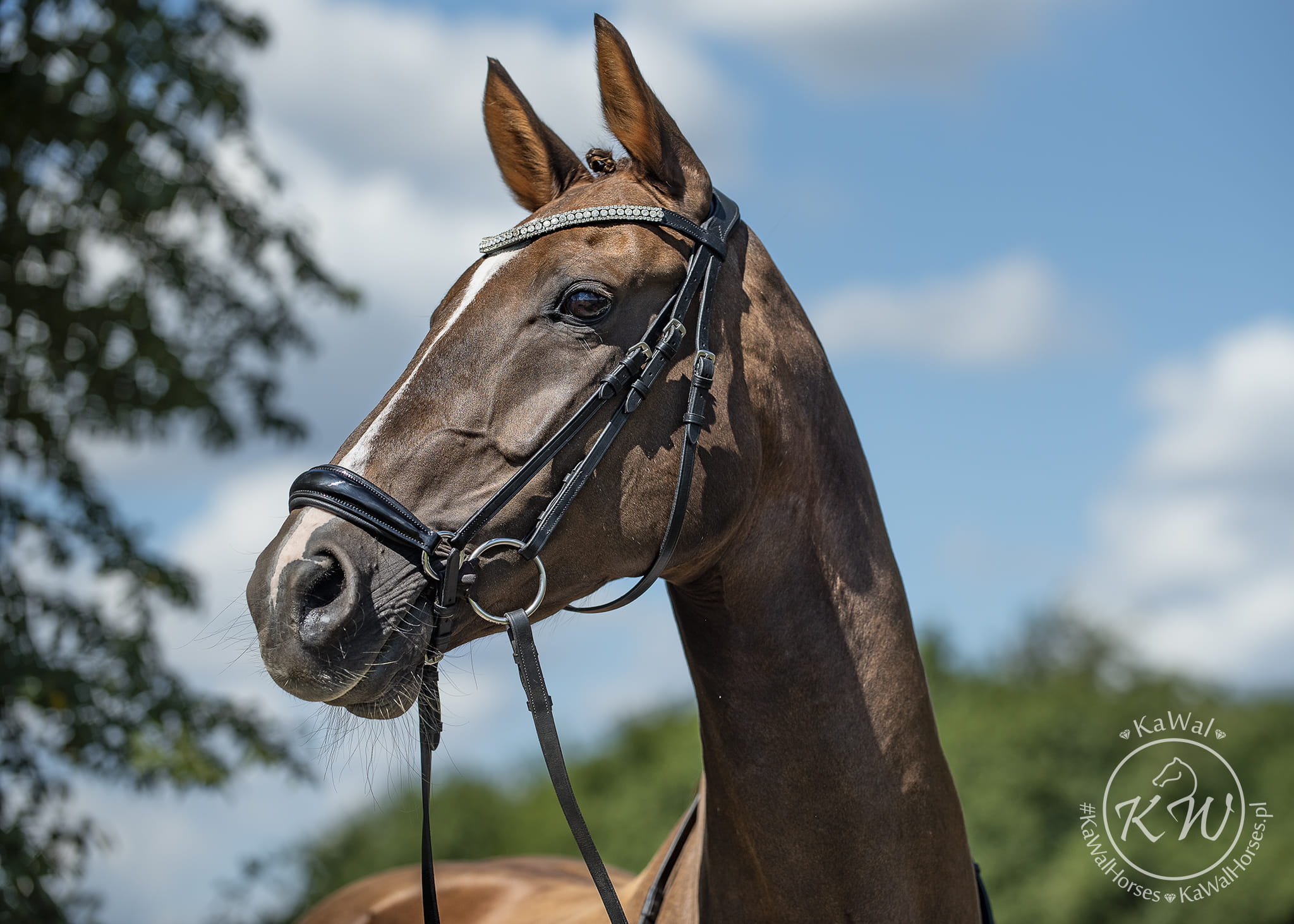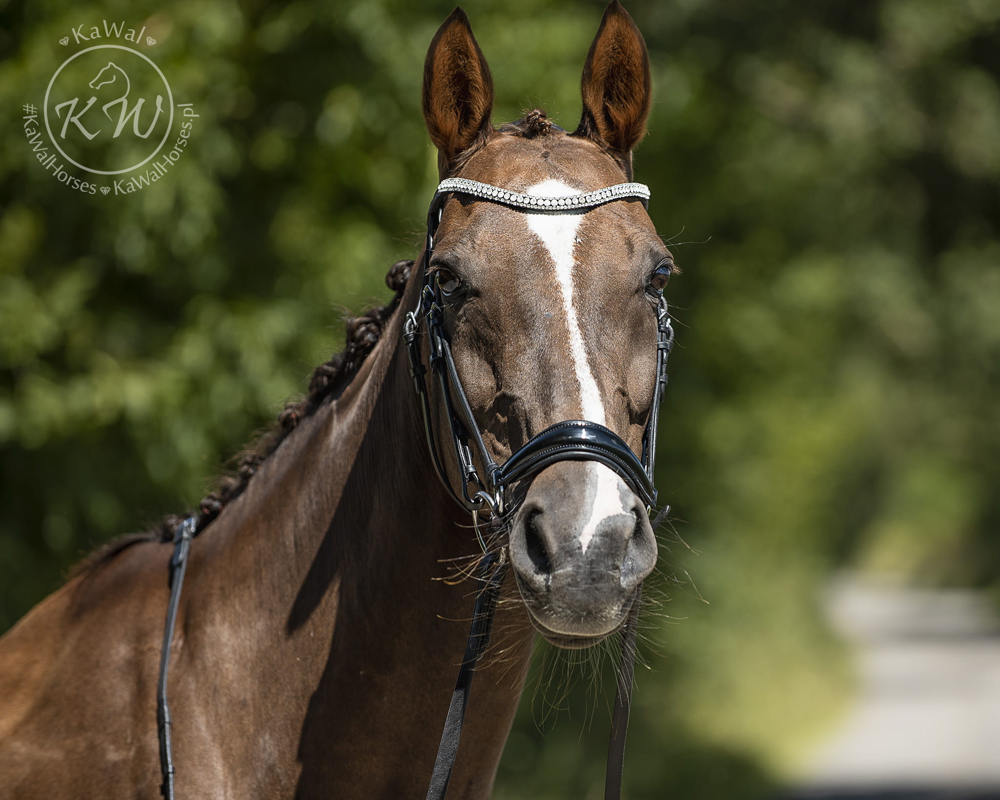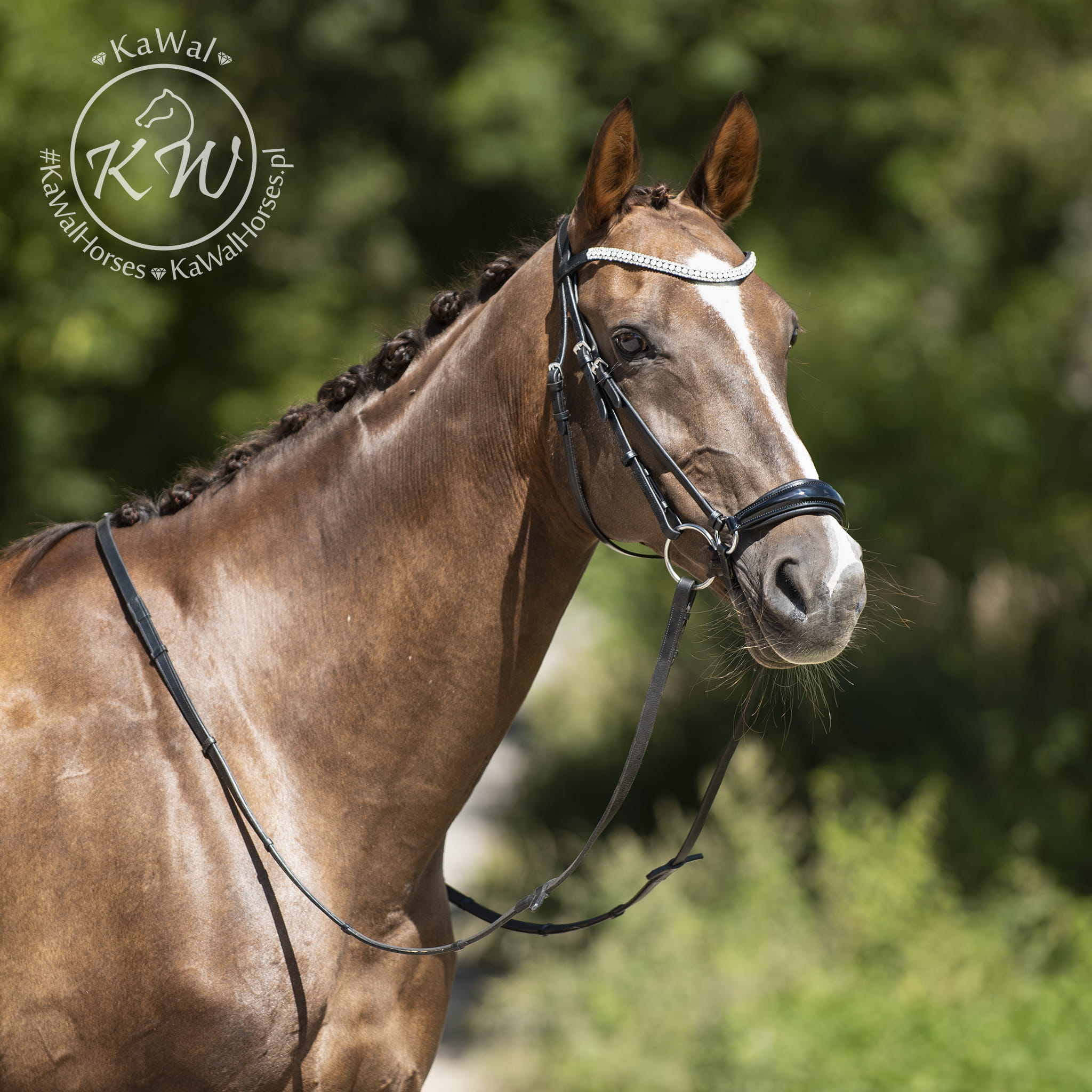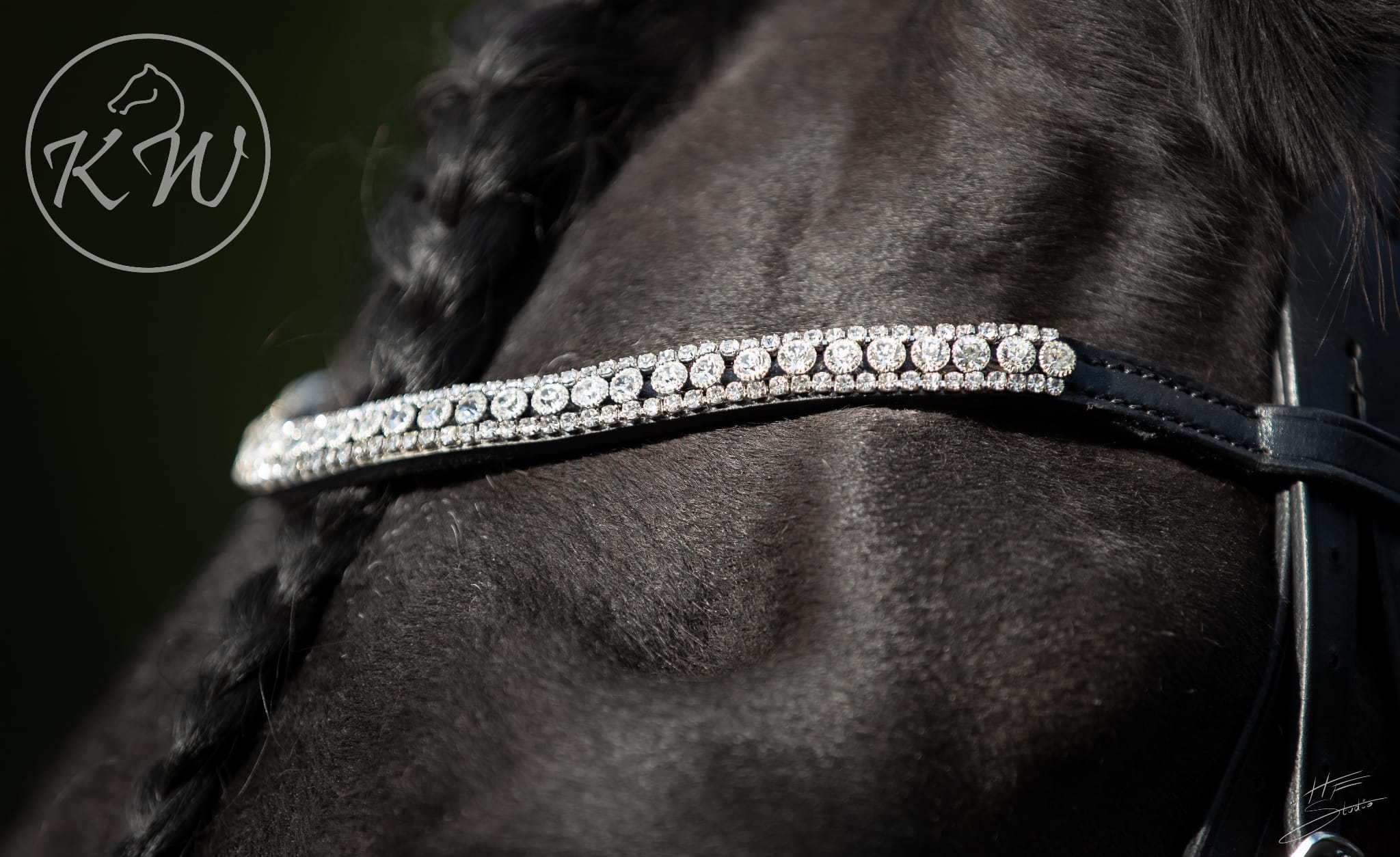 Czarne ogłowie z szerokim, lakierowanym, nachrapnikiem hanowerskim, miękko podszytym skórą w kolorze czarnym oraz mocno opadającym naczółkiem ozdobionym białymi kryształkami. Anatomiczna, profilowana potylica posiada miękkie podszycie z czarnej skóry.