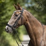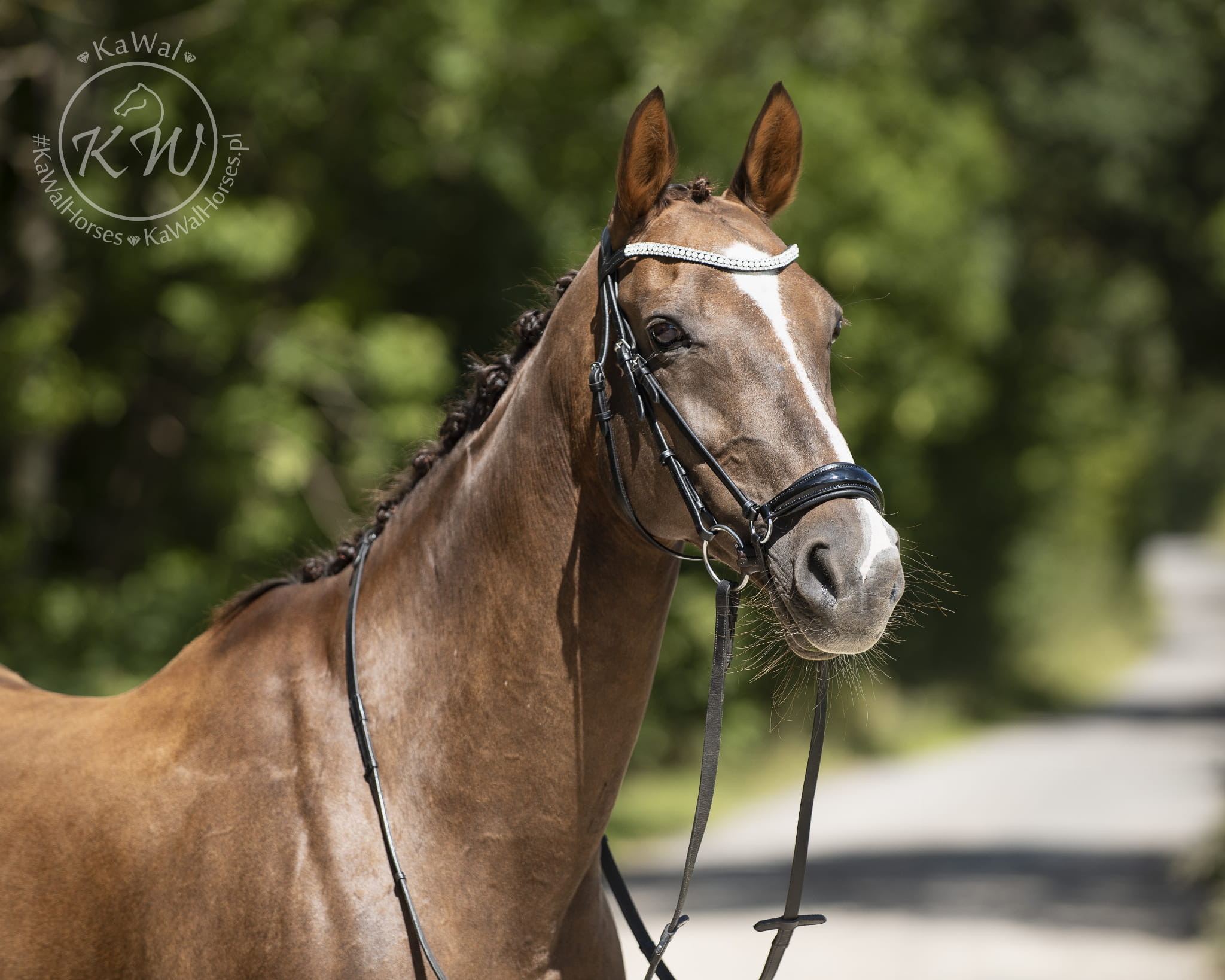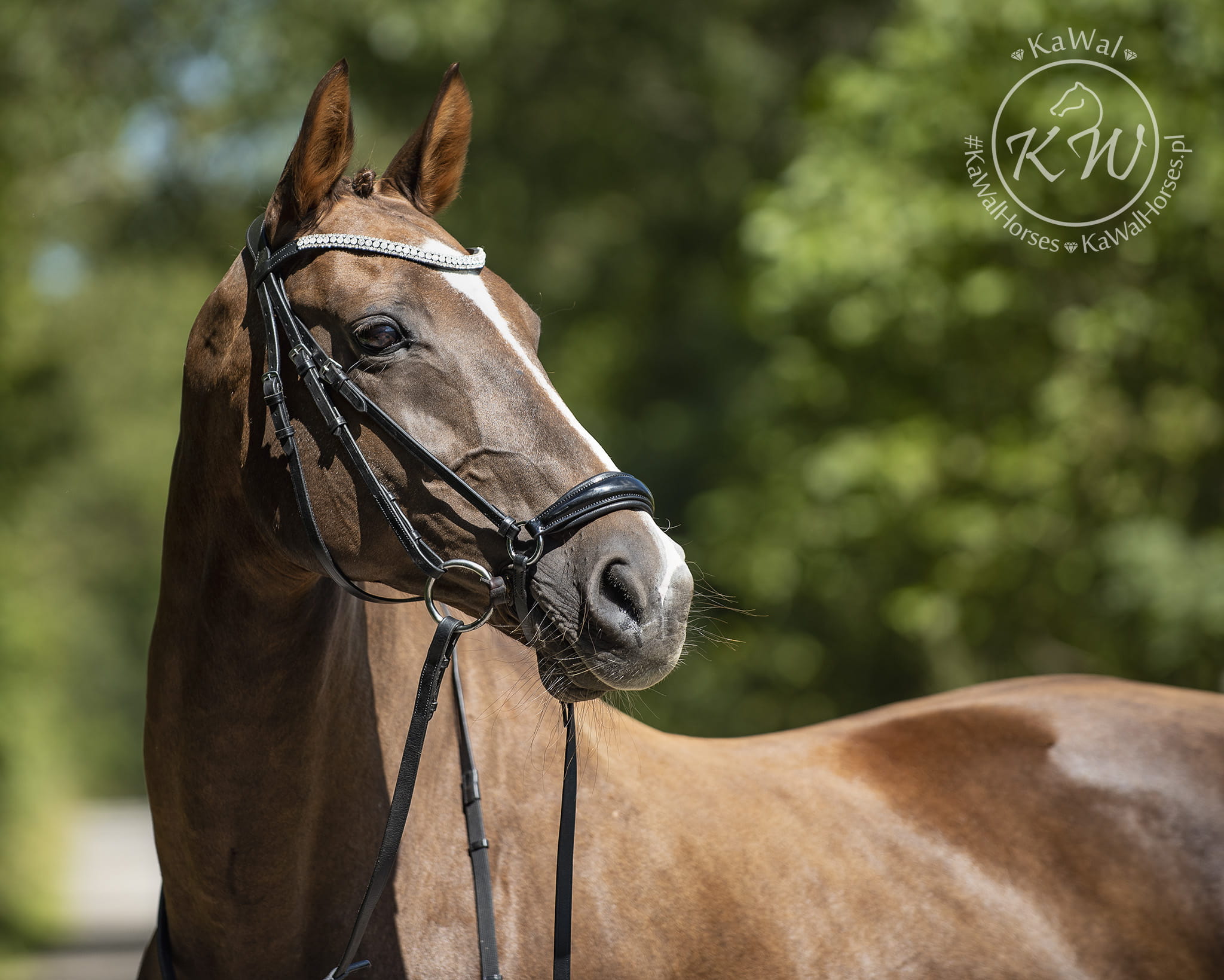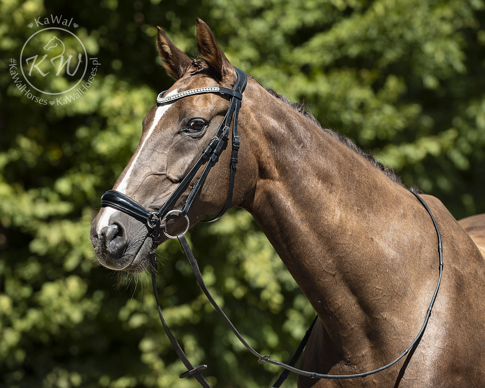 Czarne ogłowie z szerokim, lakierowanym, nachrapnikiem hanowerskim, miękko podszytym skórą w kolorze czarnym oraz mocno opadającym naczółkiem ozdobionym białymi kryształkami. Anatomiczna, profilowana potylica posiada miękkie podszycie z czarnej skóry.
