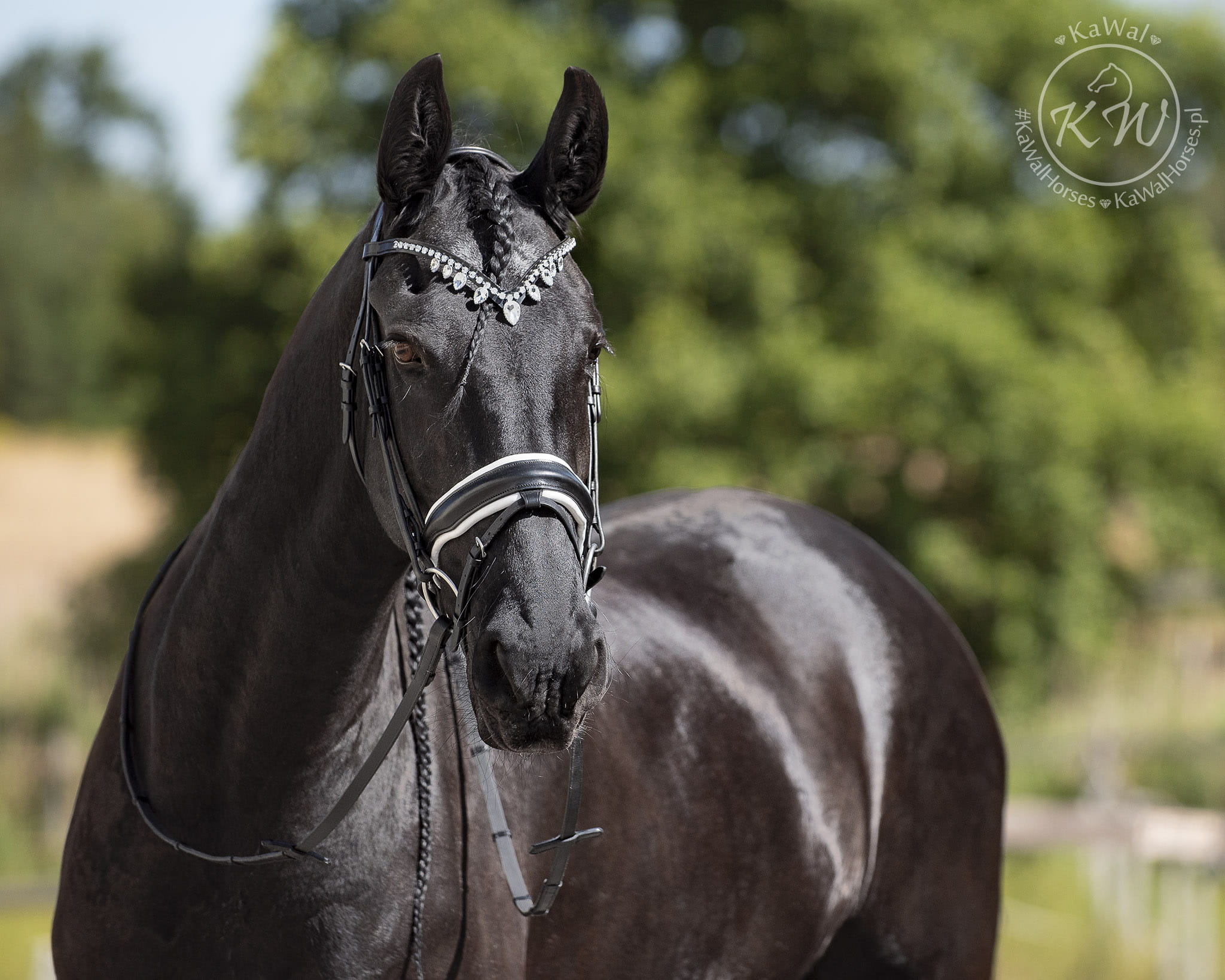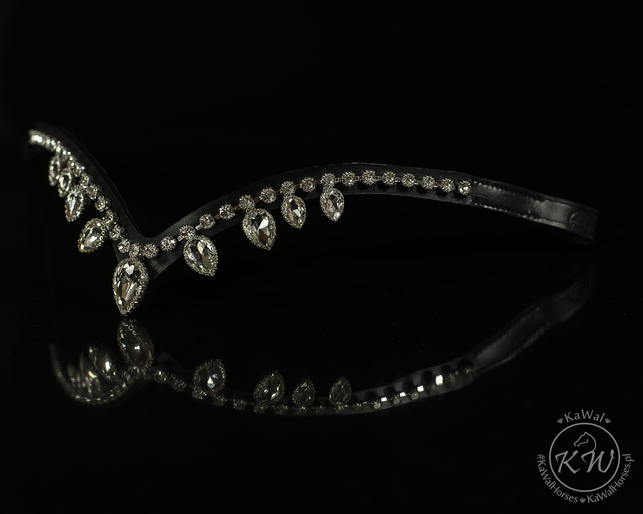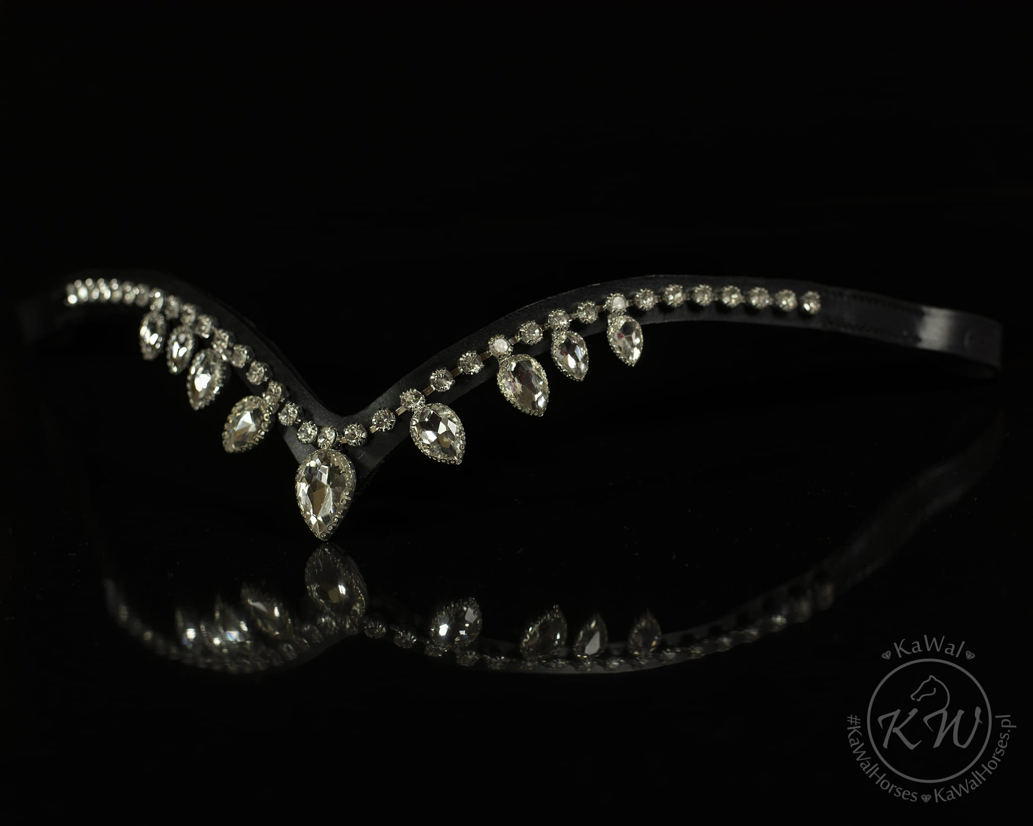 Czarne ogłowie z wyjątkowym naczółkiem w kształcie litery V ozdobionym bardzo błyszczącymi kryształkami w kolorze biało-srebrnym w srebrnych oprawkach oraz z szerokim,matowym nachrapnikiem szwedzkim miękko podszytym skórą w kolorze białym. Profilowany nagłówek i nachrapnik zostały miękko podszyte czarną skórą.