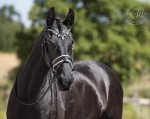 Czarne ogłowie z wyjątkowym naczółkiem w kształcie litery V ozdobionym bardzo błyszczącymi kryształkami w kolorze biało-srebrnym w srebrnych oprawkach oraz z szerokimmatowym nachrapnikiem szwedzkim miękko podszytym skórą w kolorze białym. Profilowany nagłówek i nachrapnik zostały miękko podszyte czarną skórą.