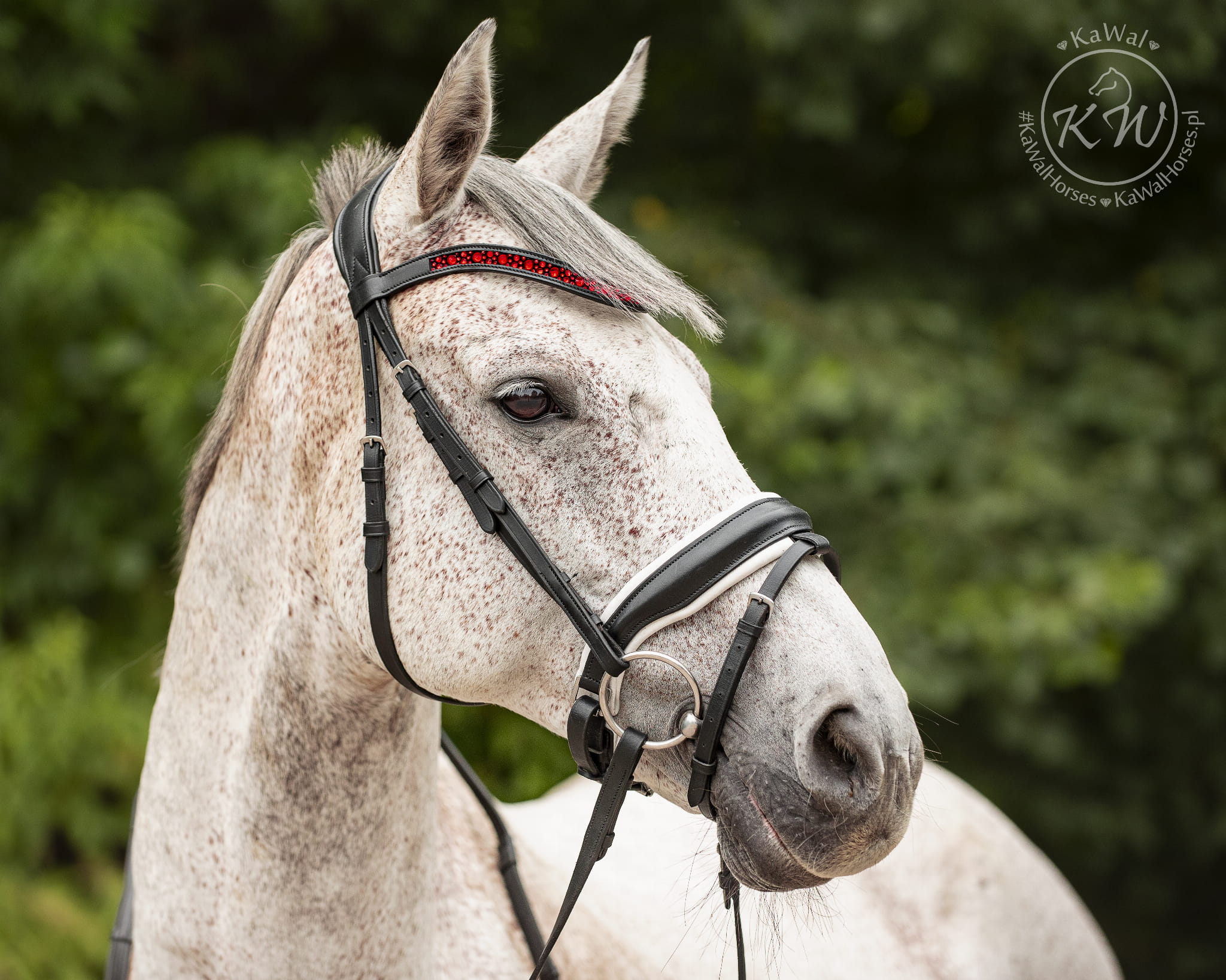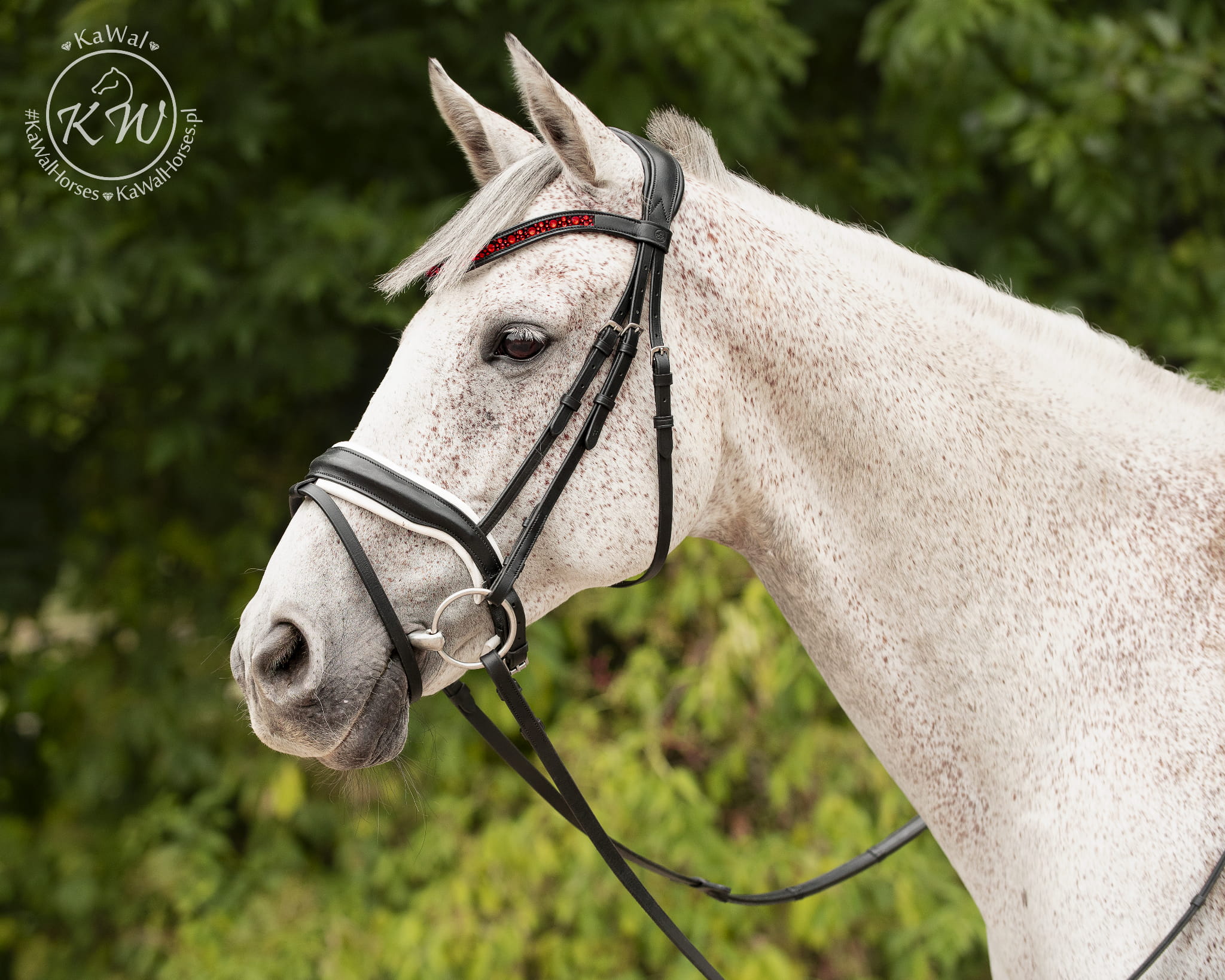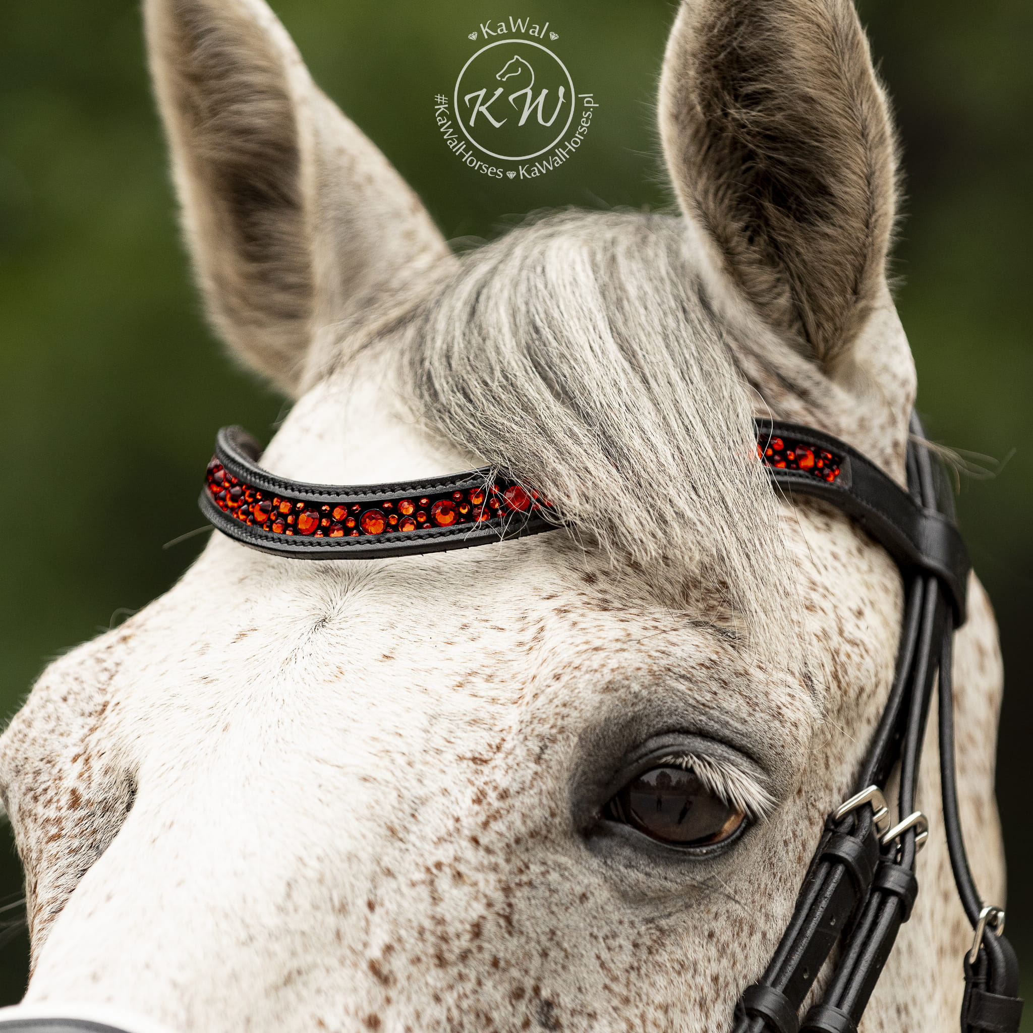 Czarne ogłowie z szerokim, lakierowanym nachrapnikiem szwedzkim, miękko podszytym skórą w kolorze białym oraz opadającym, bardzo wytrzymałym naczółkiem ze średniej wielkości kryształkami bez oprawek, w kolorze intensywnegj czerwieni, umieszczonymi na taśmie nośnej oraz szeroko podszytym czarną skórą. Anatomiczna, profilowana potylica posiada miękkie podszycie z czarnej skóry.