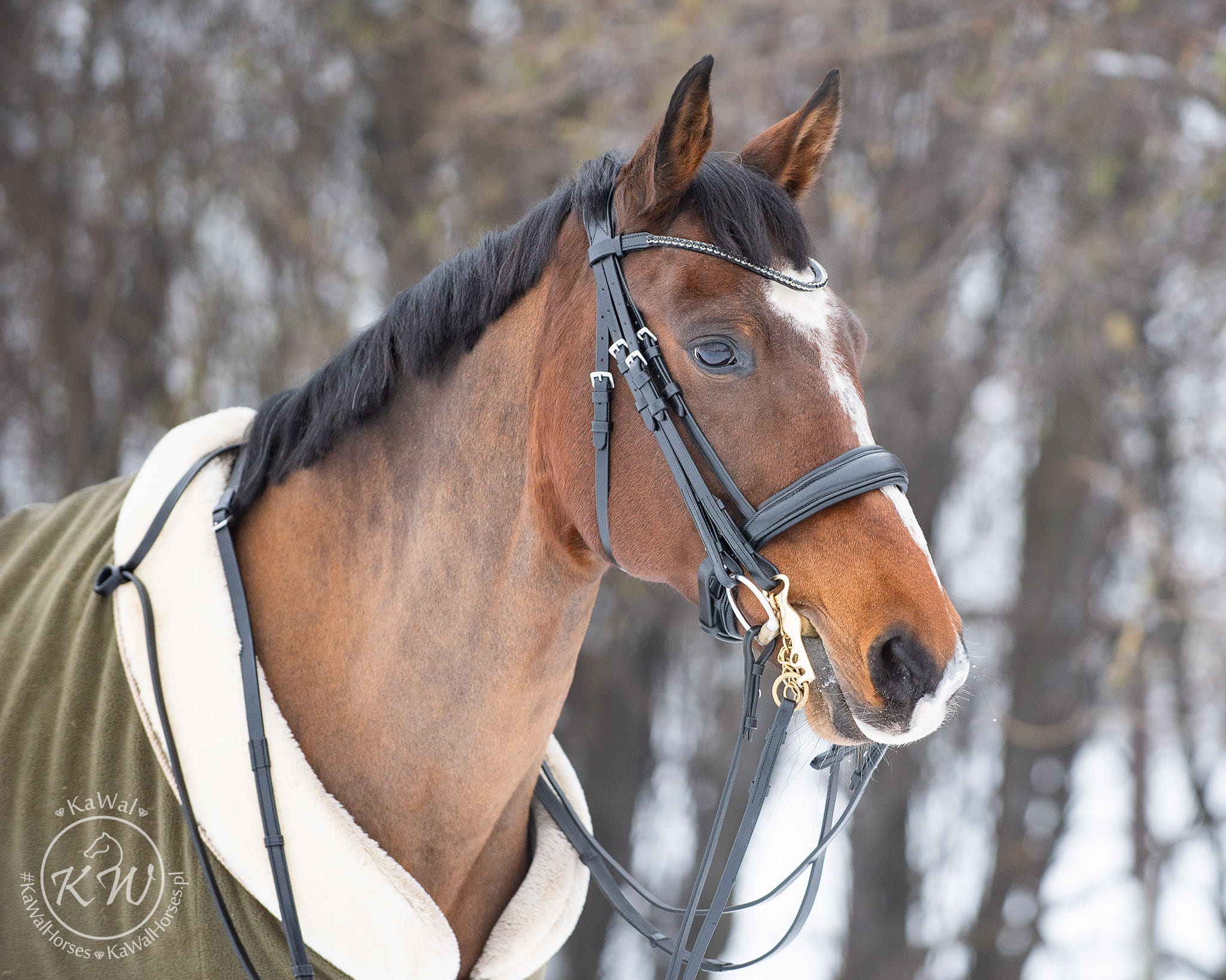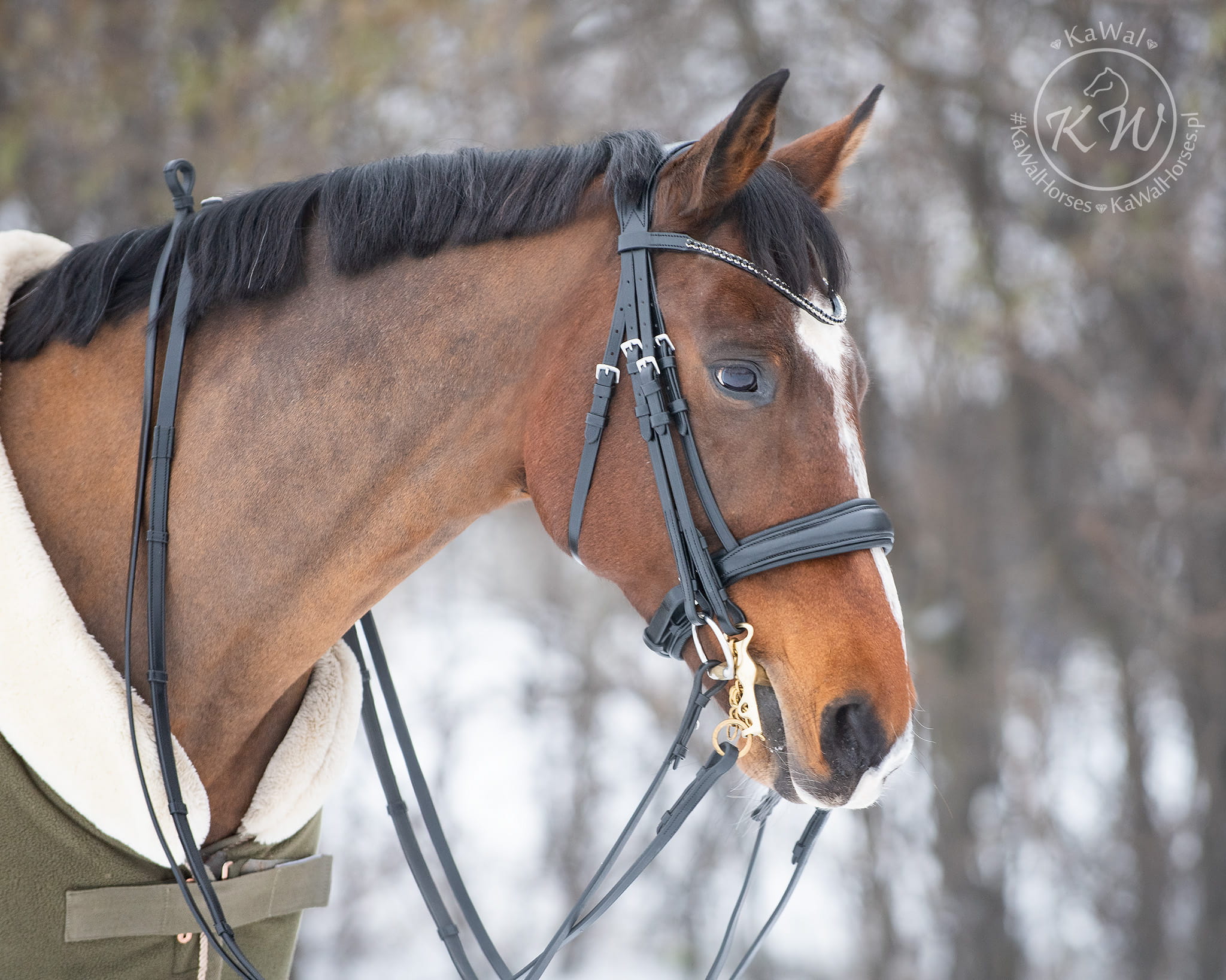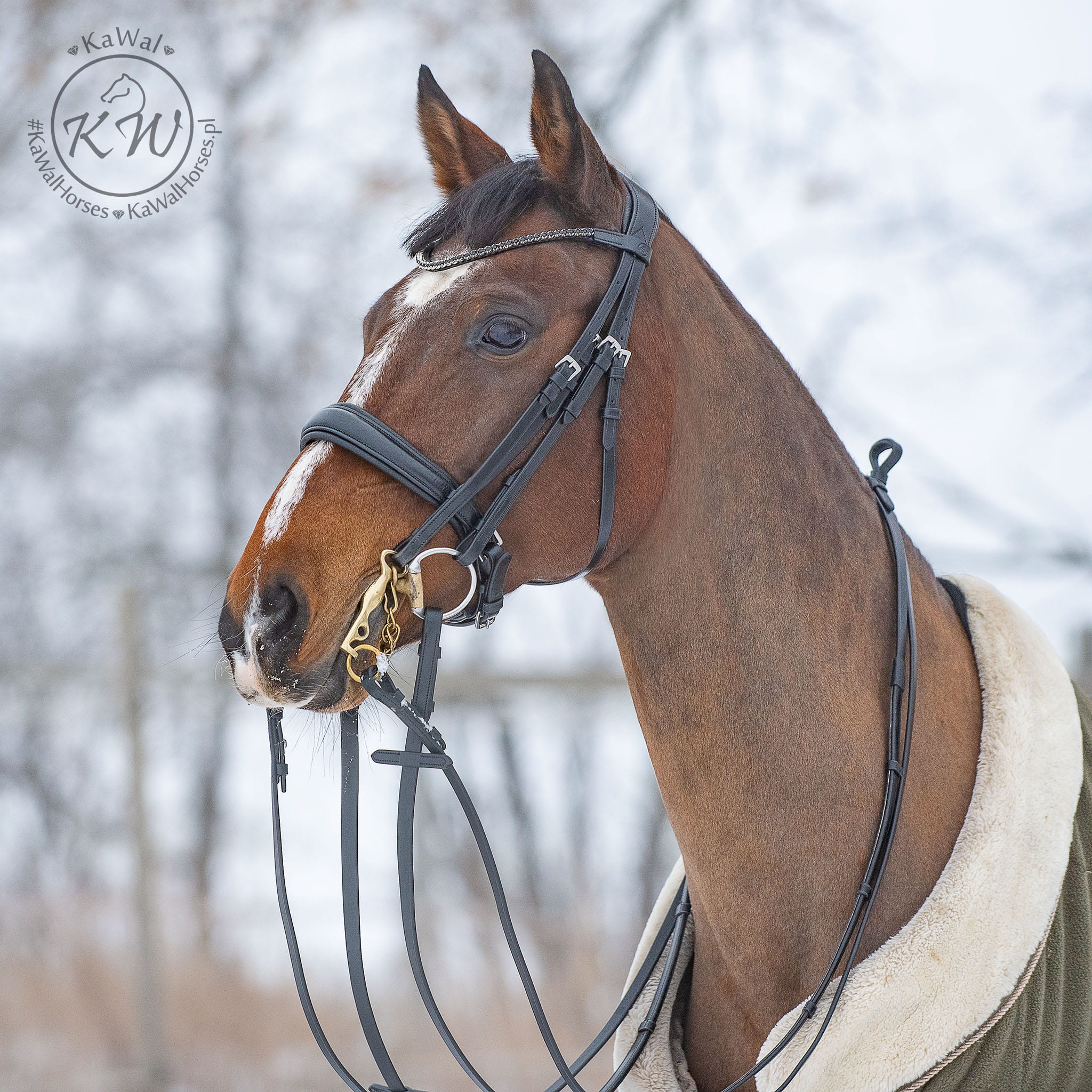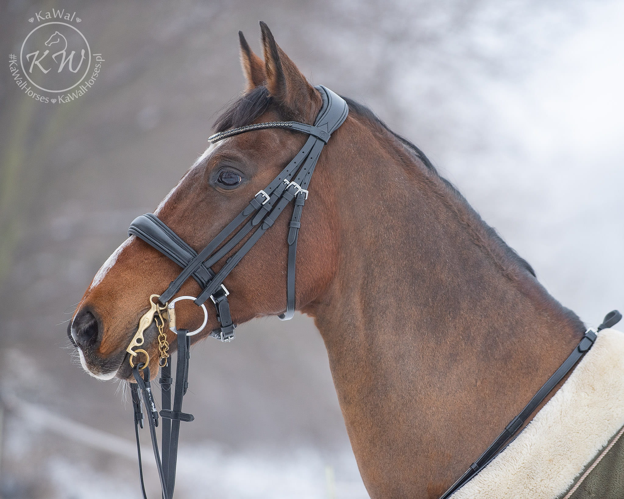 Ogłowie munsztukowe z szerokim, matowym nachrapnikiem, miękko podszytym czarną skórą. Naczółek ozdobiony czarnymi kryształkami. Ogłowie posiada szeroki, profilowany, miękko podszyty nagłówek.