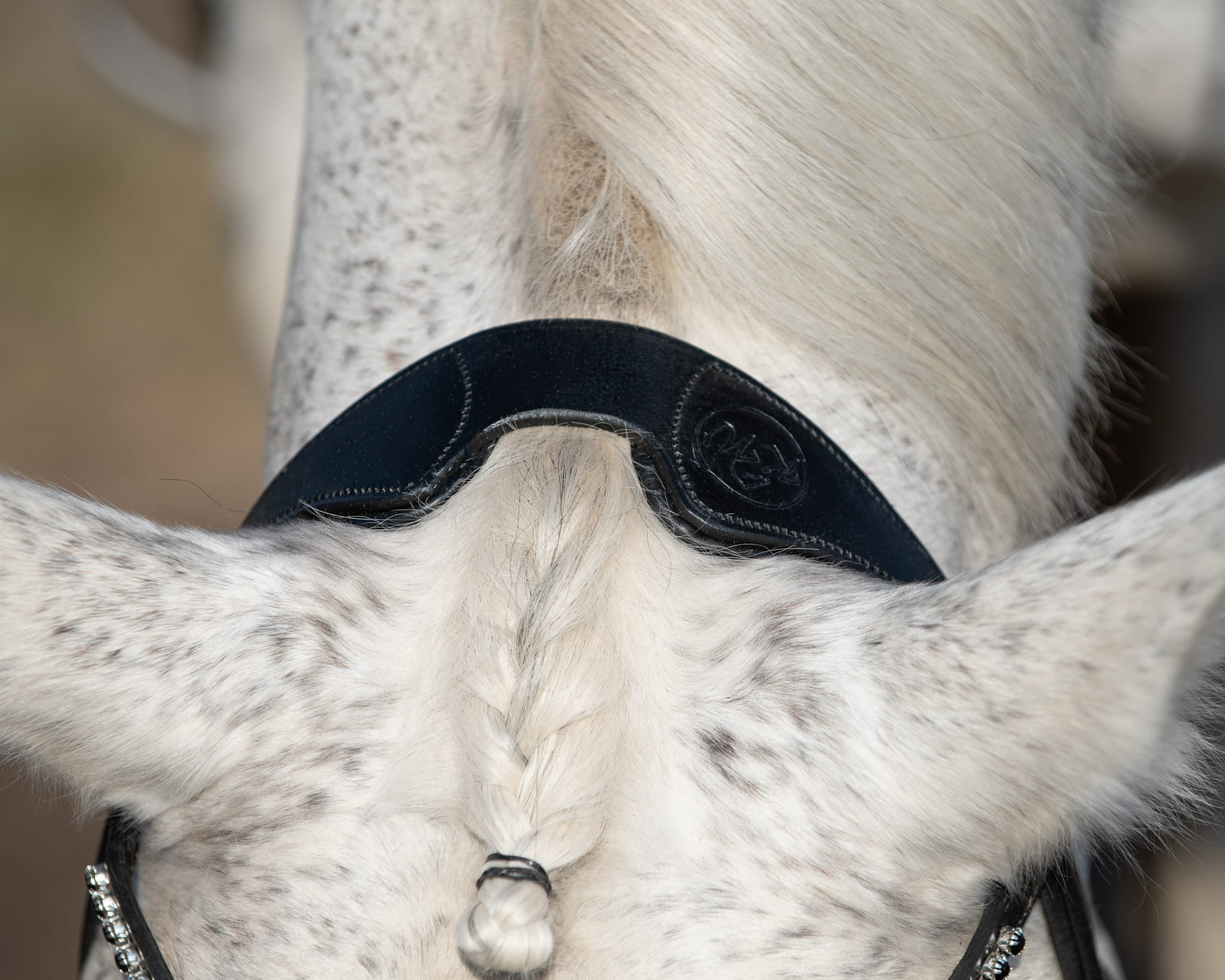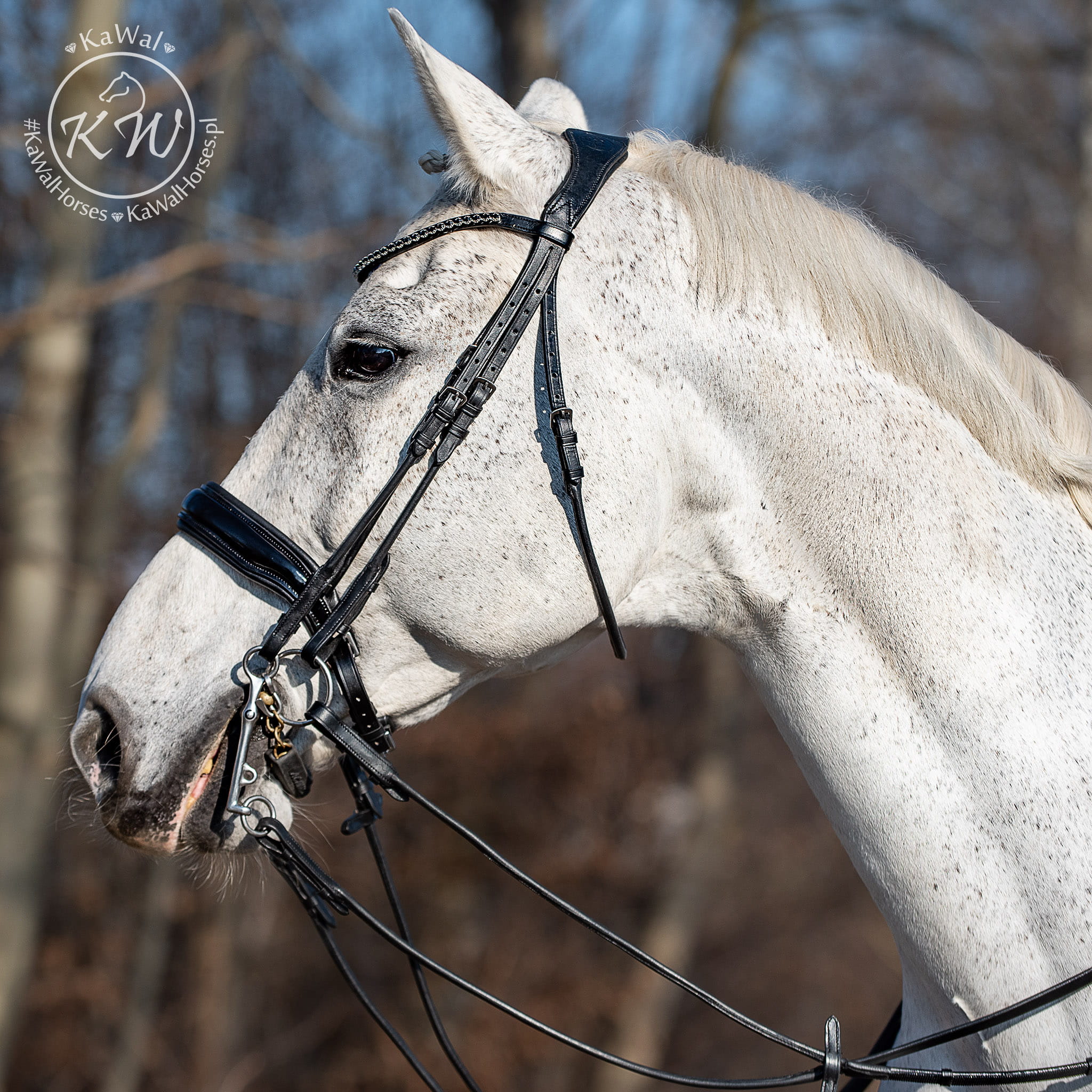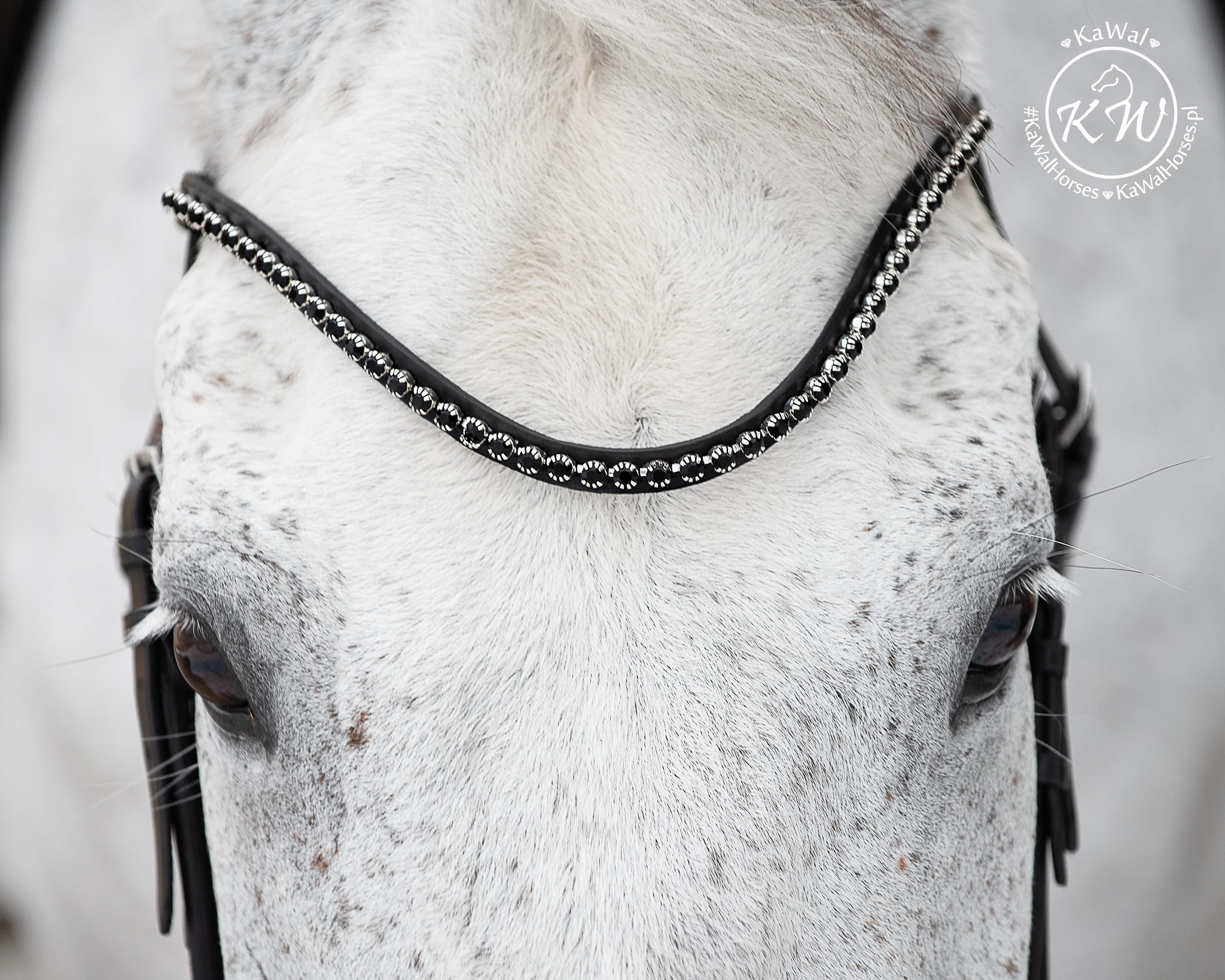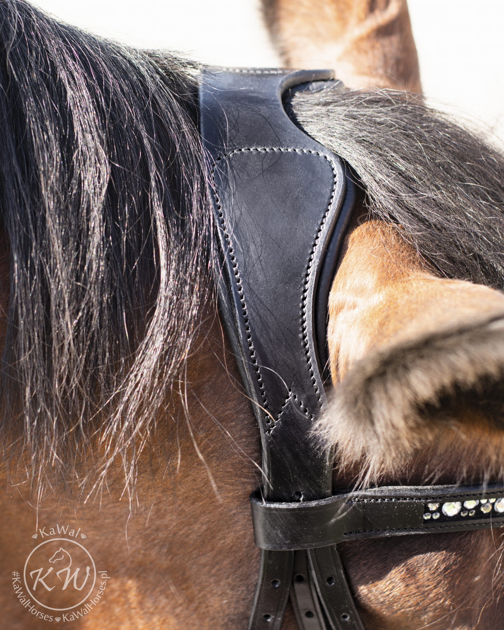 Rurkowe ogłowie munsztukowe z szerokim, lakierowanym nachrapnikiem, miękko podszytym czarną skórą. Mocno opadający naczółek ozdobiony został trzema rzędami białych, bardzo błyszczących kryształków Ogłowie posiada szeroką, profilowaną, miękko podszytą, anatomiczną część potyliczną, zaprojektowana specjalnie dla koni bardzo wrażliwych na ucisk w okolicy pierwszych kręgów szyjnych. Nagłówek posiada przerwę w środkowej części podszycia, leżącej nad kręgosłupem, co redukuje nacisk na potylicę.