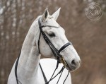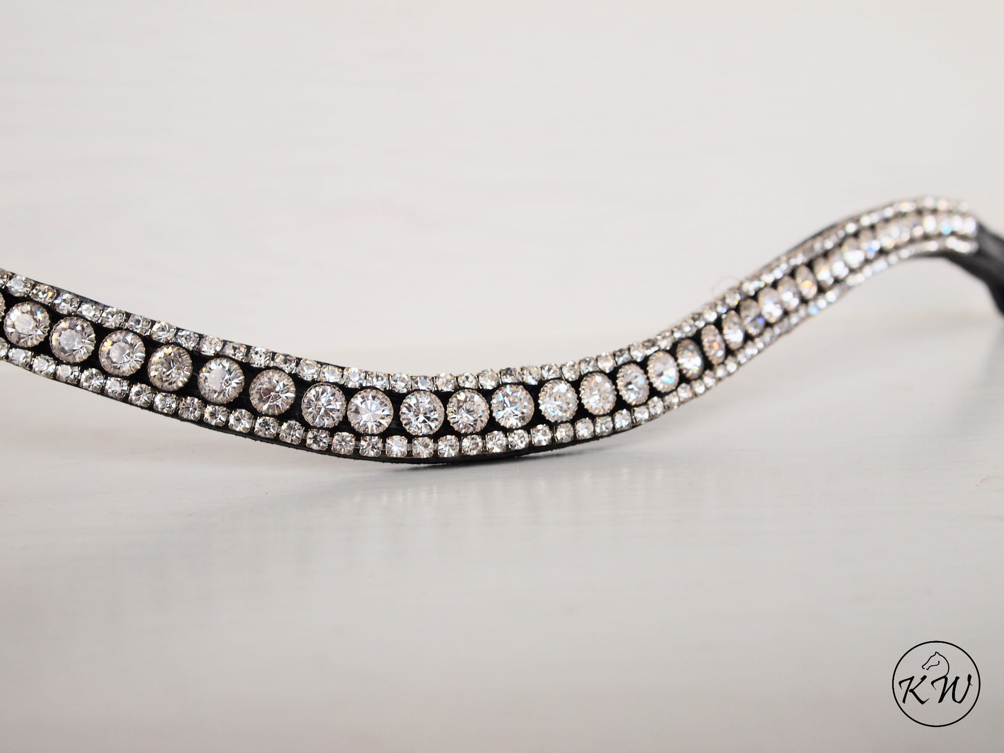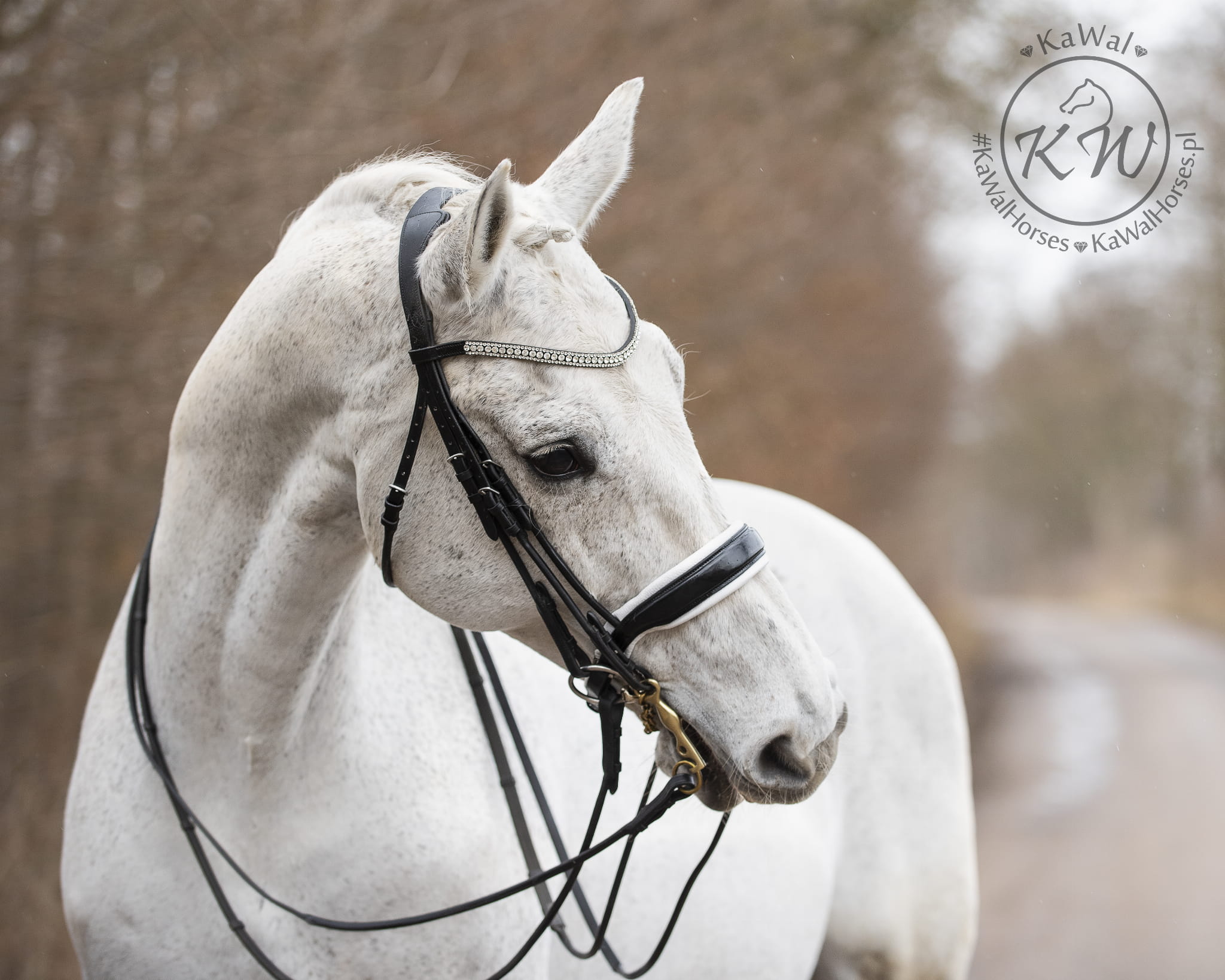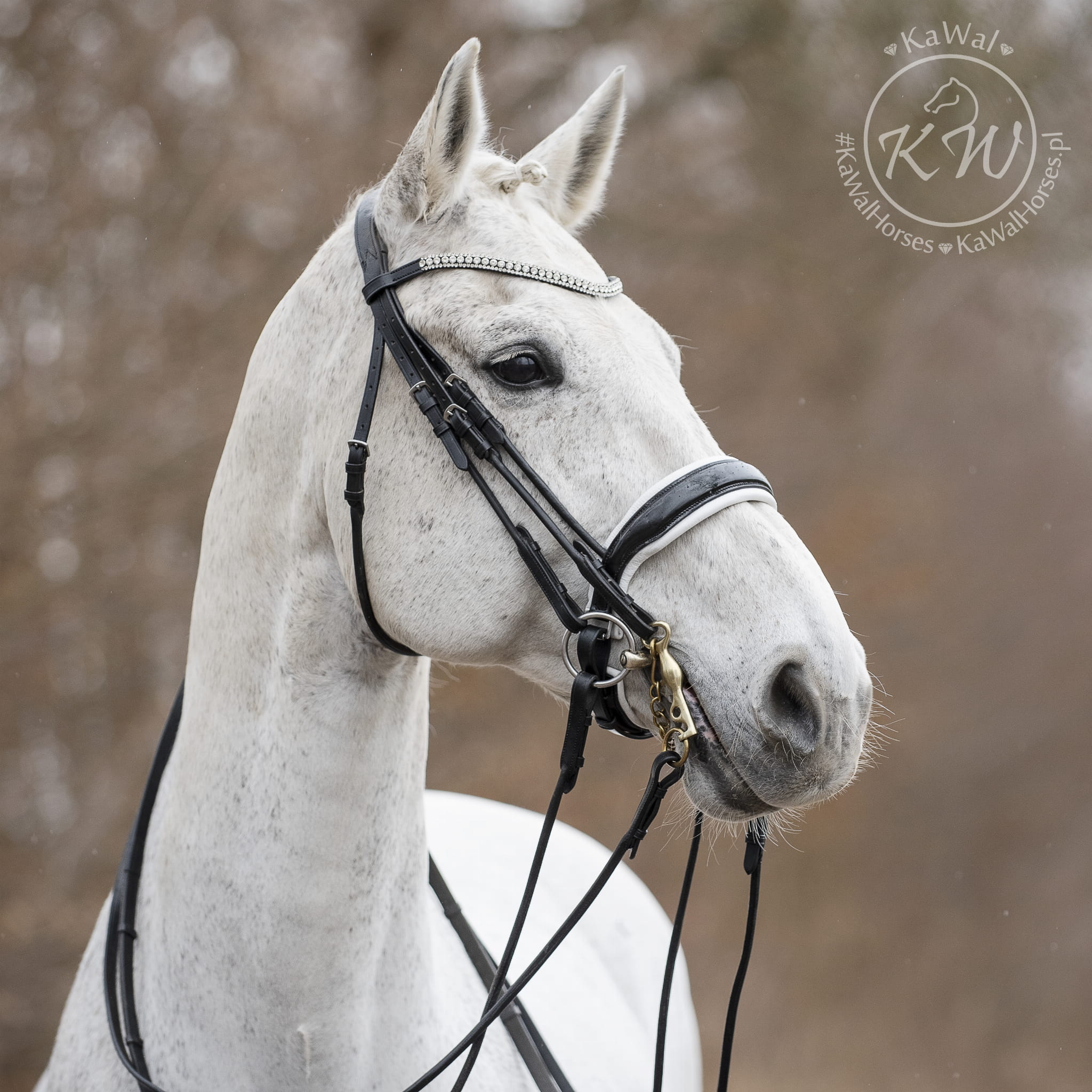 Rurkowe ogłowie munsztukowe z szerokim, lakierowanym nachrapnikiem, miękko podszytym białą skórą. Mocno opadający naczółek ozdobiony został trzema rzędami białych, bardzo błyszczących kryształków Ogłowie posiada szeroką, profilowaną, miękko podszytą, anatomiczną część potyliczną, zaprojektowana specjalnie dla koni bardzo wrażliwych na ucisk w okolicy pierwszych kręgów szyjnych. Nagłówek posiada przerwę w środkowej części podszycia, leżącej nad kręgosłupem, co redukuje nacisk na potylicę.