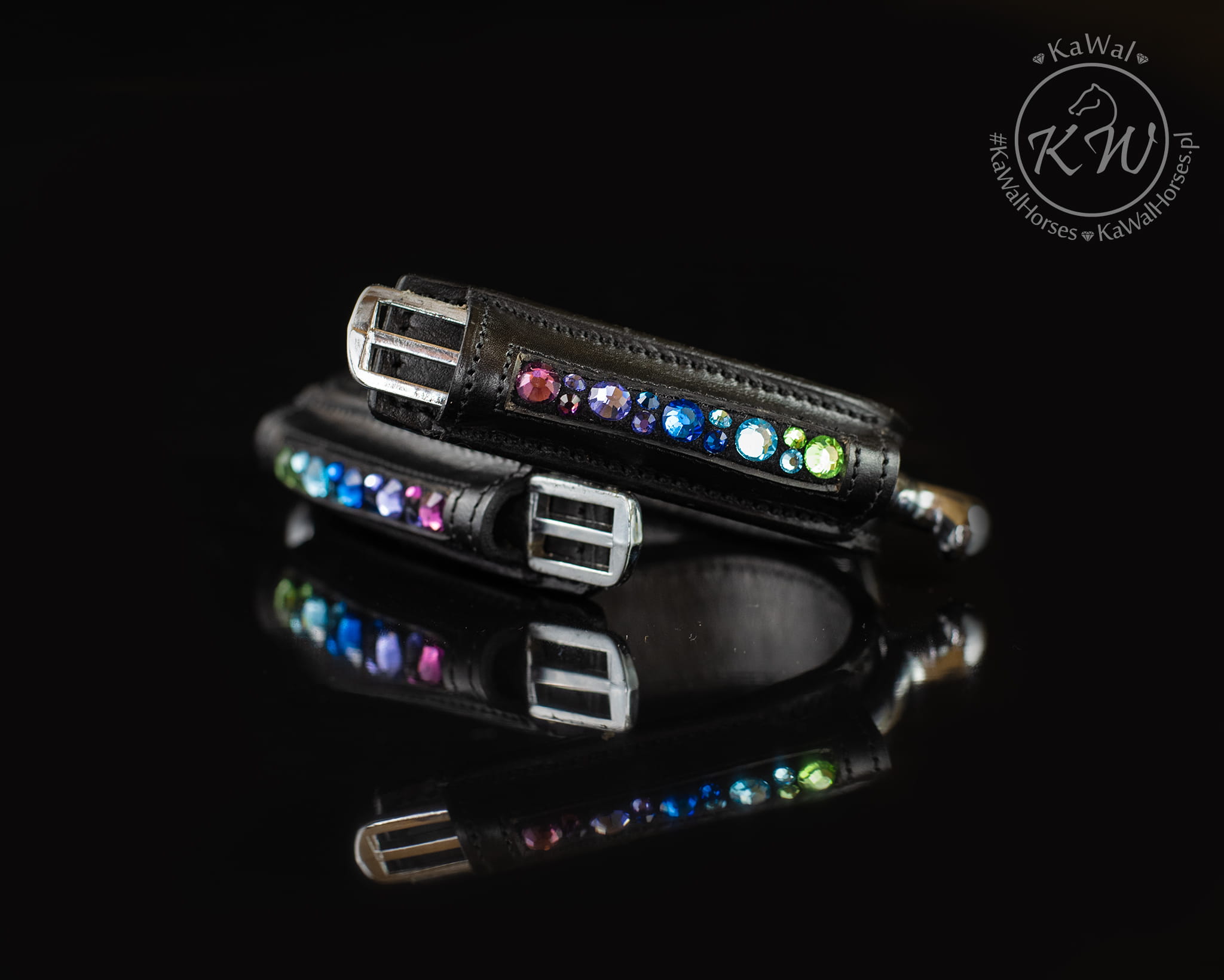 Osłonki na ostrogi, chroniące buty przed otarciami, wykonane z czarnej skóry, ozdobione delikatnymi, kolorowymi kryształkami.