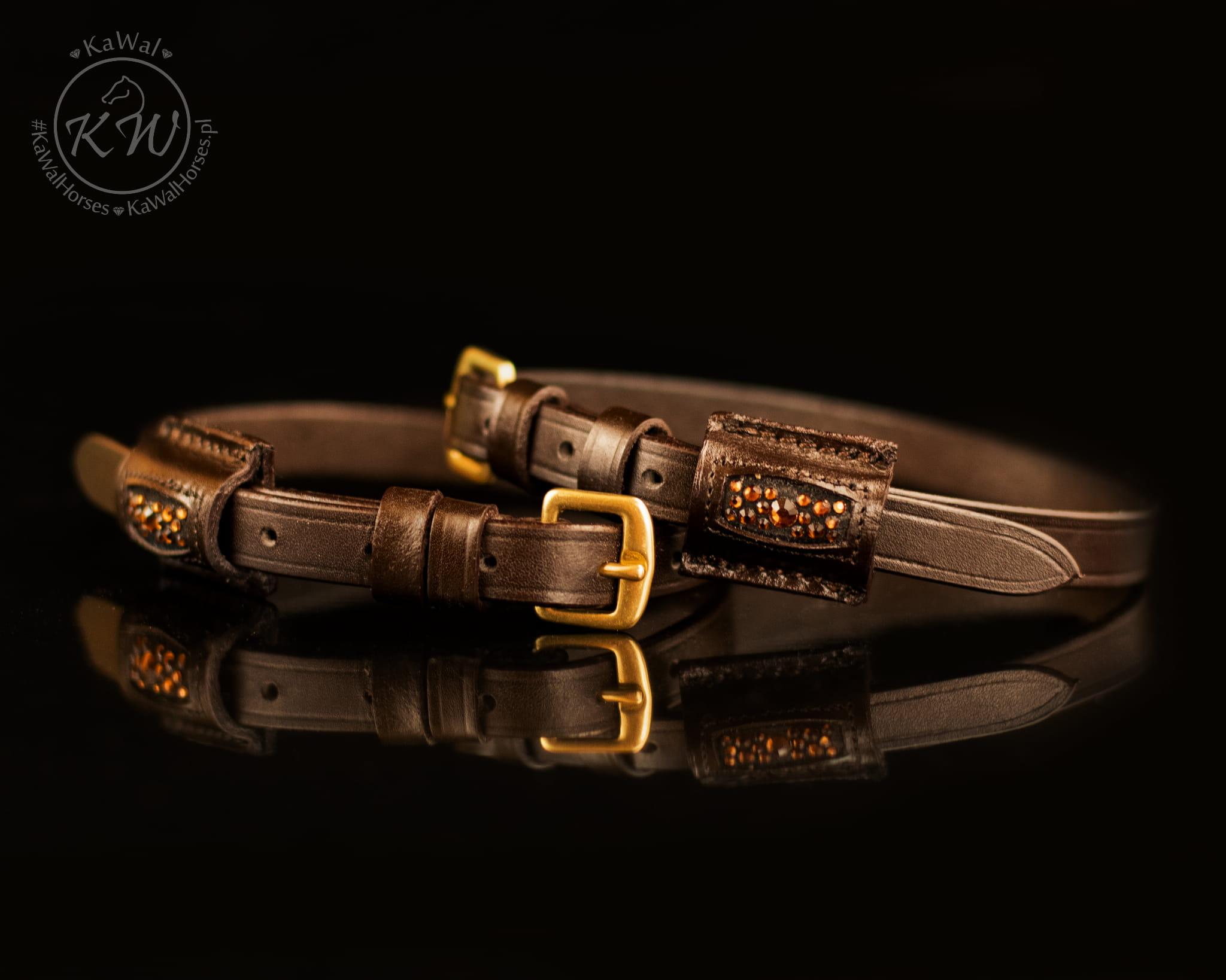 Paski do ostróg wykonane z ciemnobrązowej skóry, ozdobione małymi kryształkami w kolorze bursztynowym.