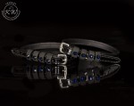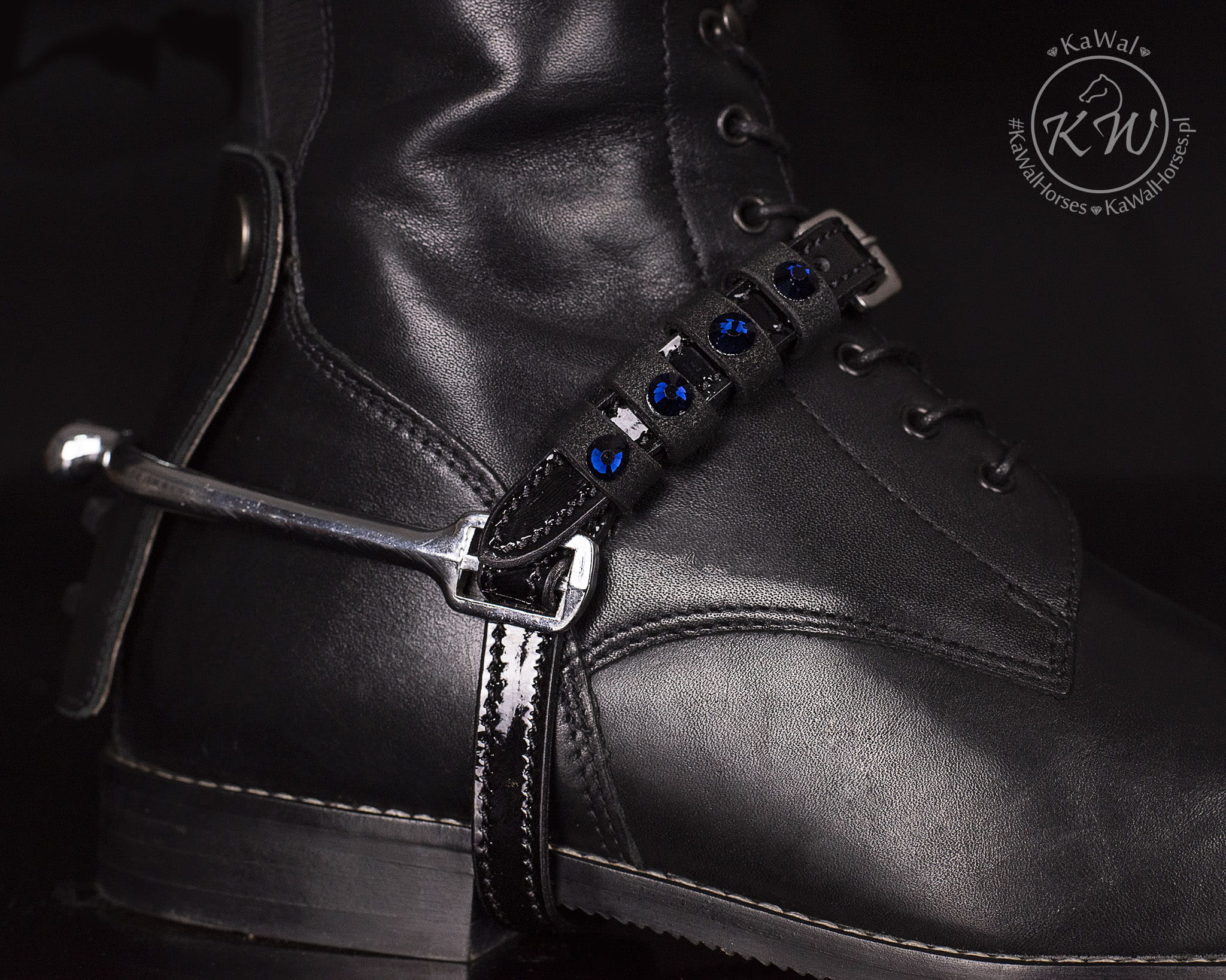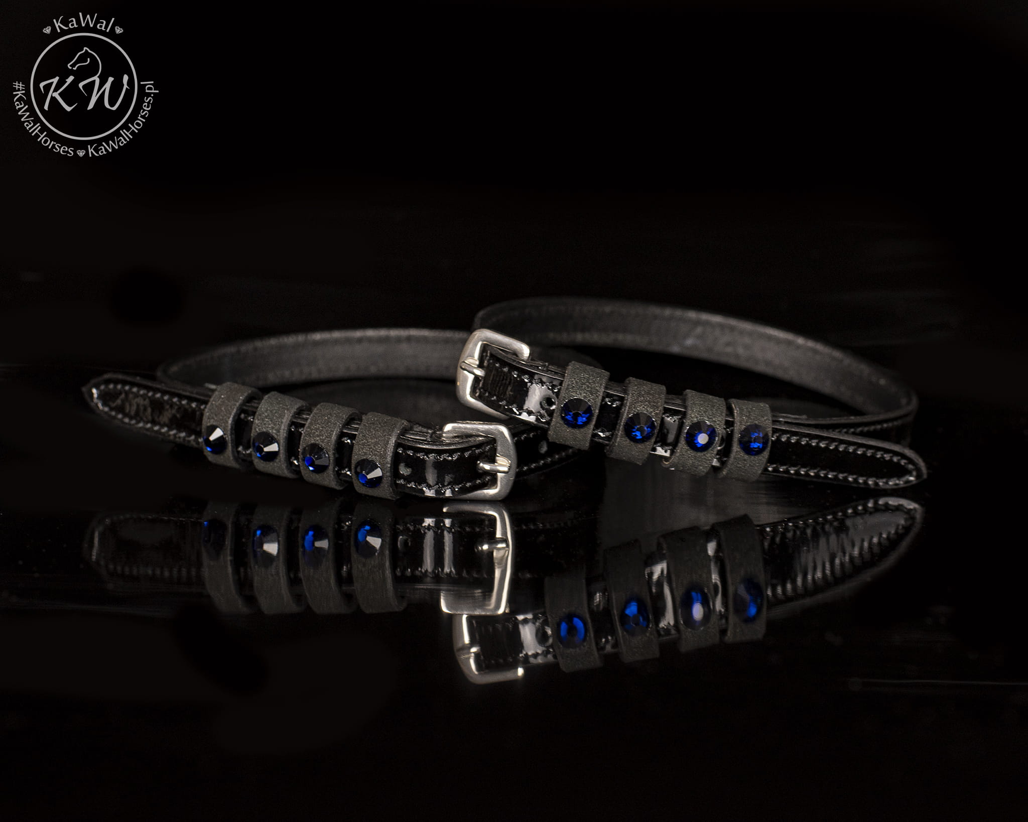 Paski do ostróg wykonane z czarnej, lakierowanej skóry, ozdobione czterema szlufkami z dużym, granatowym kryształkiem w srebrnej oprawce.